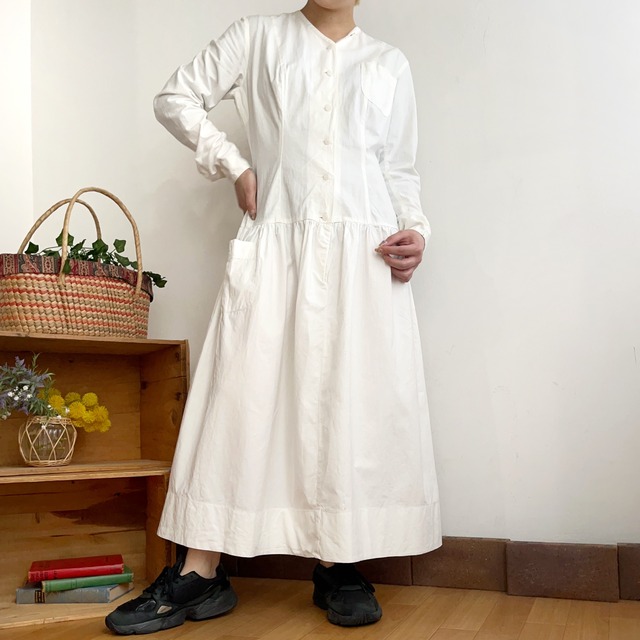 〜商品説明〜 サイズ【平置き】 肩幅 39㎝ 身幅 50㎝ 袖丈 57.5㎝ ウエストライン 47.5㎝ 着丈 121.5㎝ モデル身長 155㎝ 素材 表記がないため詳細不明、恐らくコットン 状態 古いお品の為、シミが多数ございます。 お写真にてしっかりとご確認お願いします。 背中に黄ばみがございます。 産地 説明 ローウエストなデザインが珍しい40年代頃のワンピースです。 古いコットン特有のガシッとした質感に、脇下は布が二重になっていたり、大きめのポケットが付いていて恐らくワーク系で使われていたお洋服かと思われます。 ベスト等とレイヤードしたり、ボタンを開けてTシャツ等のインナーをチラッと見せてあげたりしても可愛いかと◎ -注意- 店頭販売が優先となりますので販売済みとなる場合がございます。 その場合は通販での販売は致しかねますのでご了承下さい。 当店の商品は全てUsedとなりますので使用感 等個人差のあるダメージが気になる方はご購入をお控え下さい。 商品によっては小傷や擦れ、シミ、破れ等使用感があるものもございます。 -配送について- 日時指定をご希望の場合は必ず【佐川急便】での配送をご指定してください。