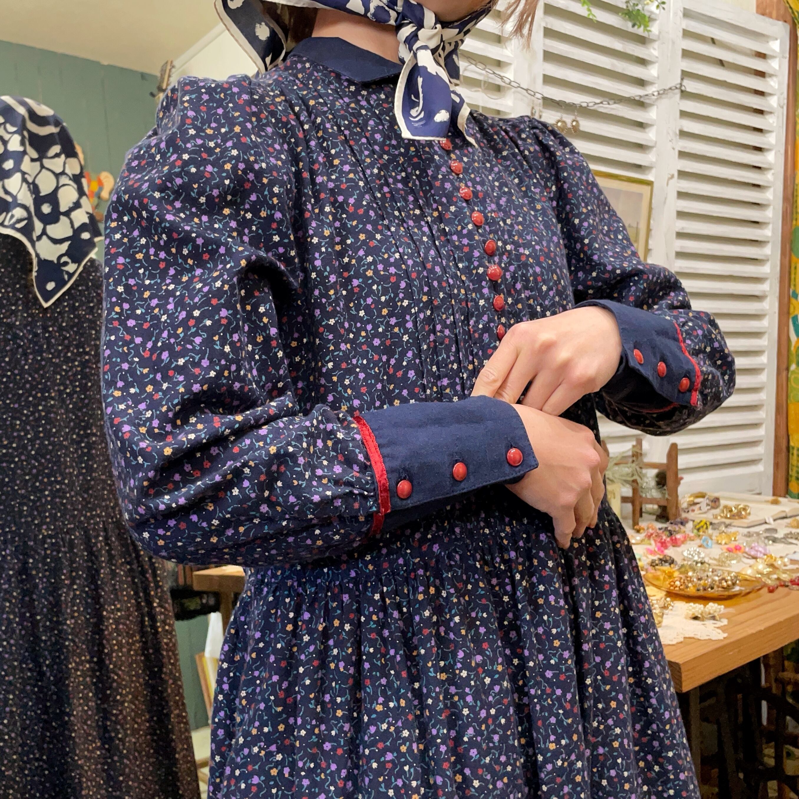 ユーロのワンピースですがネイビーの小花柄にサテンテープが着いていたりとUSAワンピースに近いデザインが面白い1着。