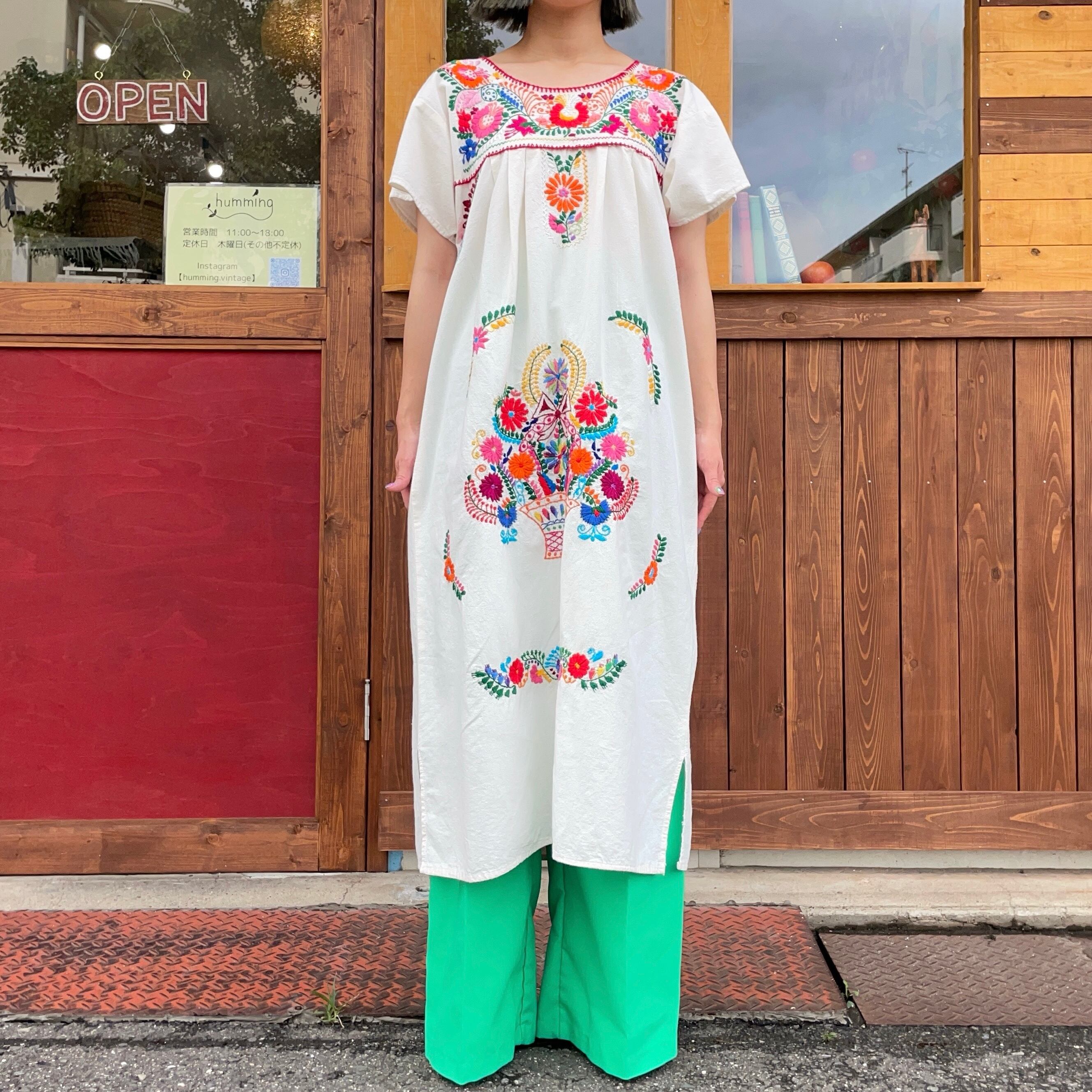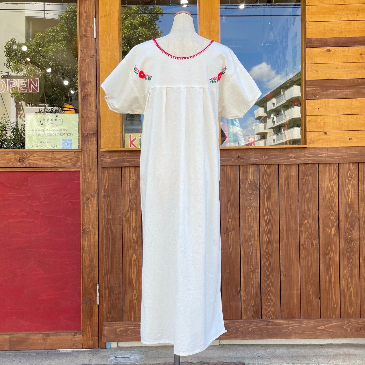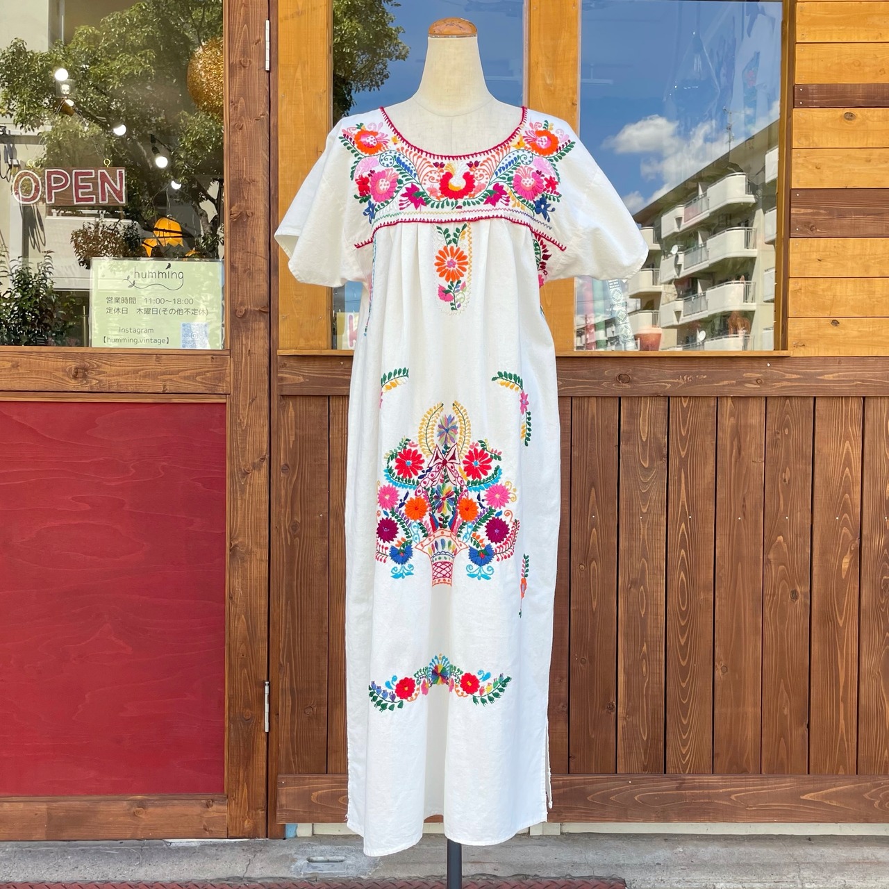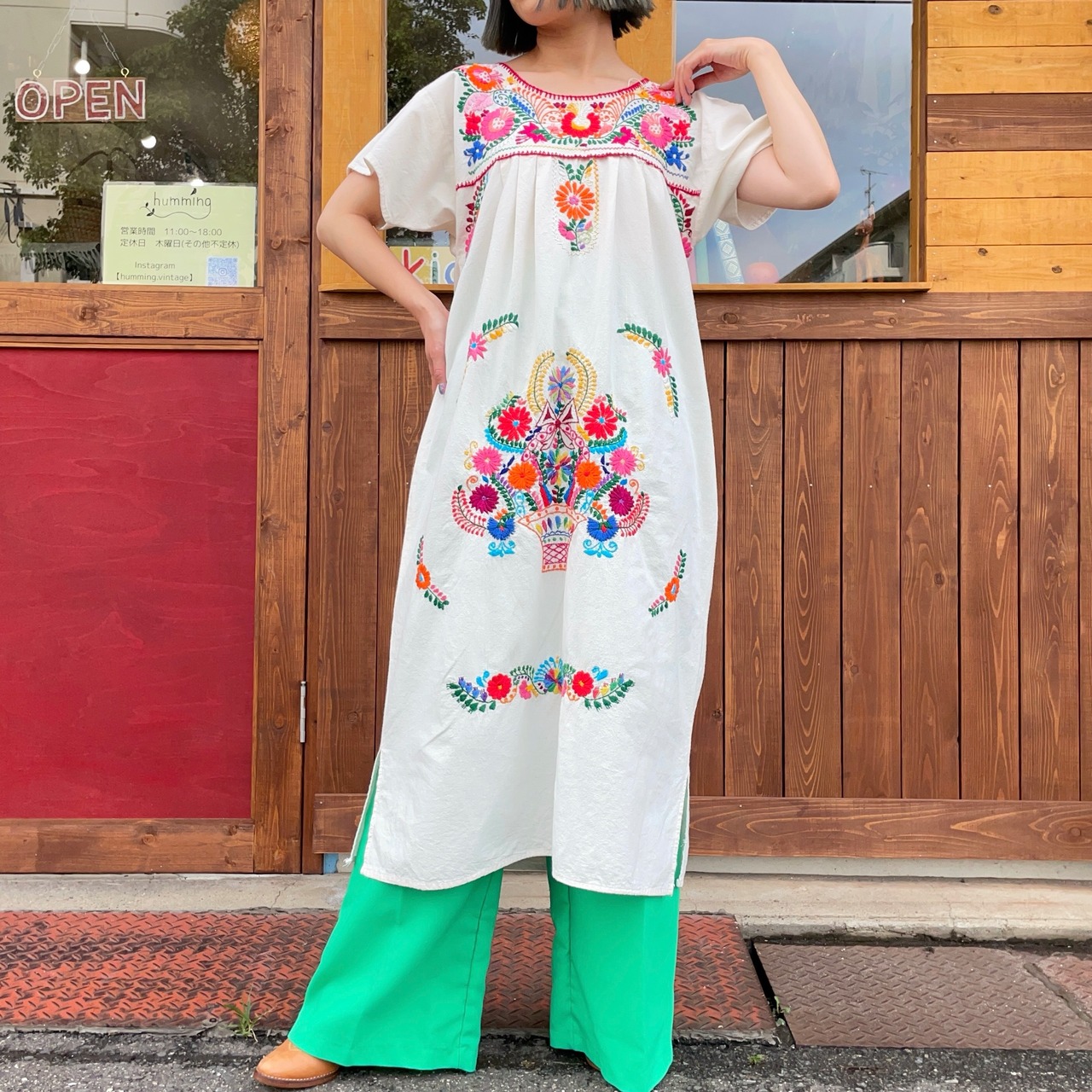 定番カラーですがカラフル刺繍たっぷりなホワイトのメキシコ刺繍ワンピースです。