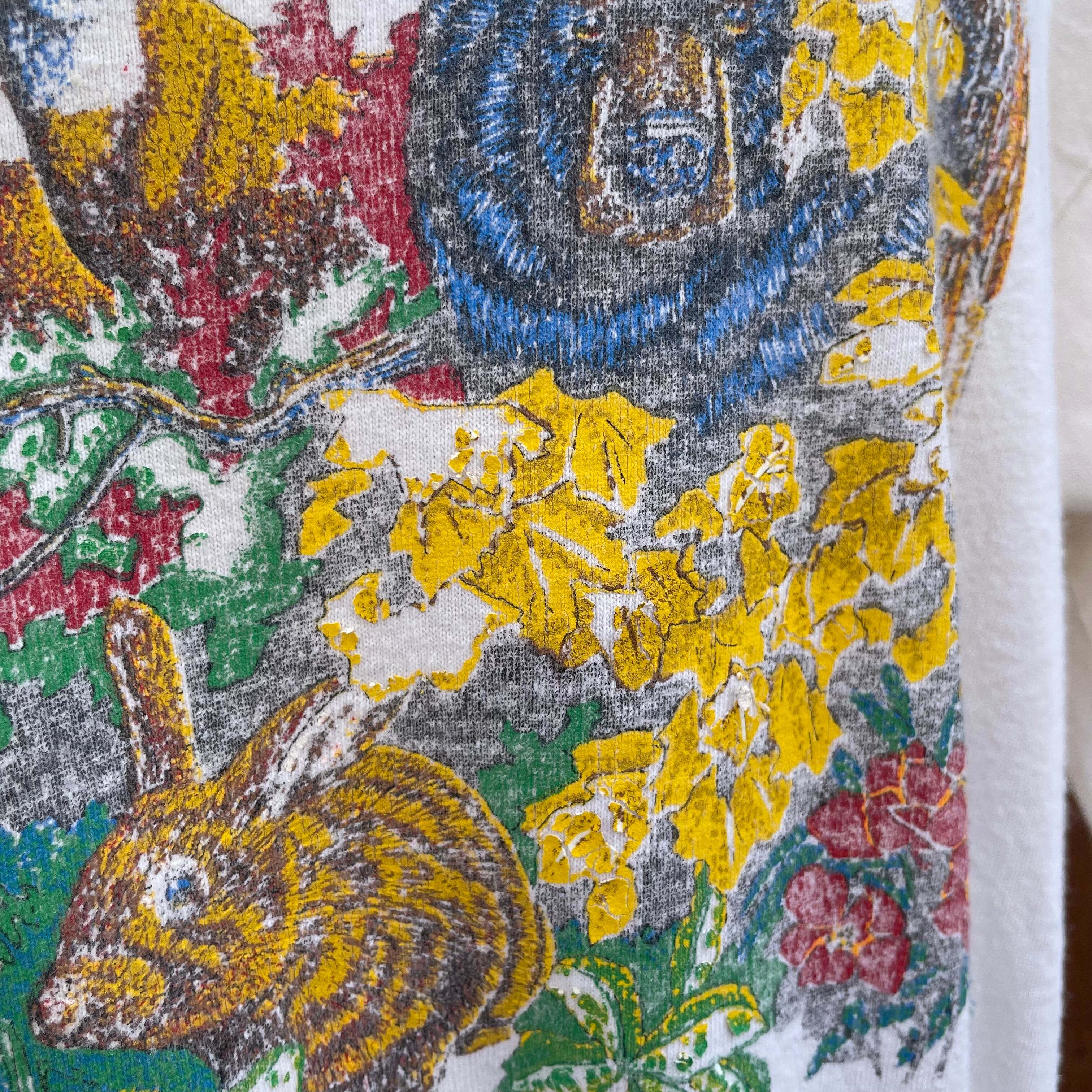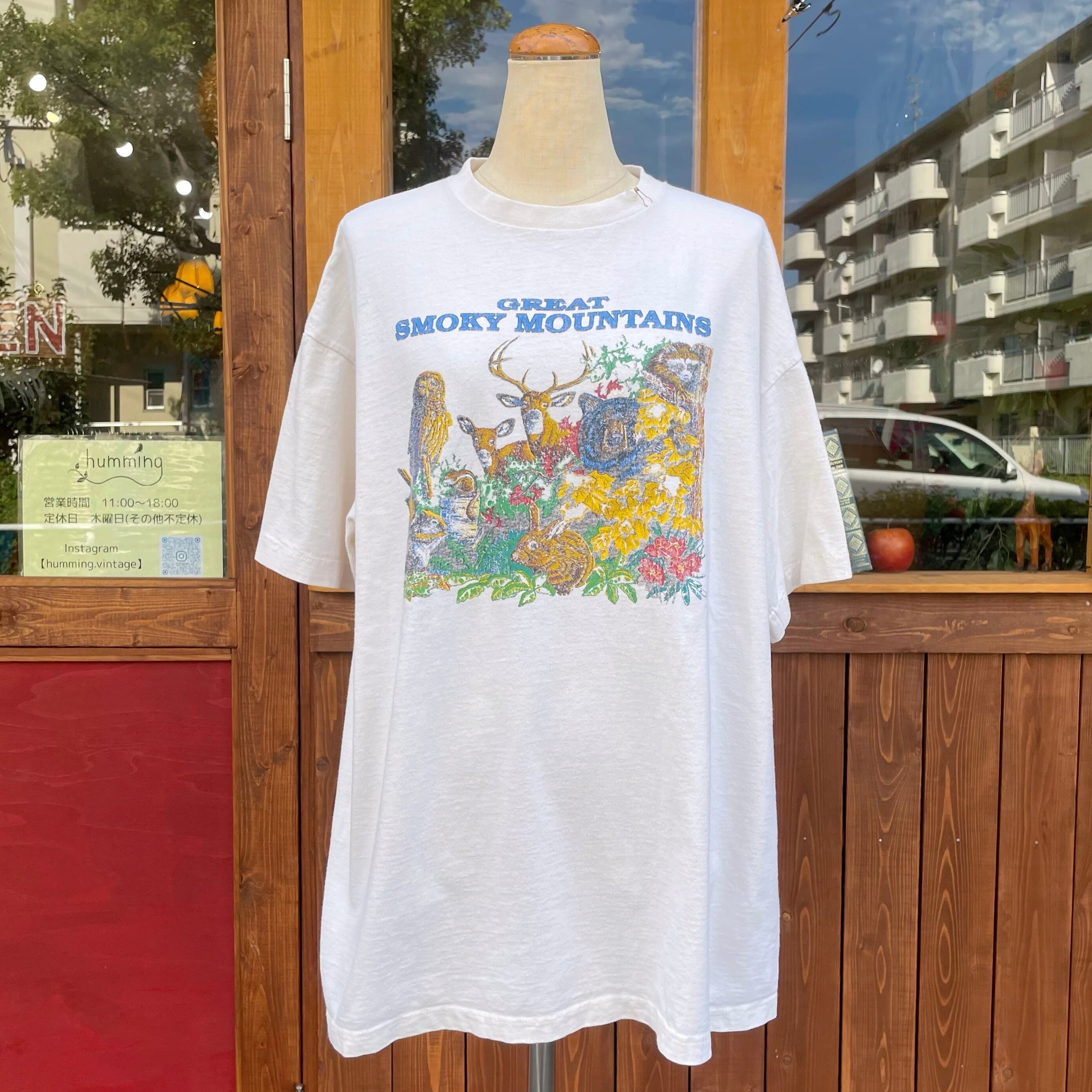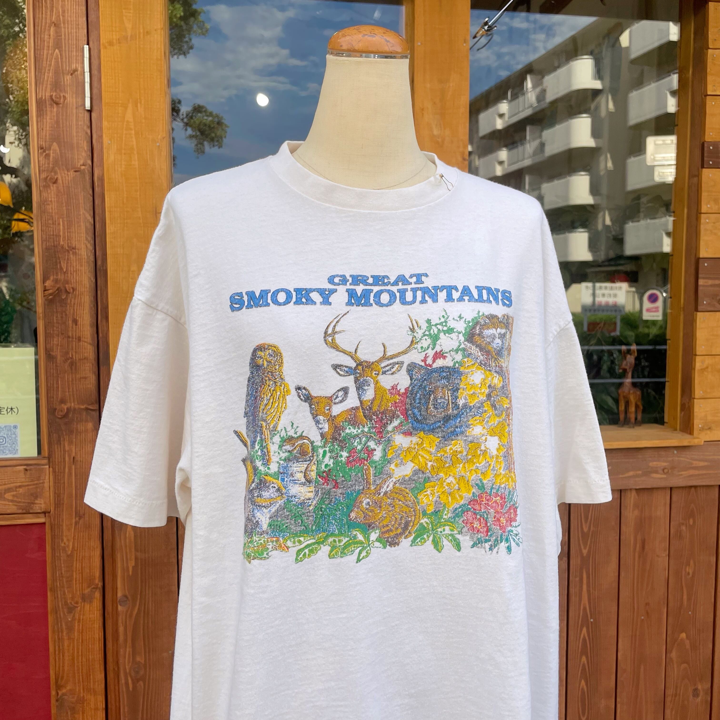ガシッと肉厚ボティなコットンTにスモーキーマウンテンに生息する動物たちがプリントされた可愛いデザインです。