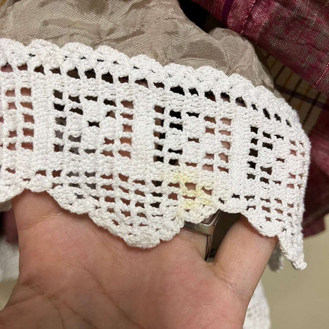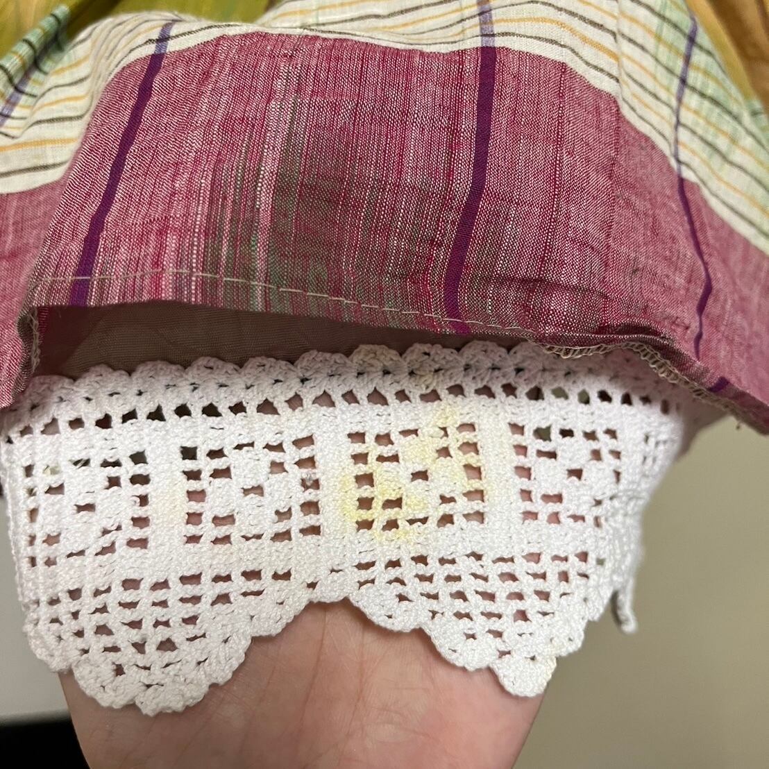 スカート裾のクロシェ部分にシミや黄ばみがございます。