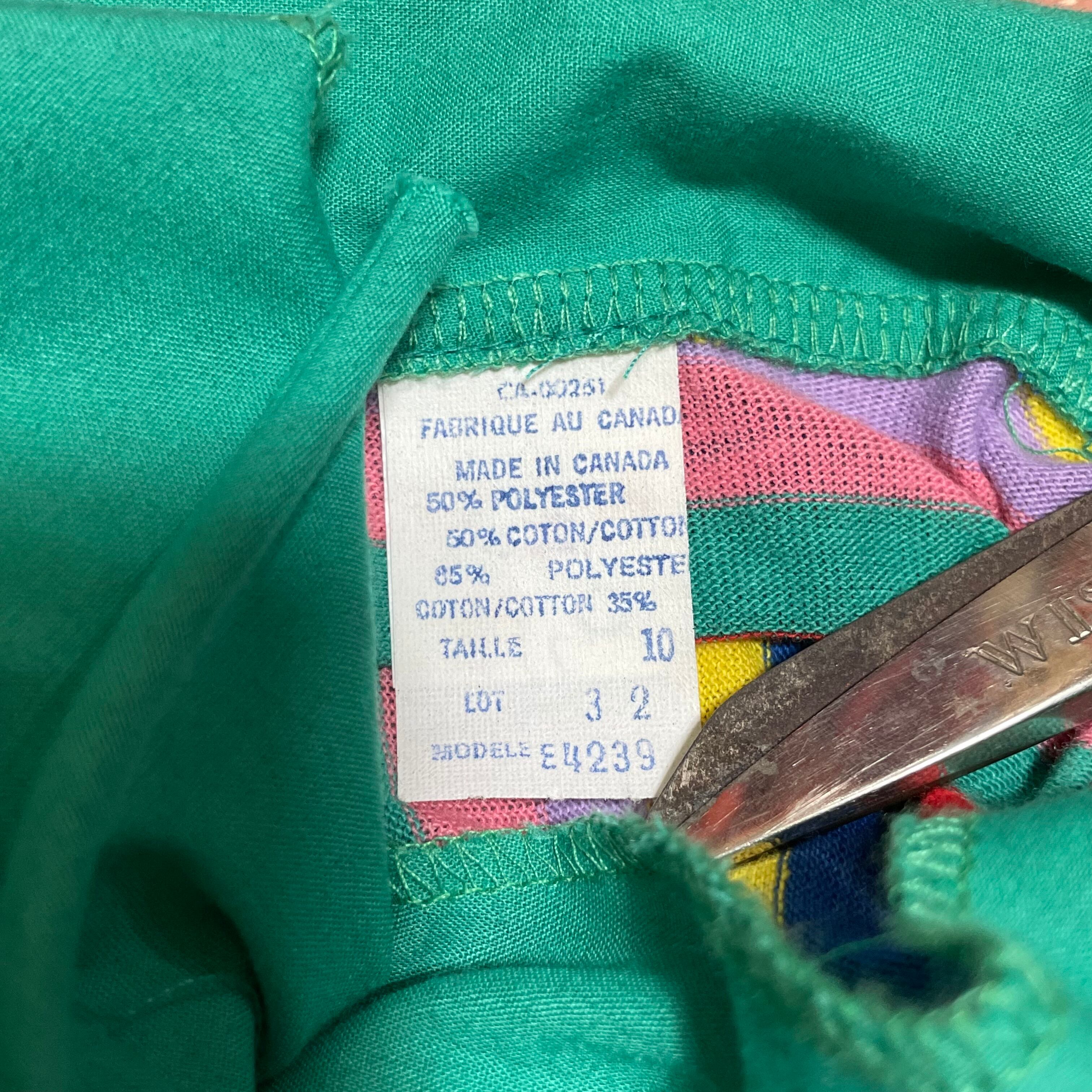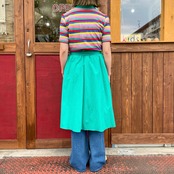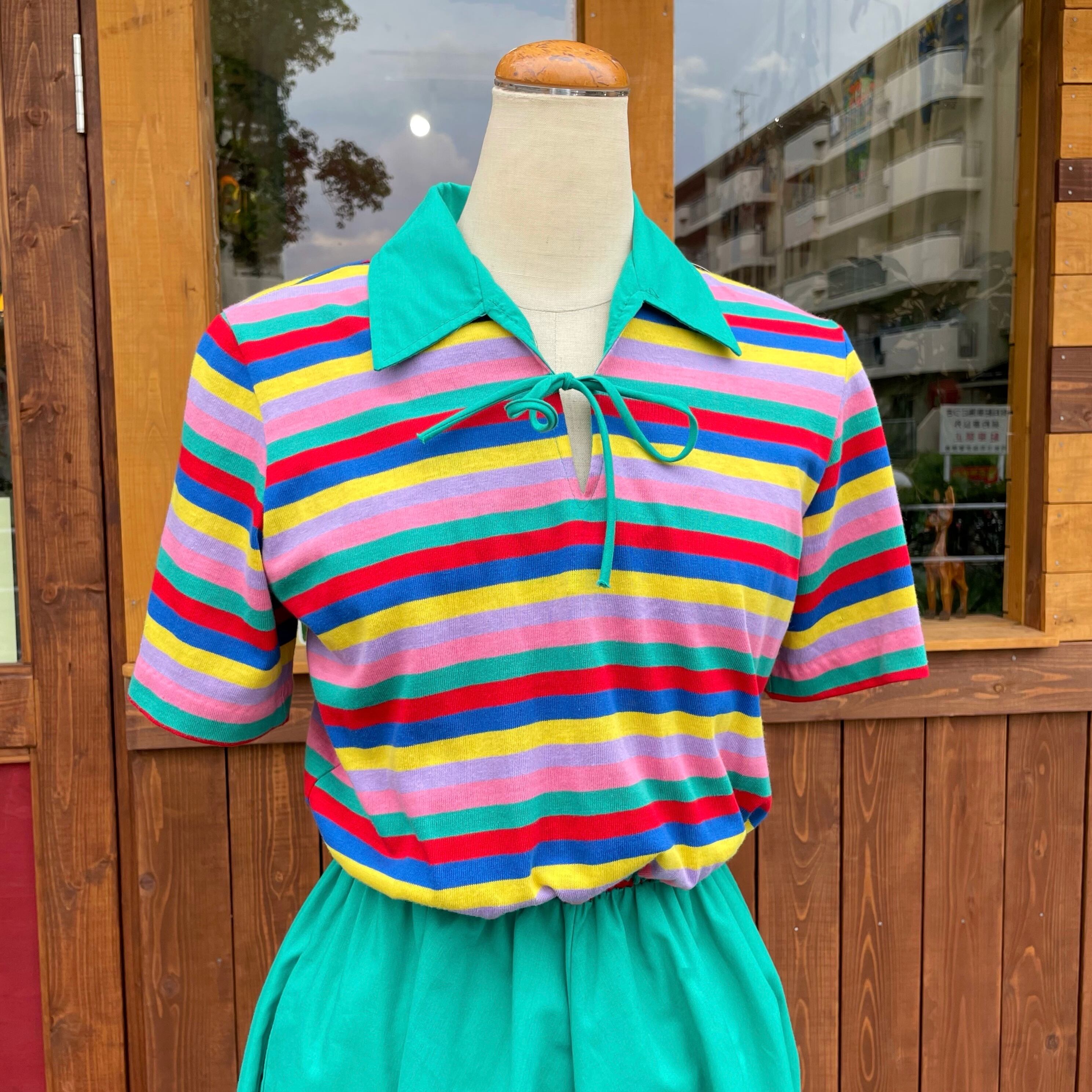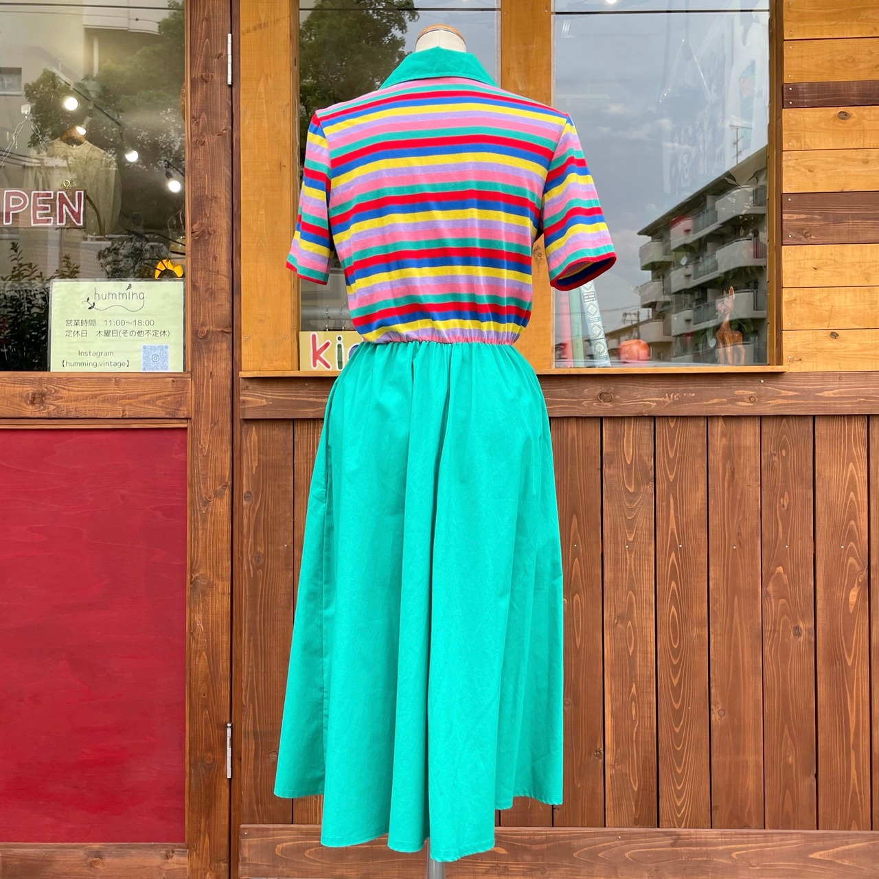 カラフルなマルチストライプにグリーンのスカートがポップで可愛いワンピースです。
