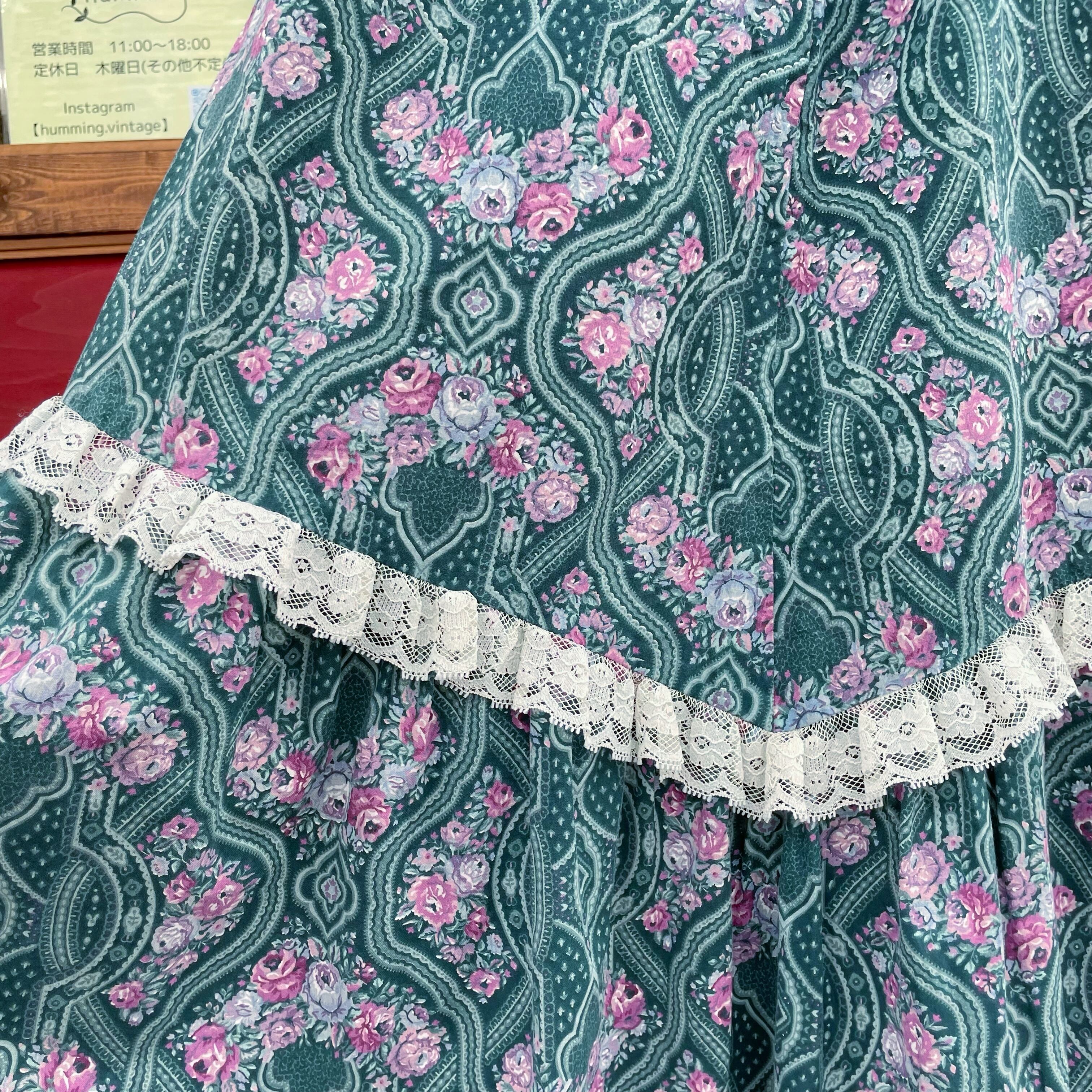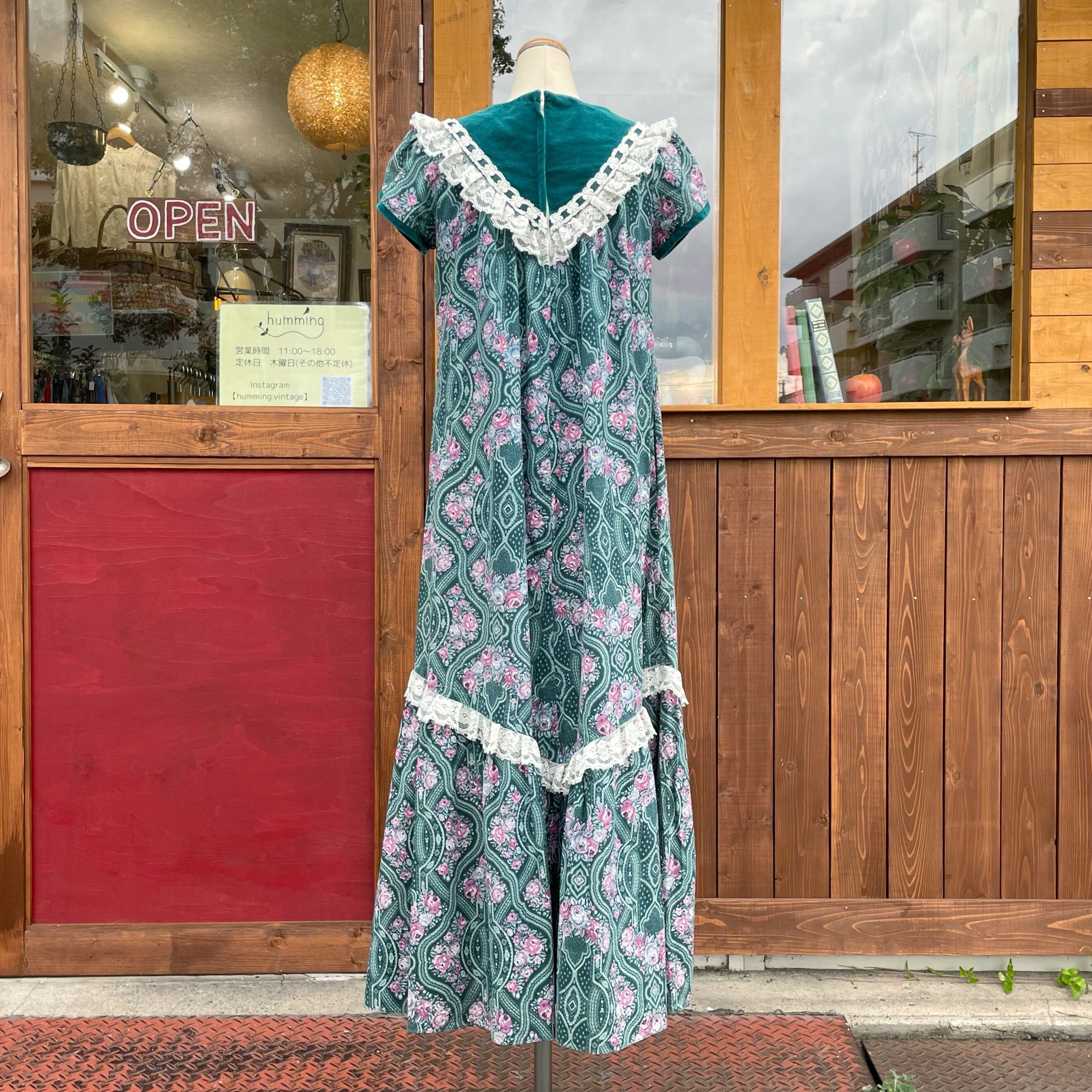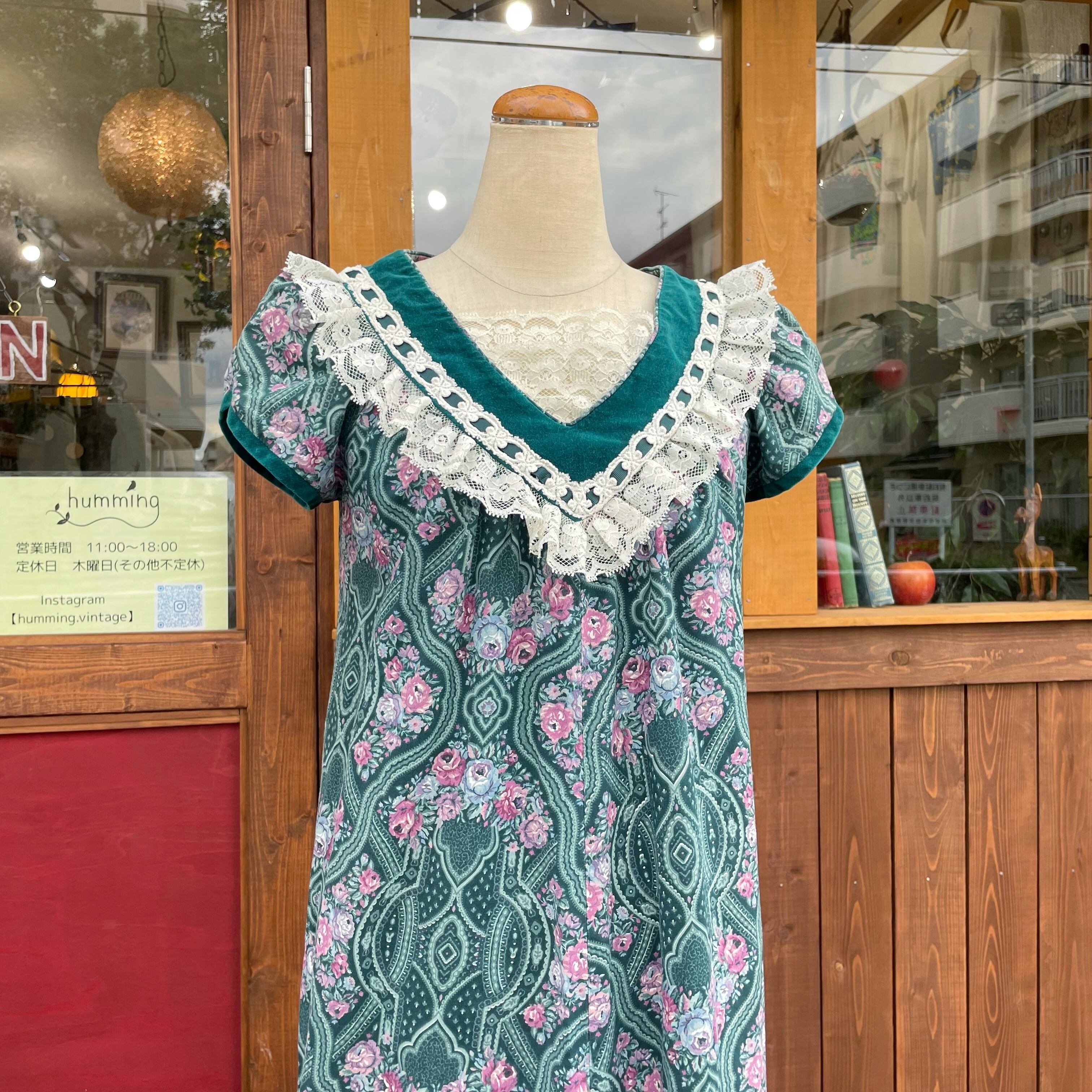 グリーンベースにピンクの花柄が映えるクラシカルなテキスタイルのワンピースです。
