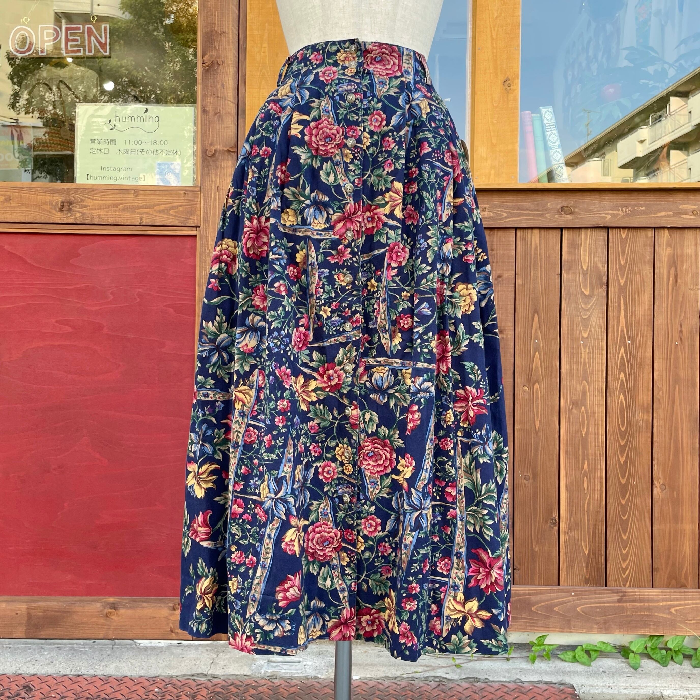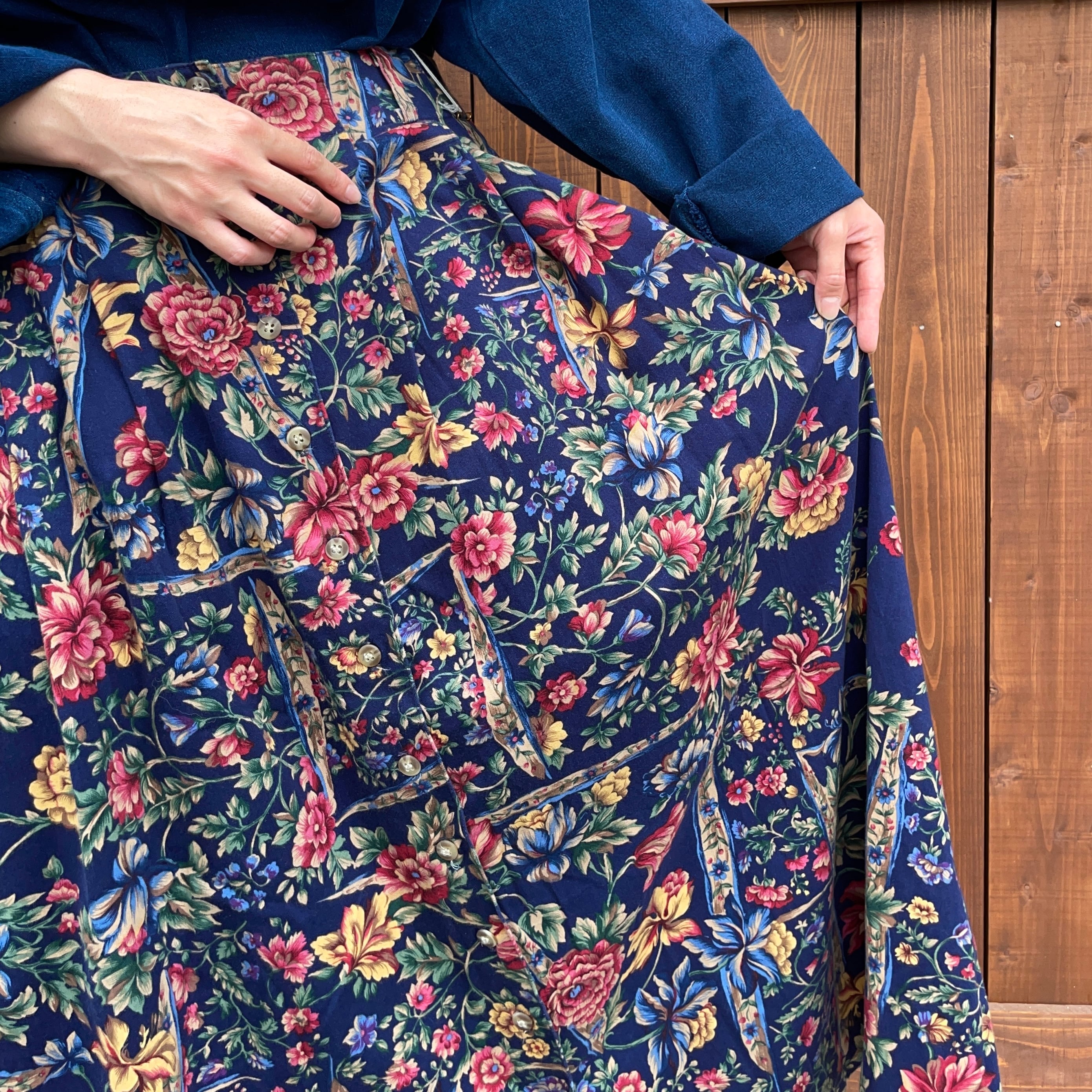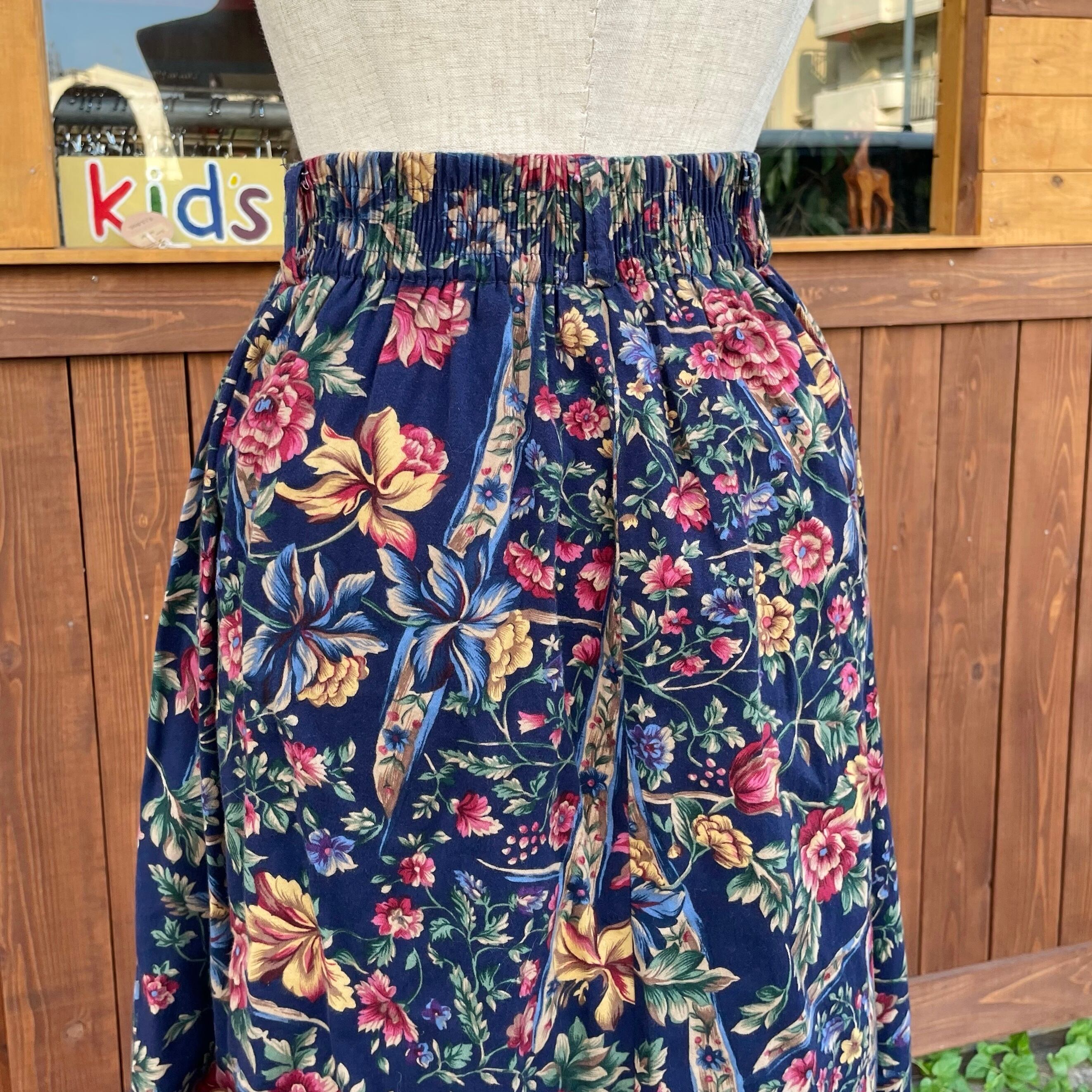 カラフルで色々なお花がデザインされたフレアスカート です。しっかりとした厚手のコットン素材で長く着られる一着。