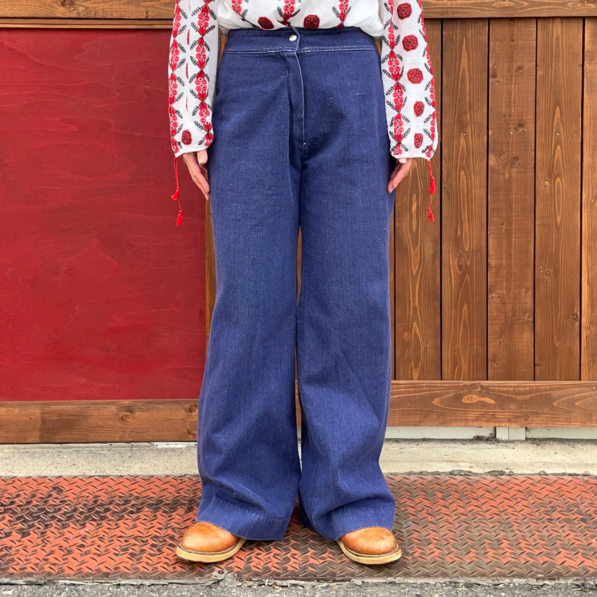 太もも部分からワイドに広がるバギーシルエットで足周りがすっきりと綺麗に見えます。