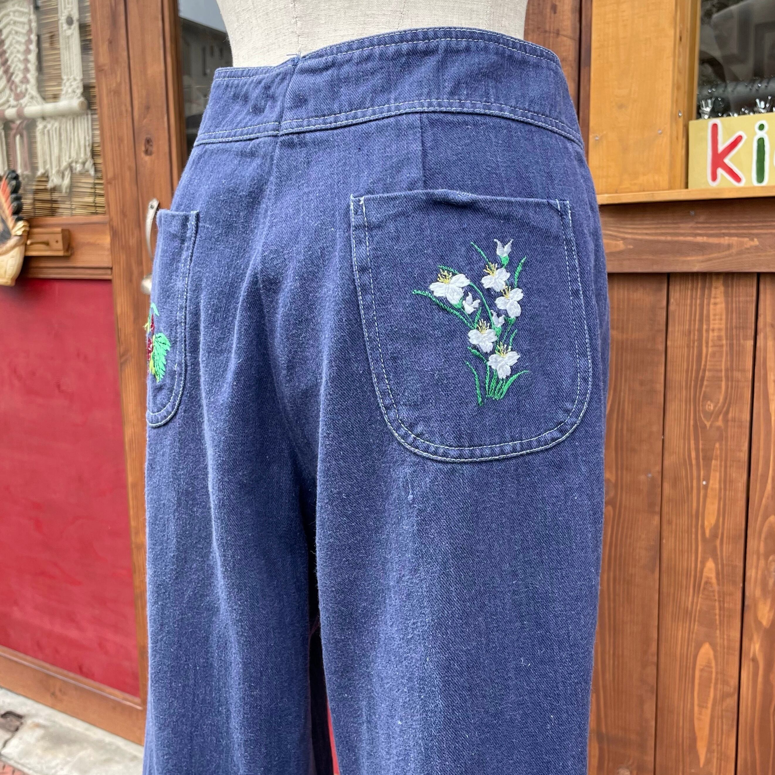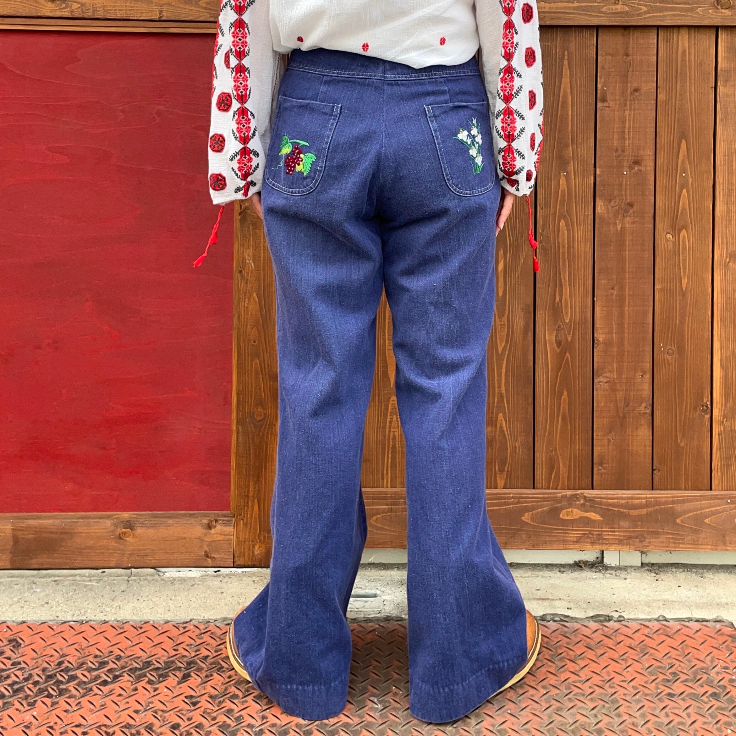 お尻のポケット部分にぶどうとすずらんの刺繍が入ったフレアパンツです。