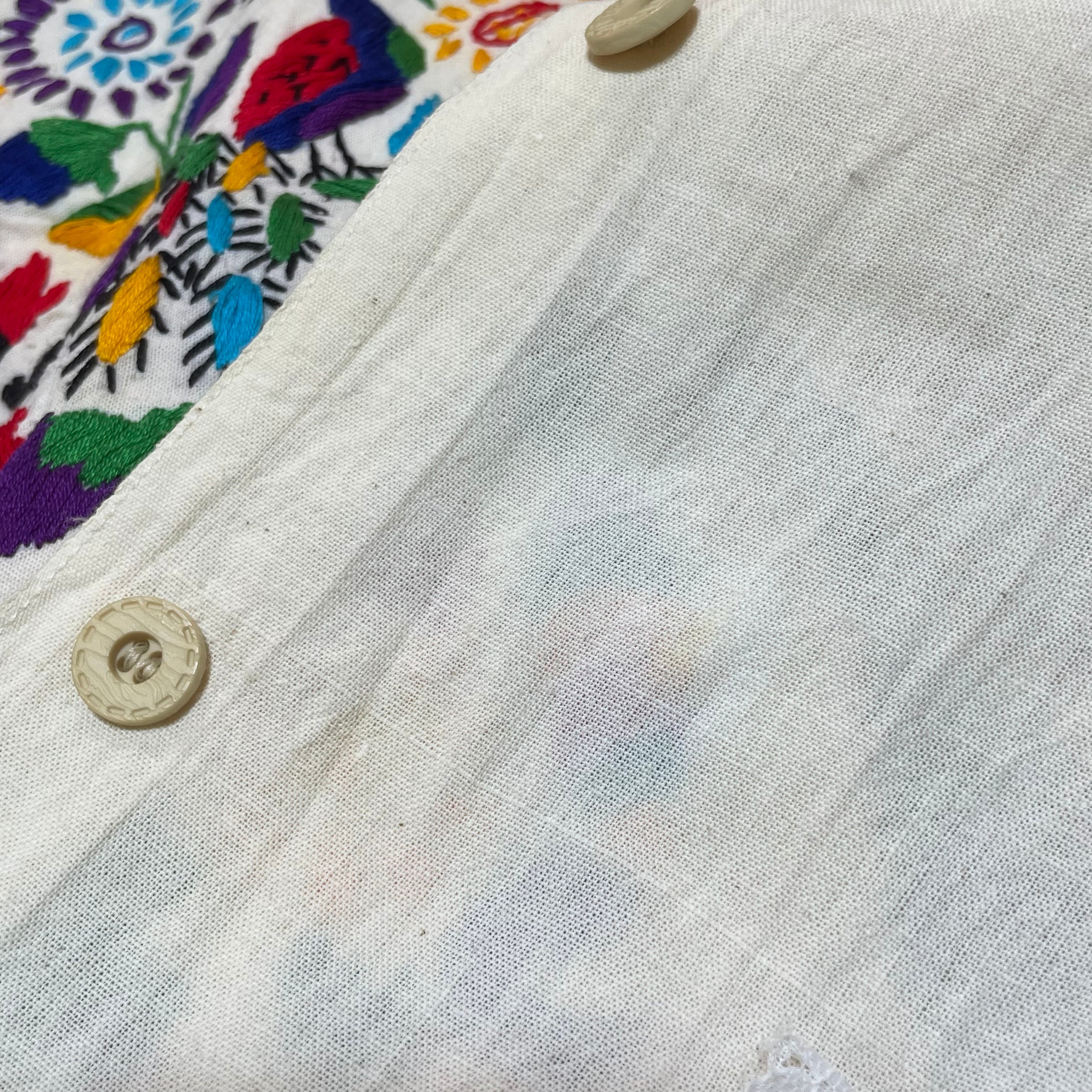 全体的に刺繍の色滲み、薄いシミがございます。(刺繍周り、レース部分、両袖先など)