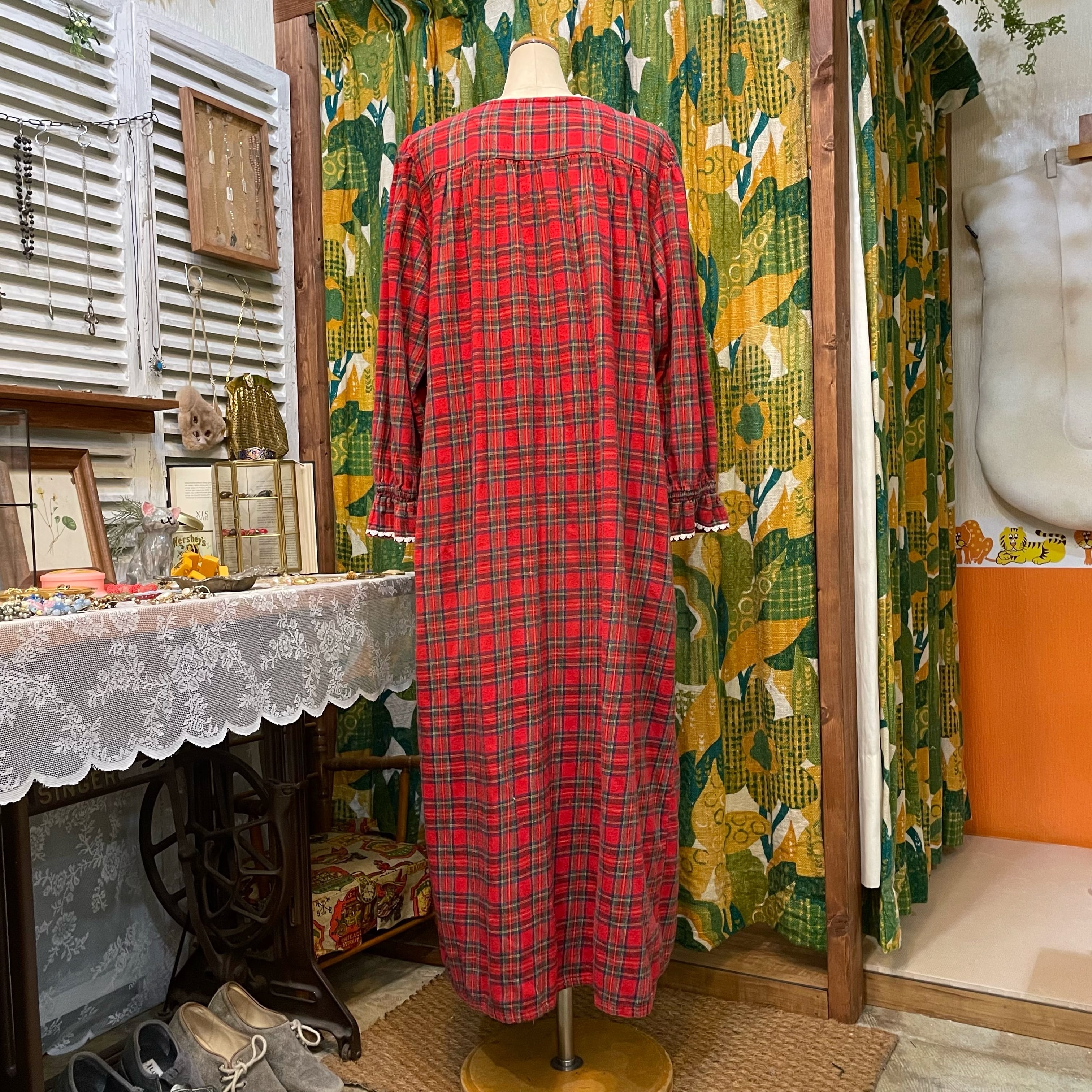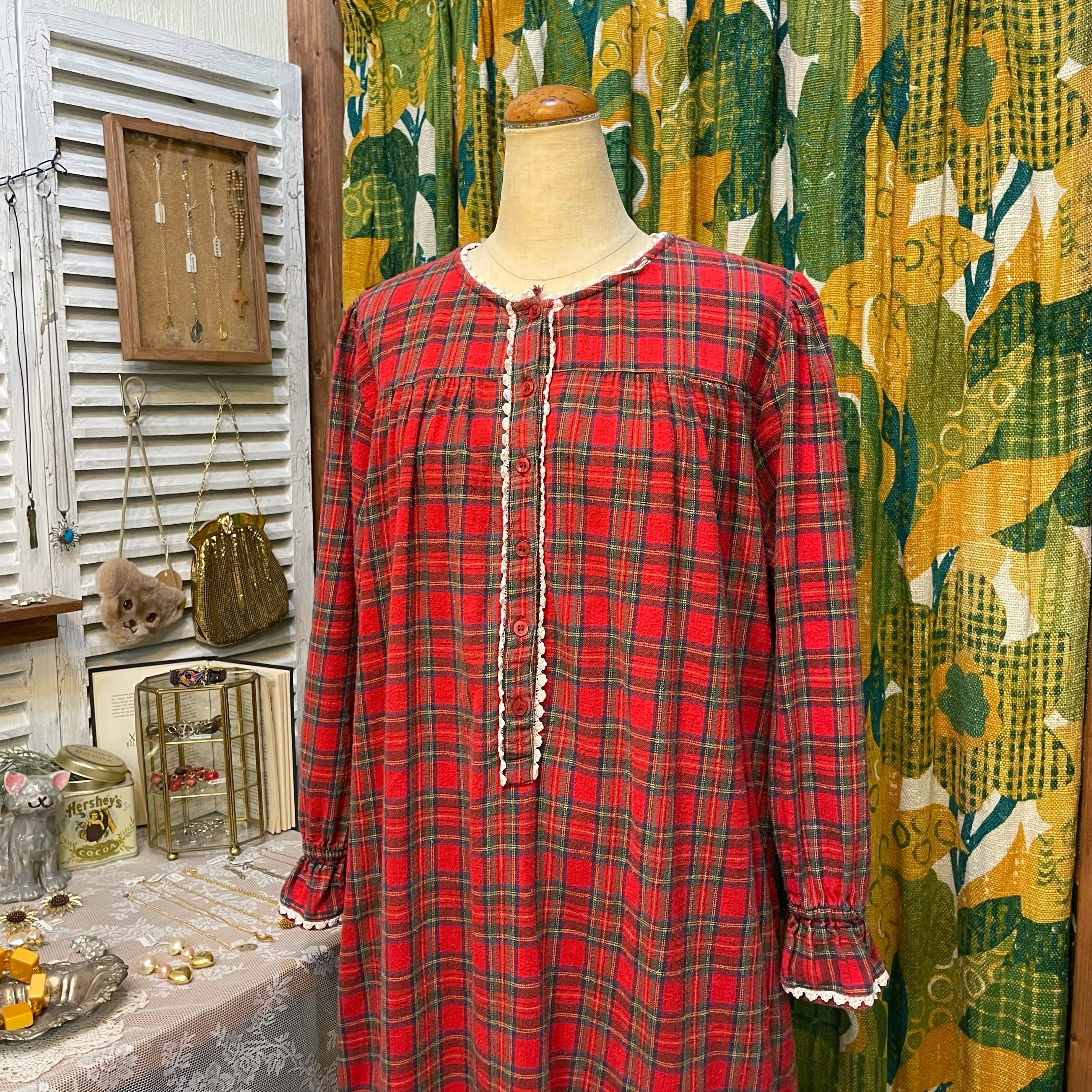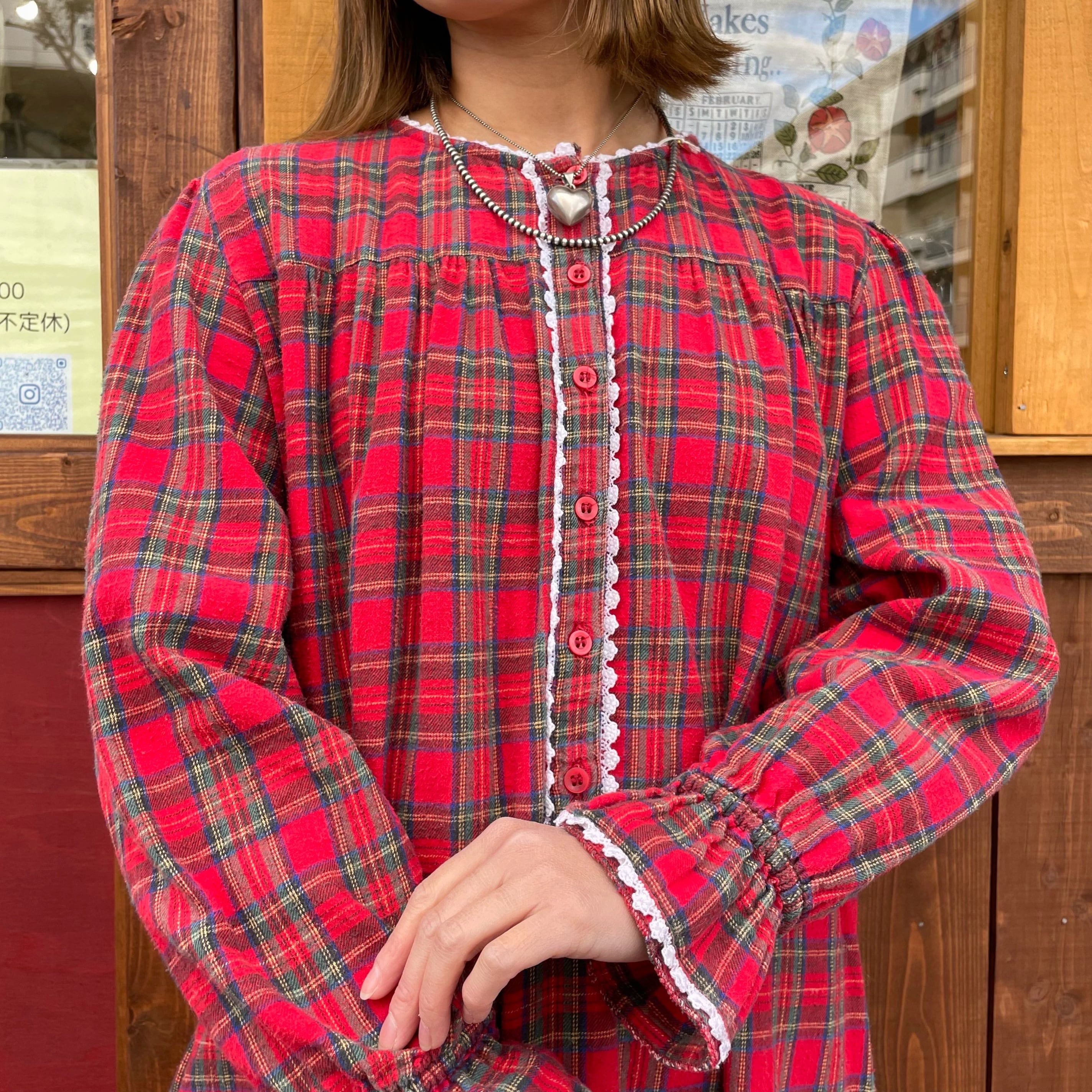 赤チェックに白のレースがくひもとや袖に付いていてガーリーで可愛い雰囲気を出してくれます。