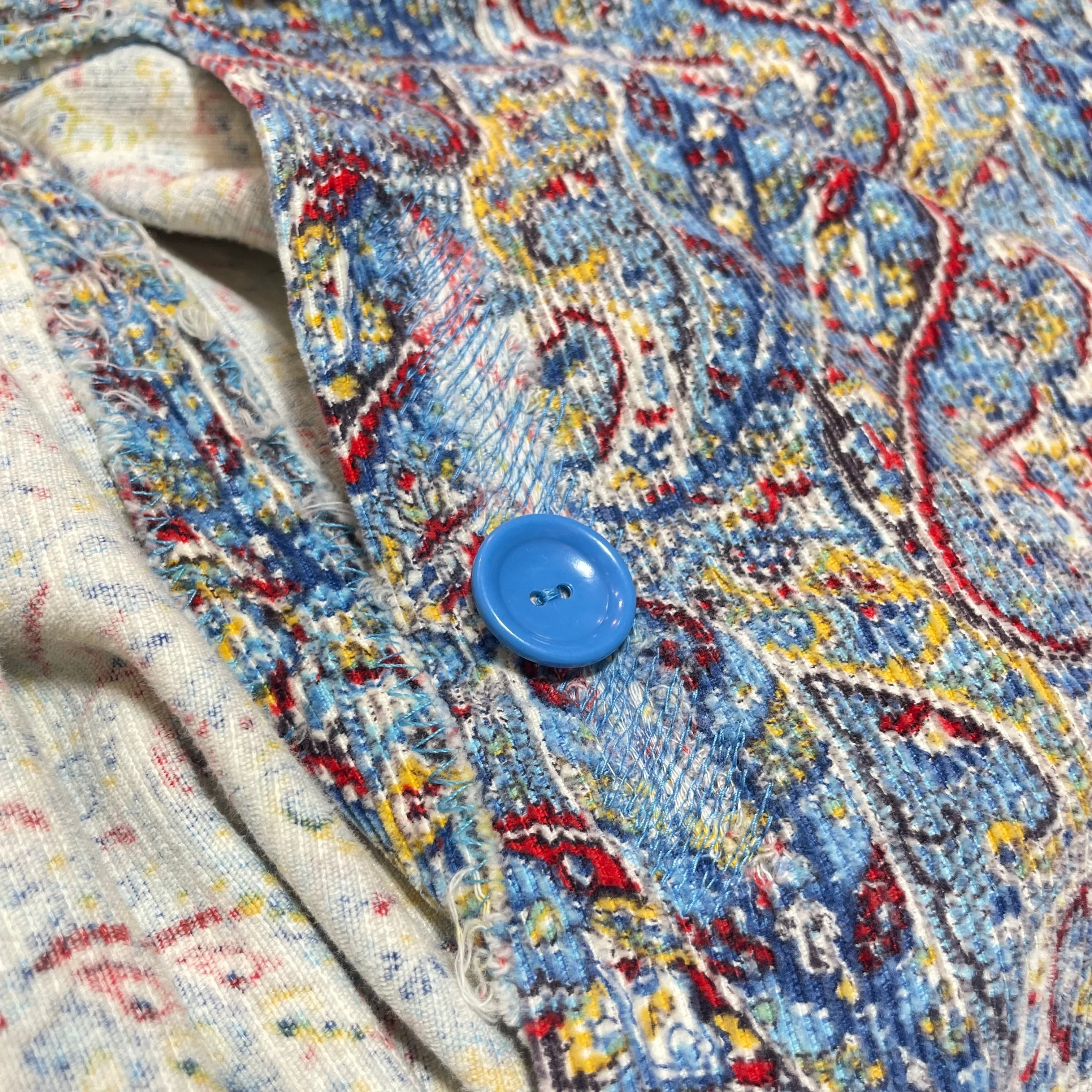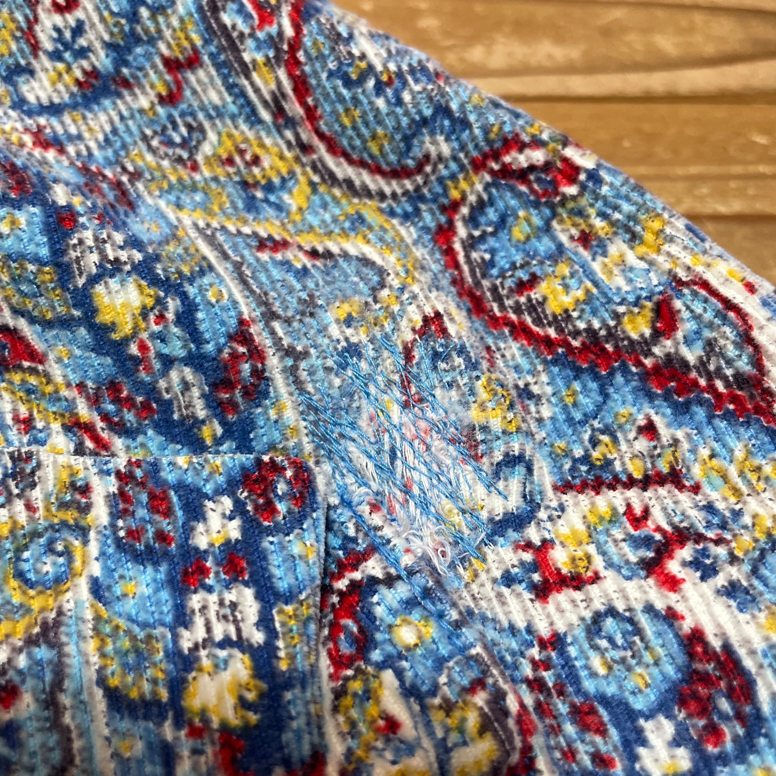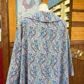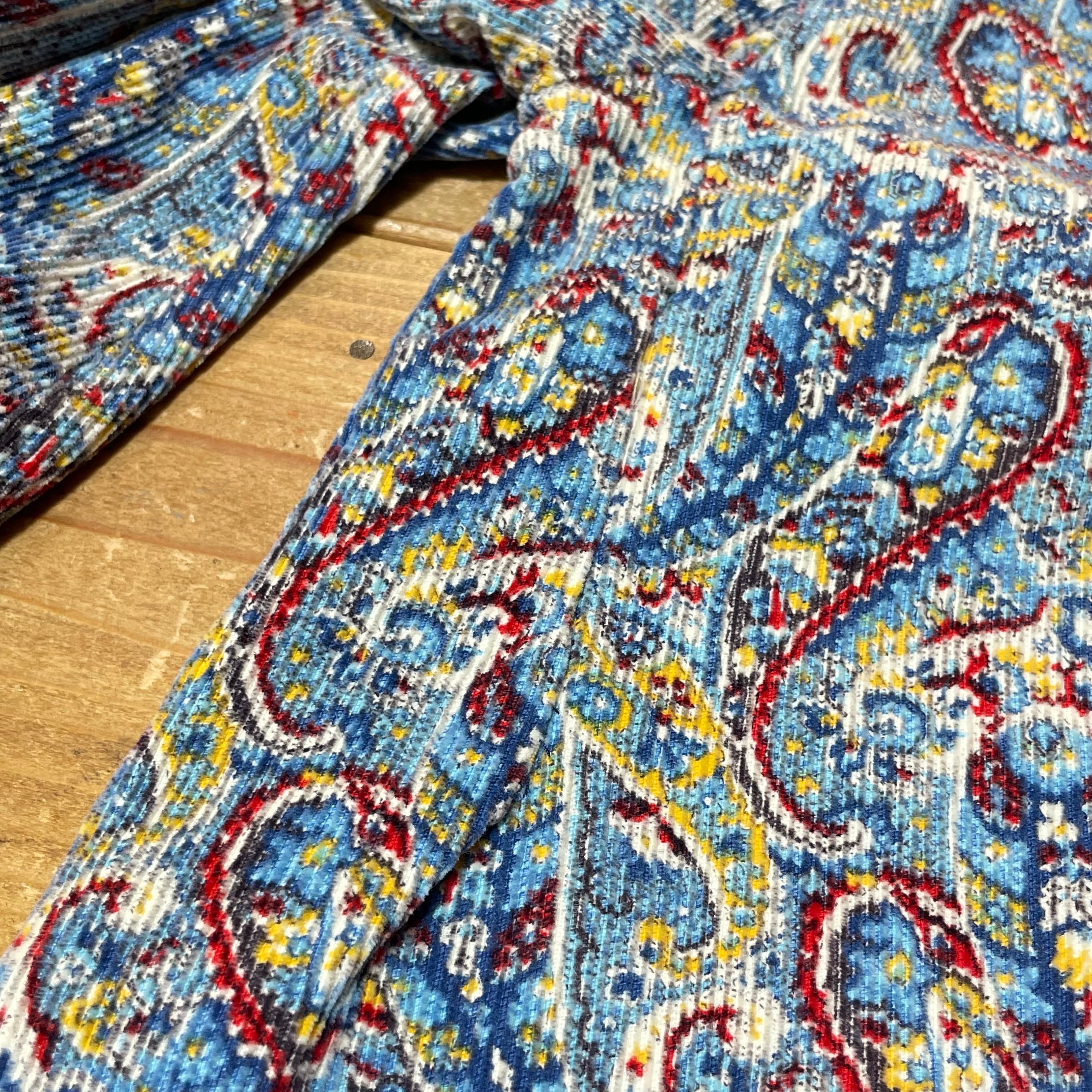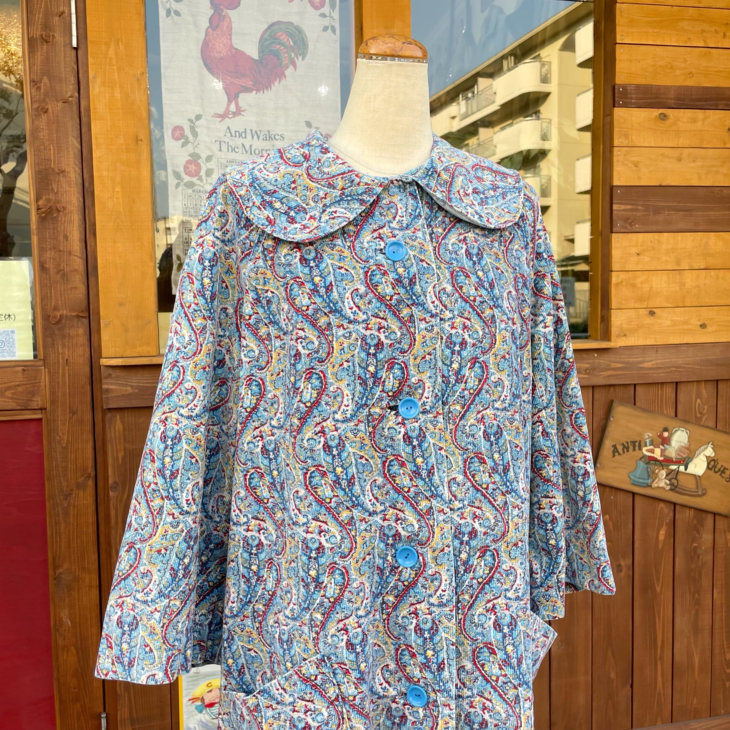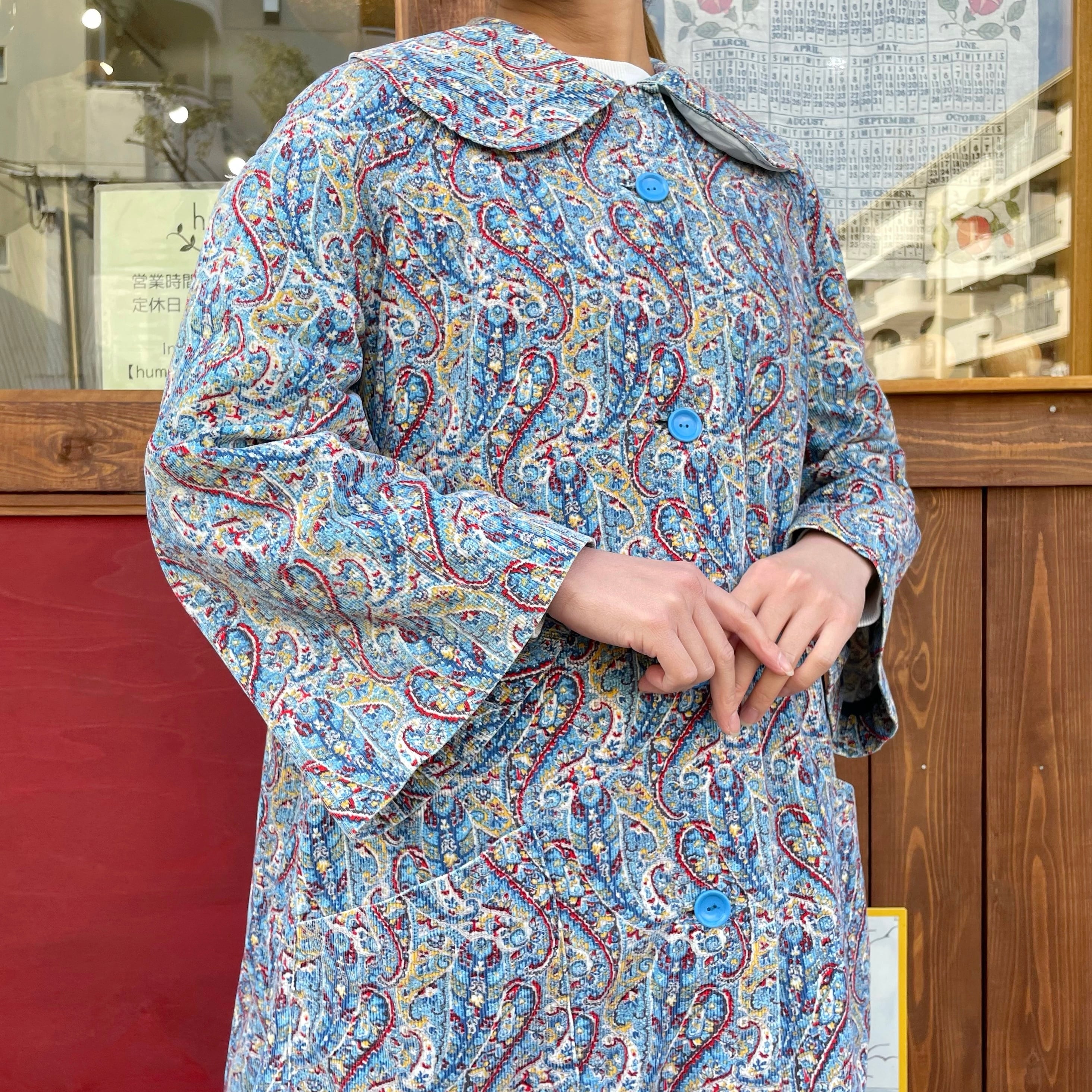 大きな丸襟にペイズリー柄のプリントコーデュロイがインパクトたっぷりな1着。