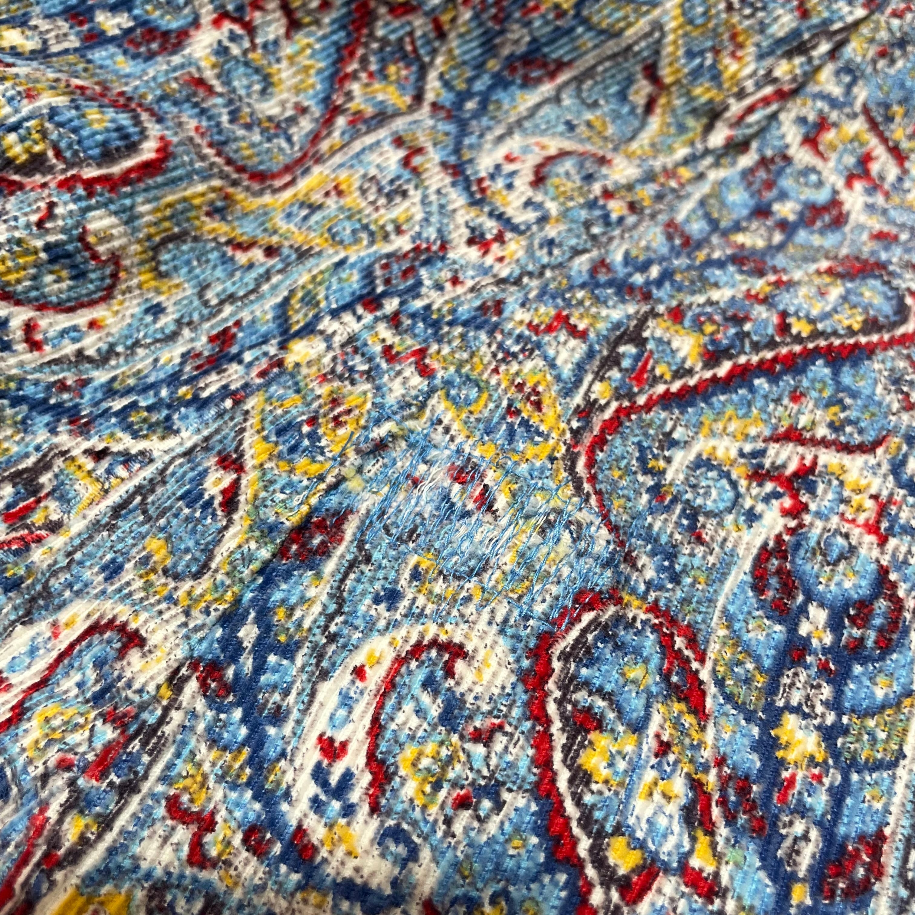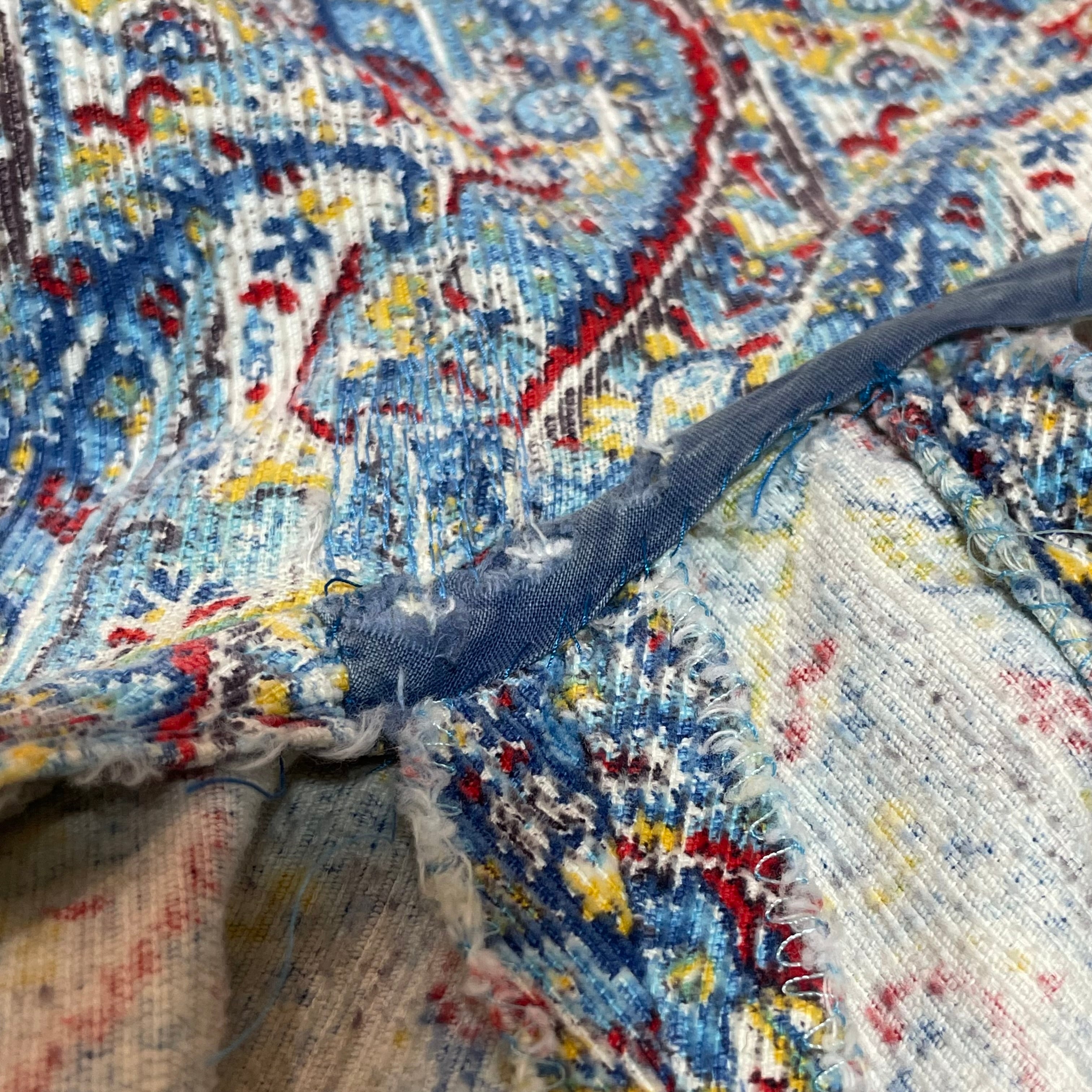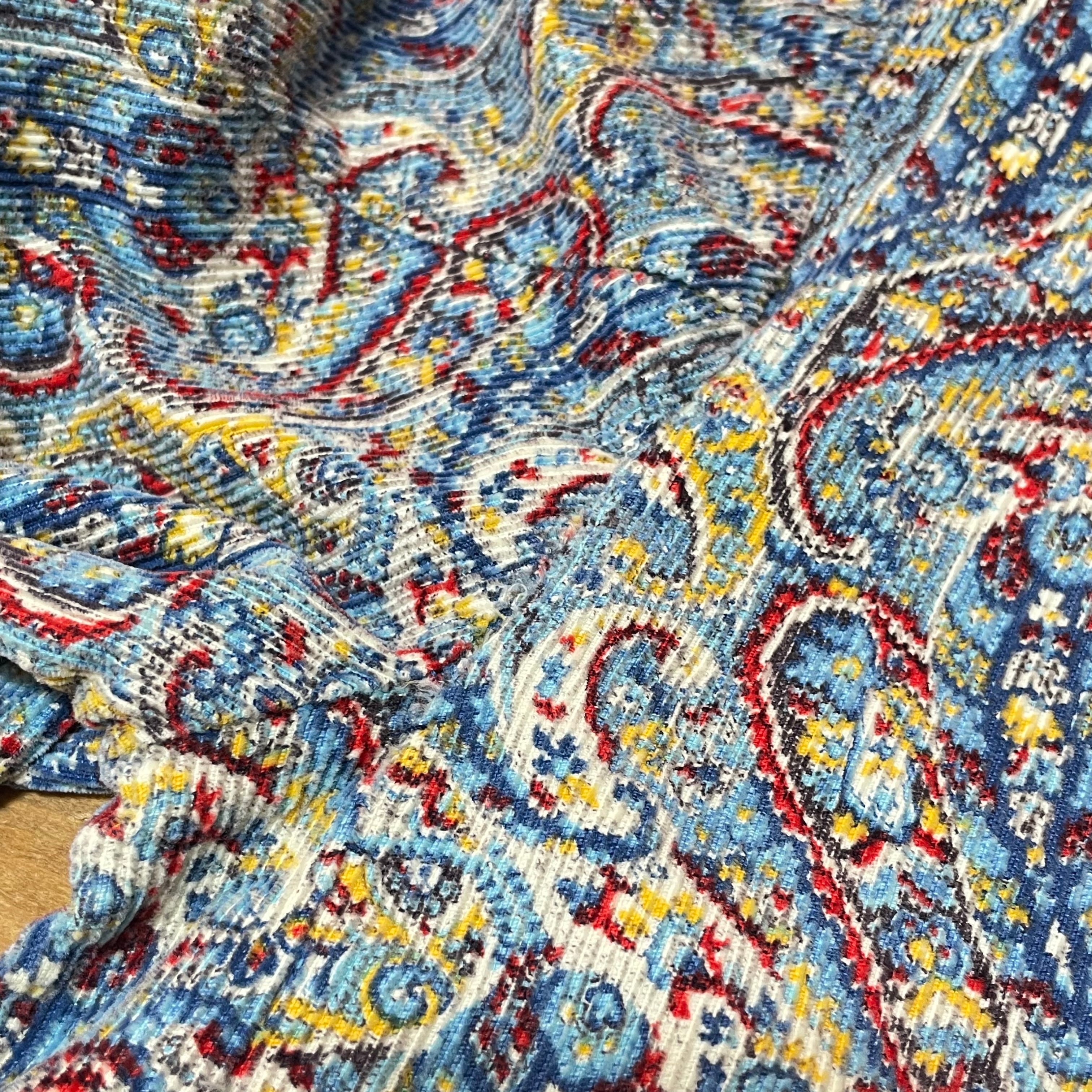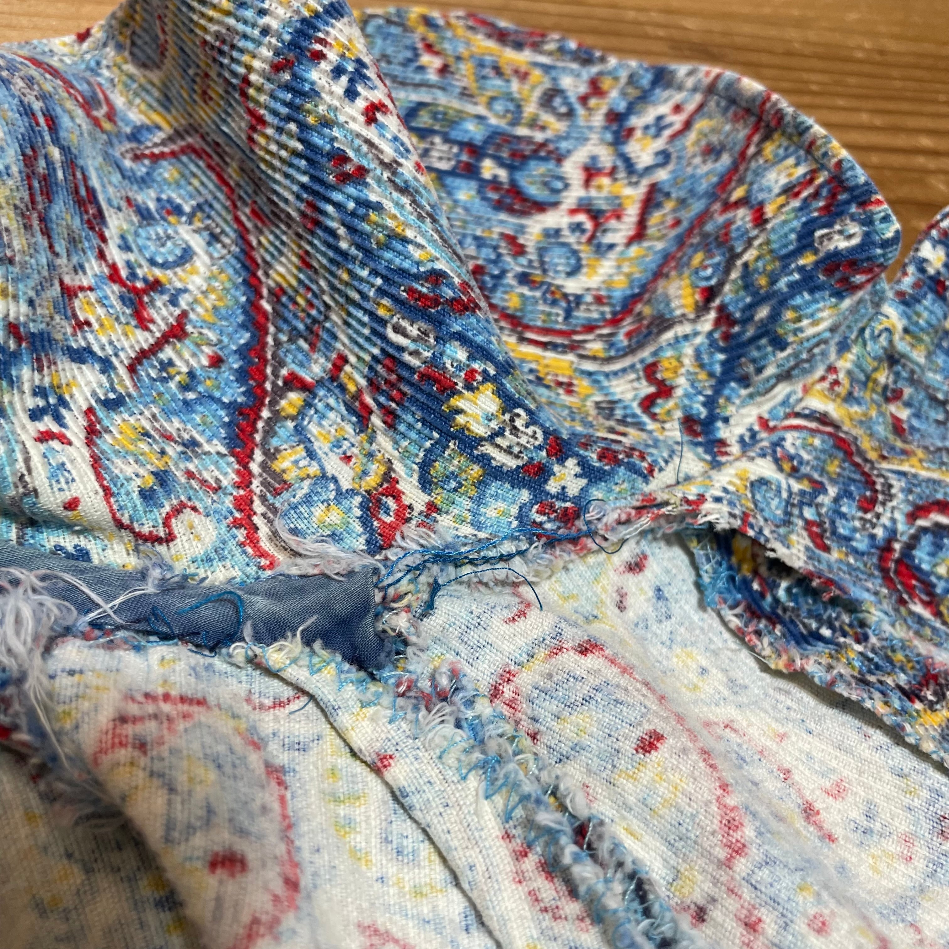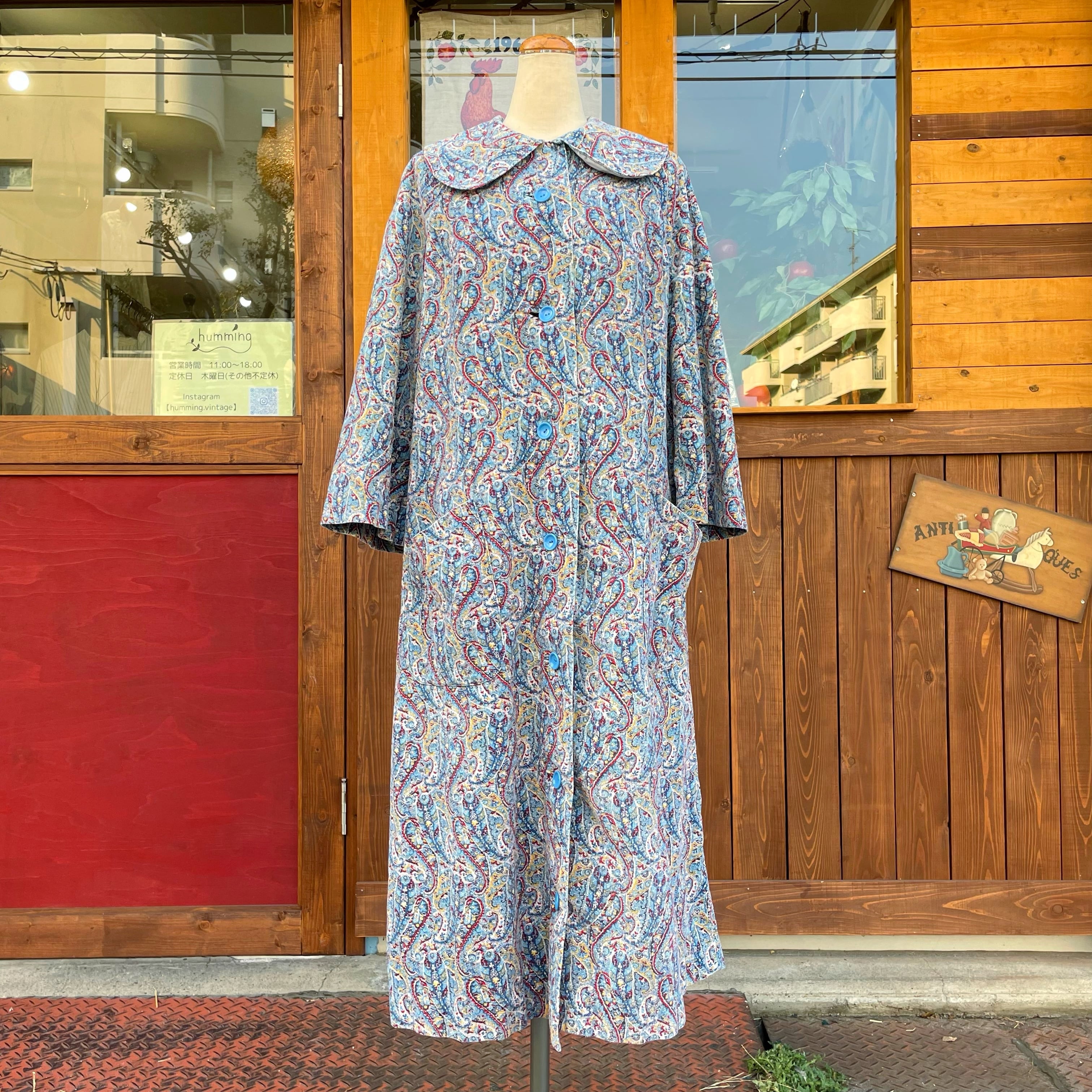 大きな丸襟にペイズリー柄のプリントコーデュロイがインパクトたっぷりな1着。
