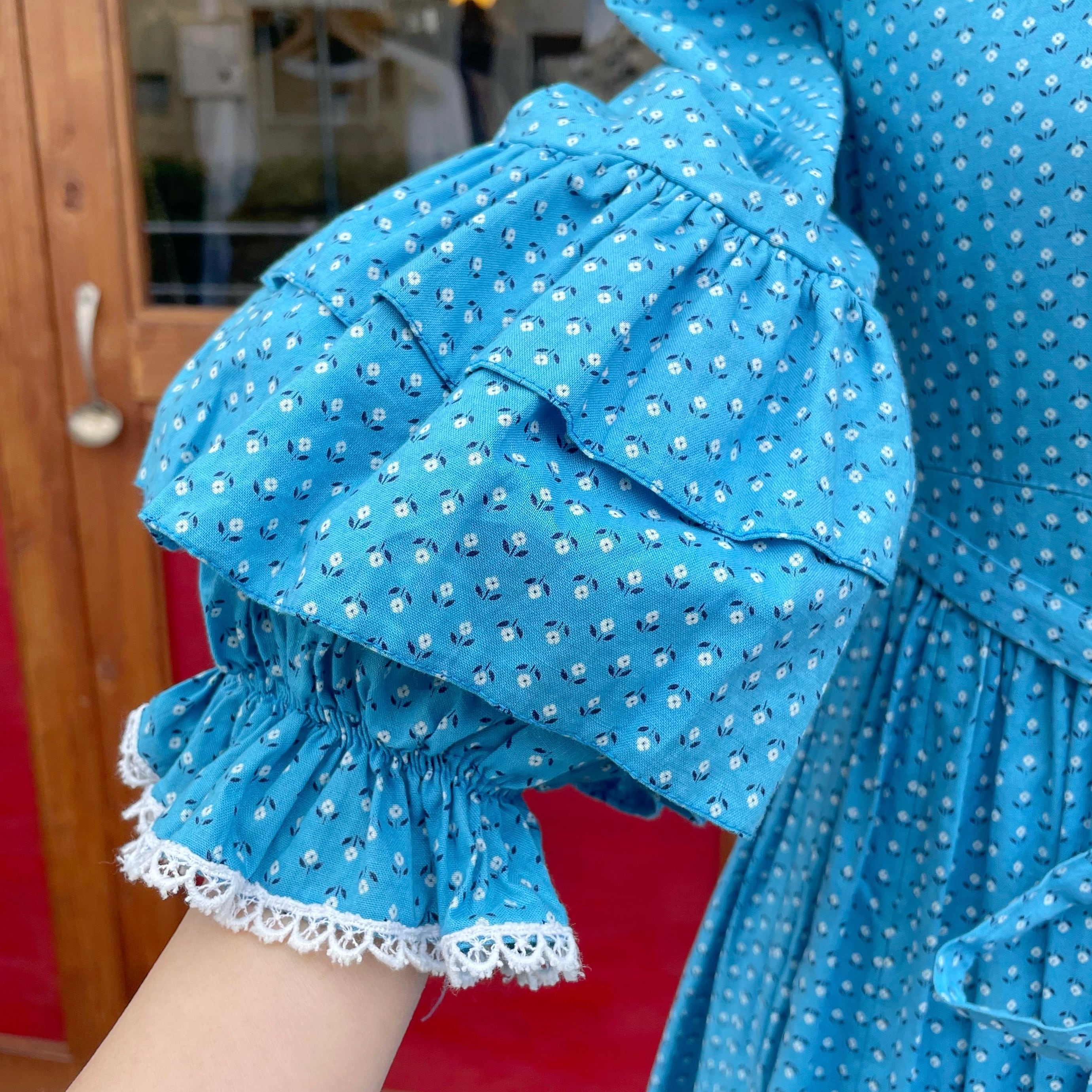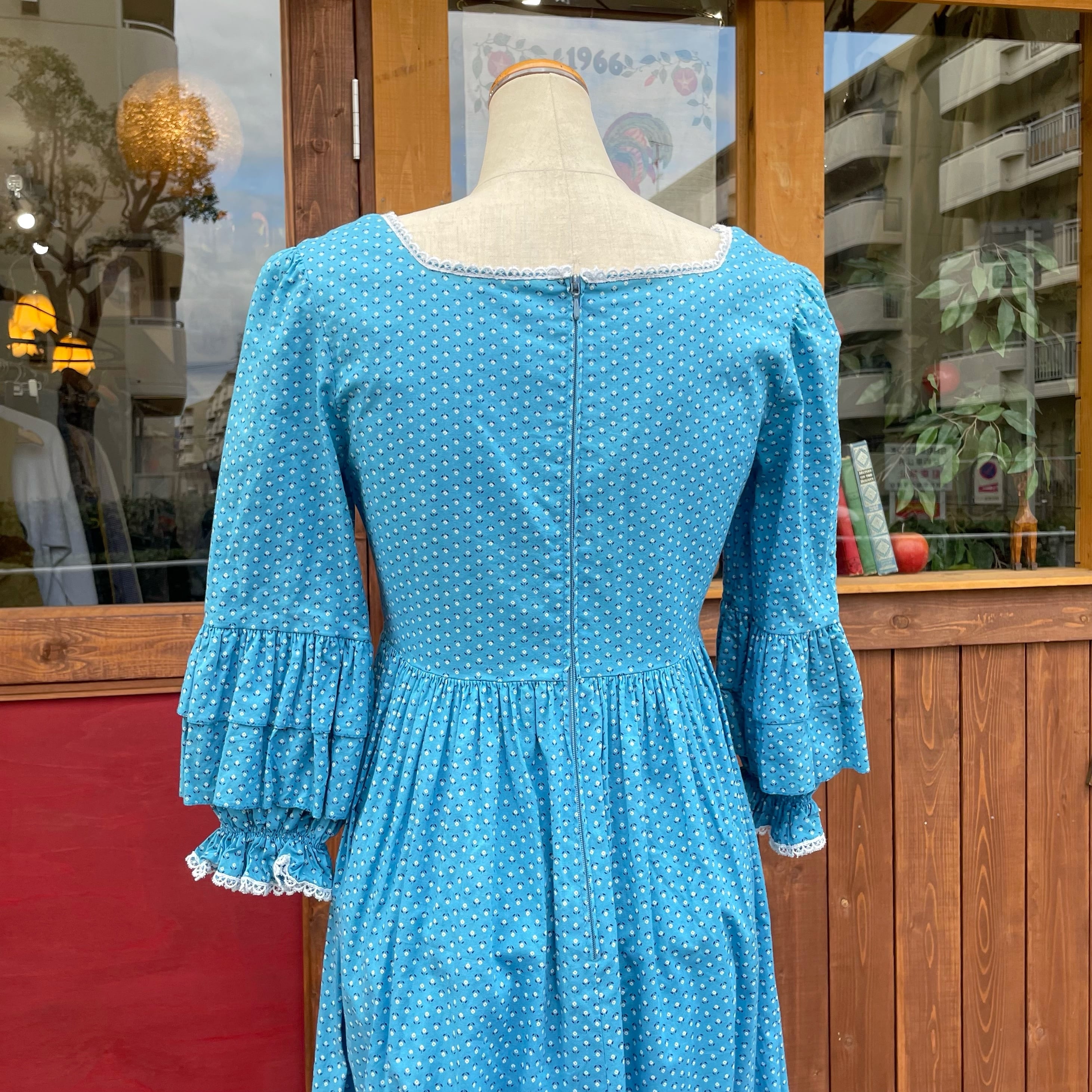 鮮やかなライトブルーのボディに小花柄が可愛い70'sワンピースです。