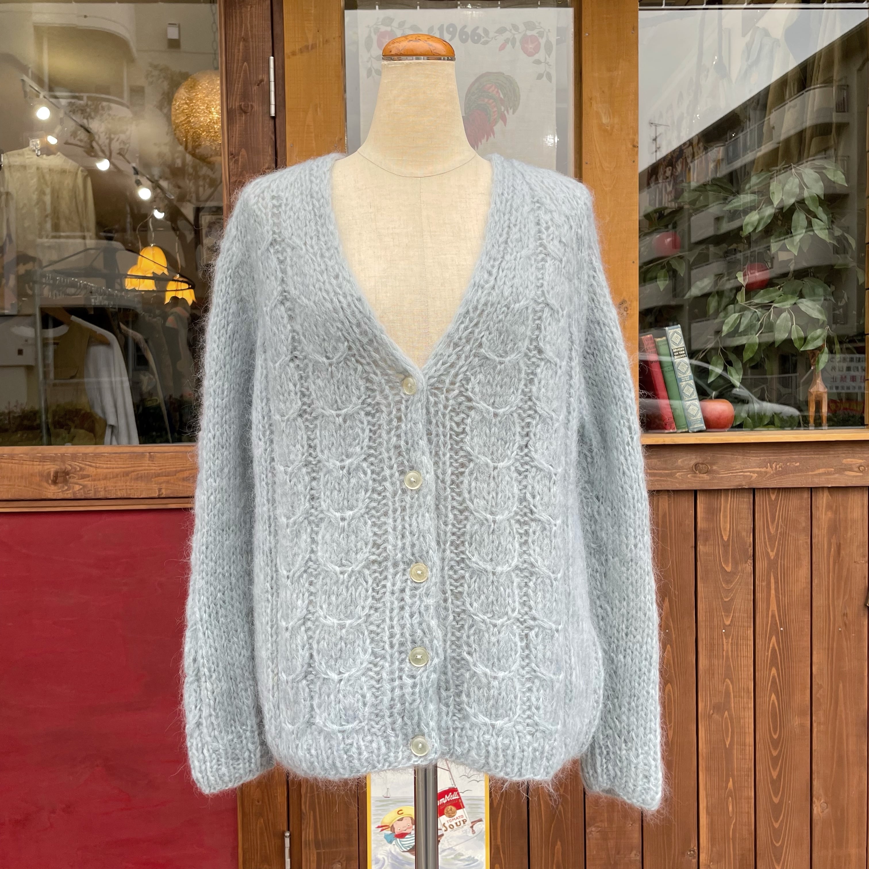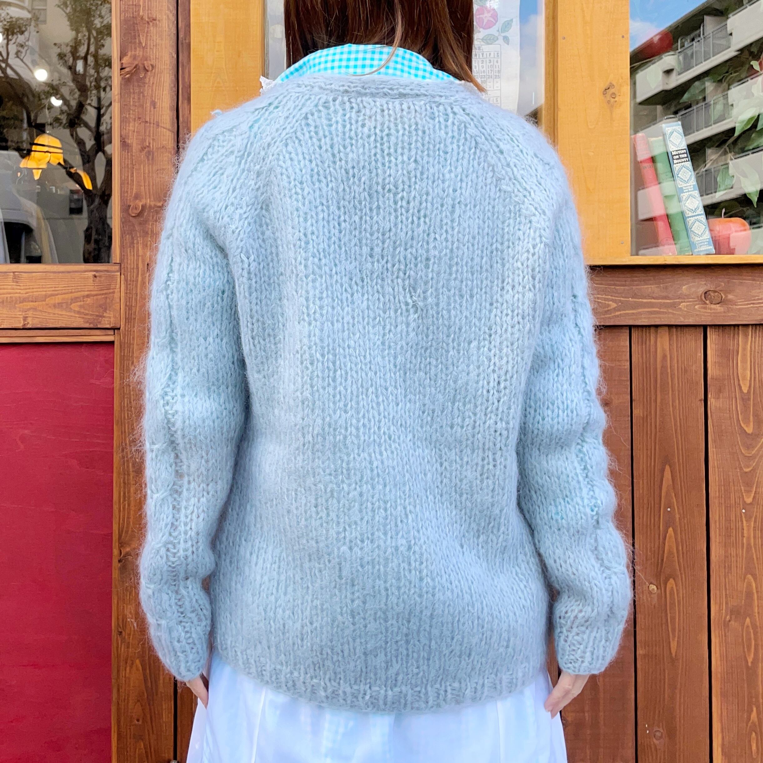 アイスブルーカラーがかわいいヴィンテージのモヘアニットカーディガンです。