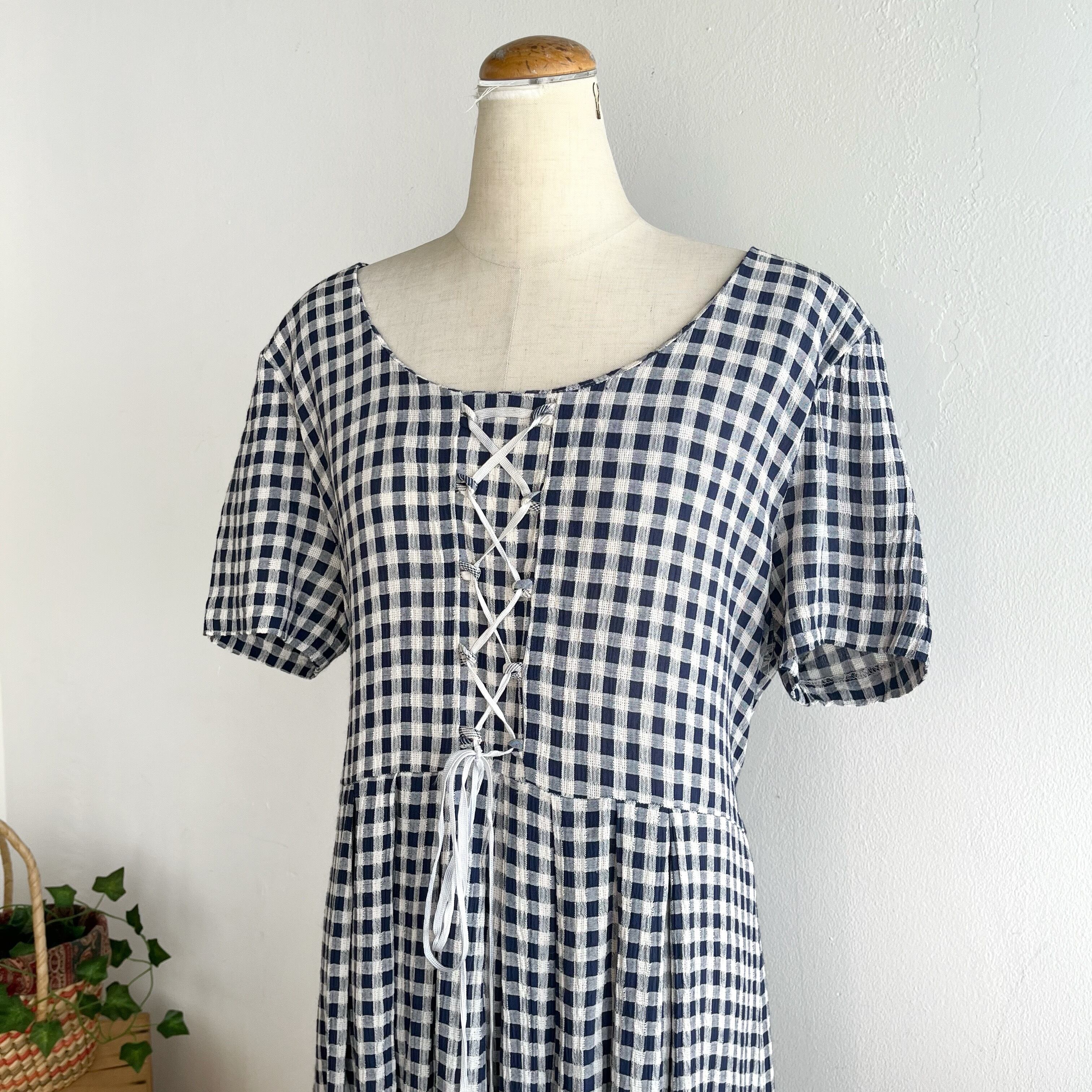 ネイビーのギンガムチェック柄ワンピースです。
