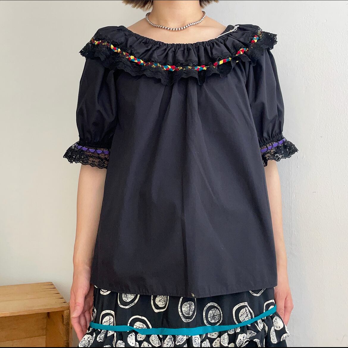 ボリュームのあるフリルとレースの付いたブラウスです。