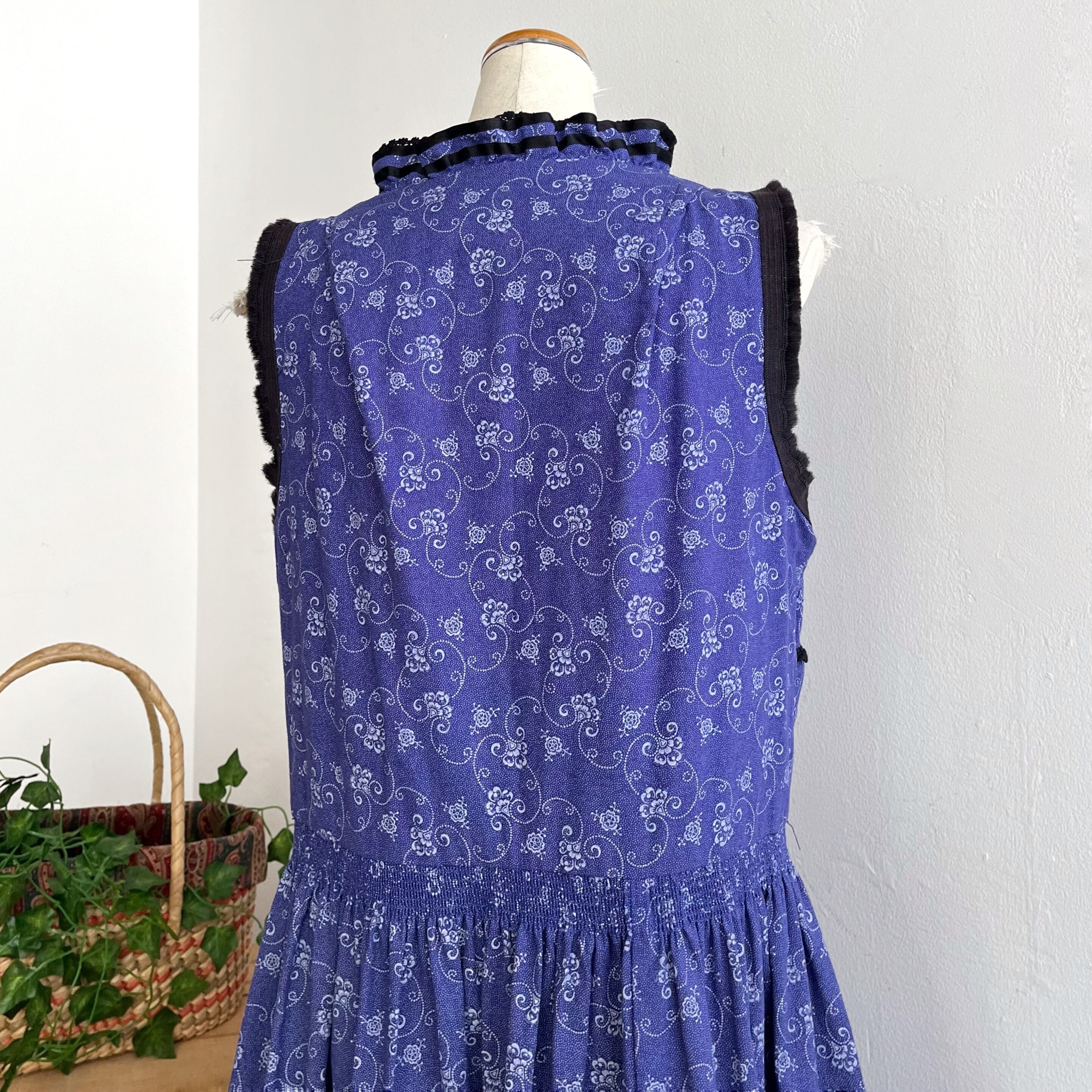 スタンドカラーにフリル、袖周りにはフリンジ、ウエストには細かなプリーツが入っていたりと細部までとても凝ったデザインの一着。