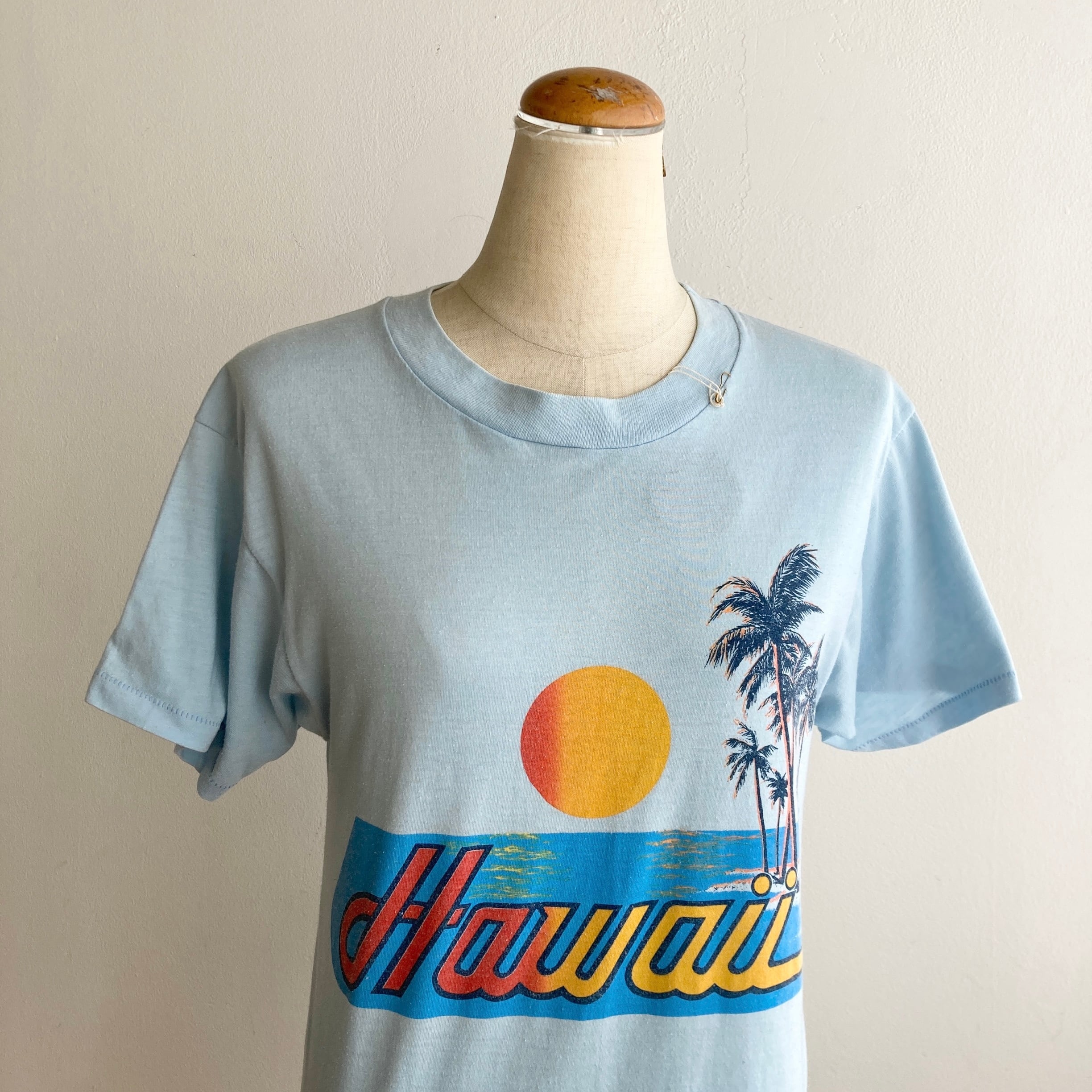 水色のボディに王道なビーチプリントが可愛いハワイTシャツです。