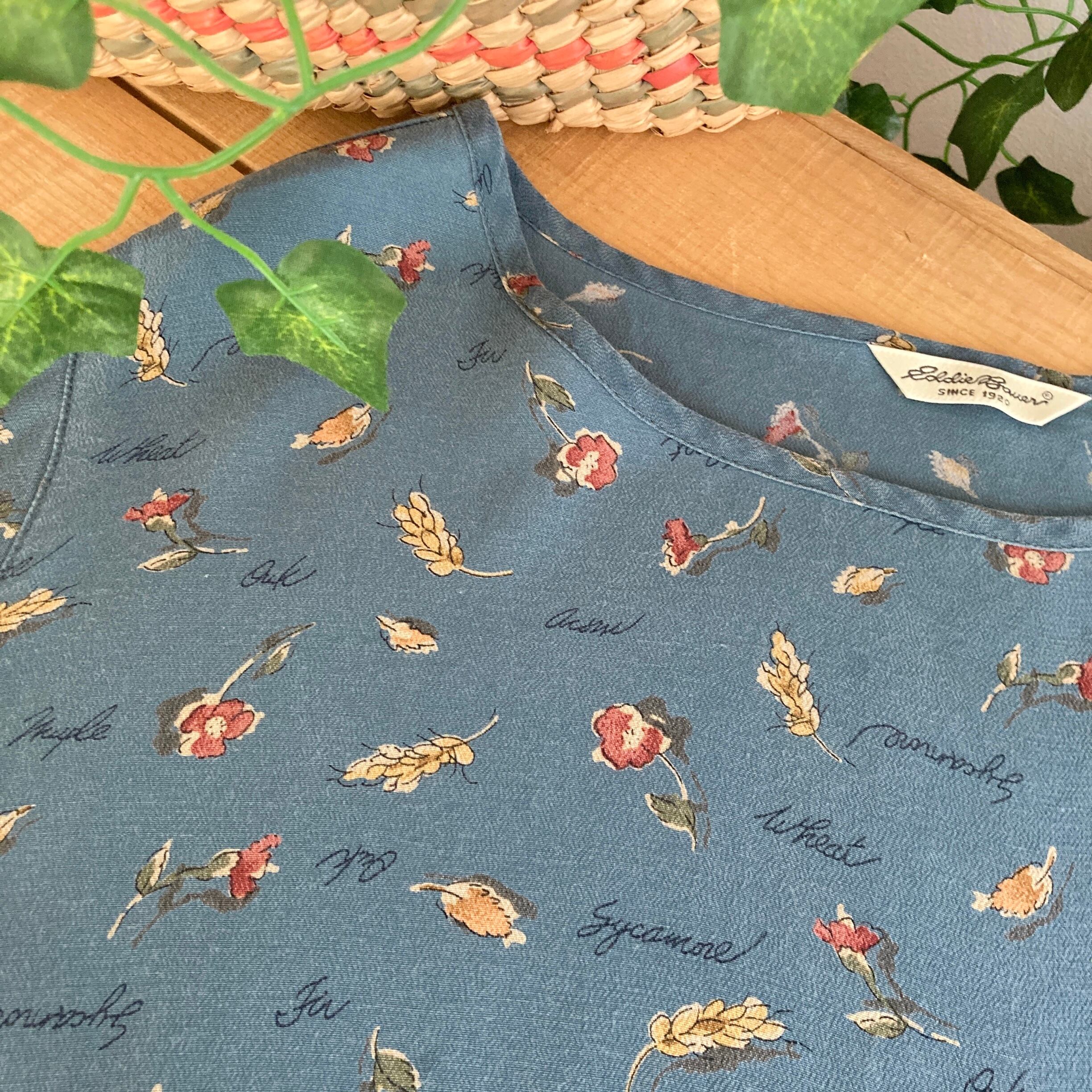 くすみがかったブルーに赤いお花と小麦のパターンが可愛いらしい一着。