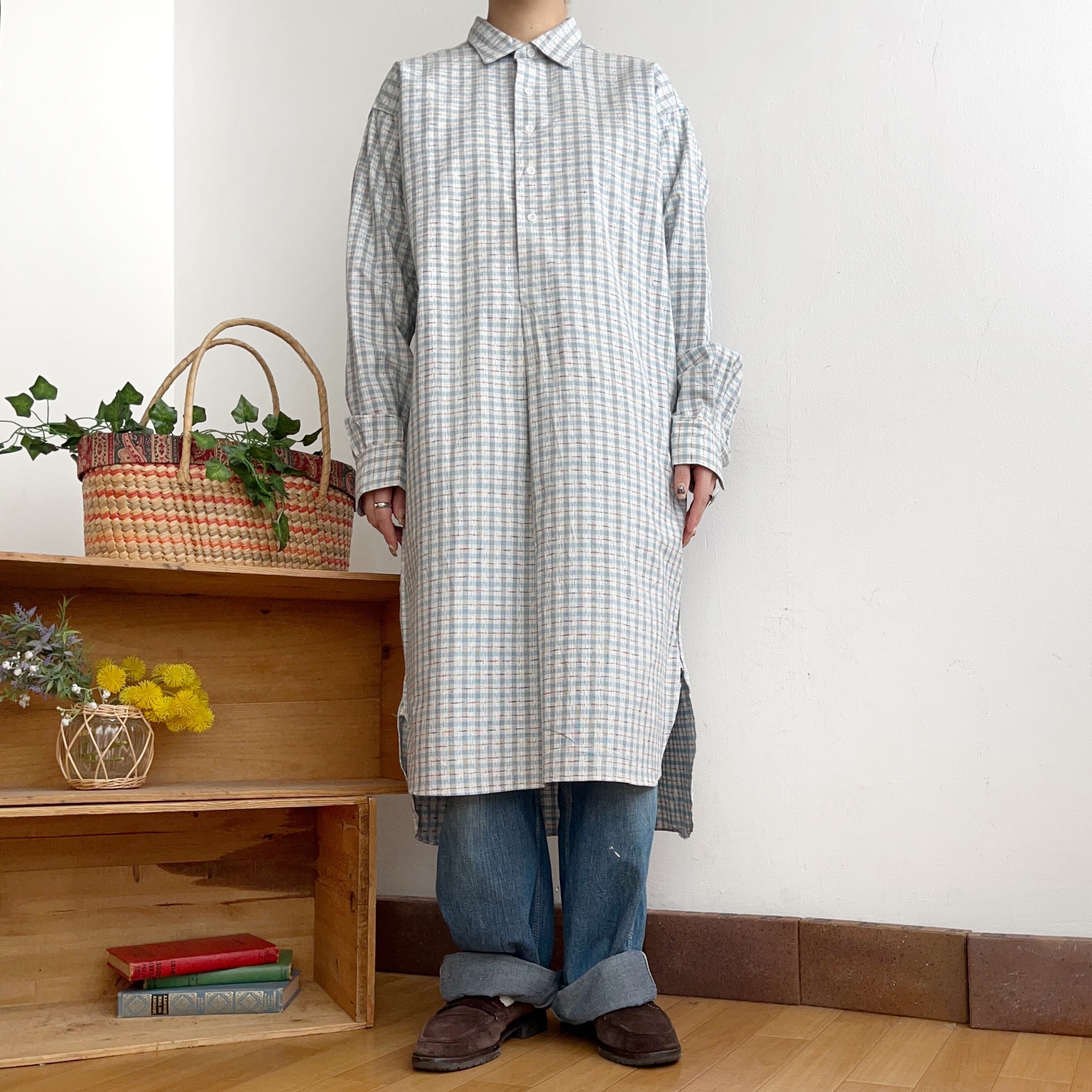 ワンピースの様なロング丈のグランパシャツです。