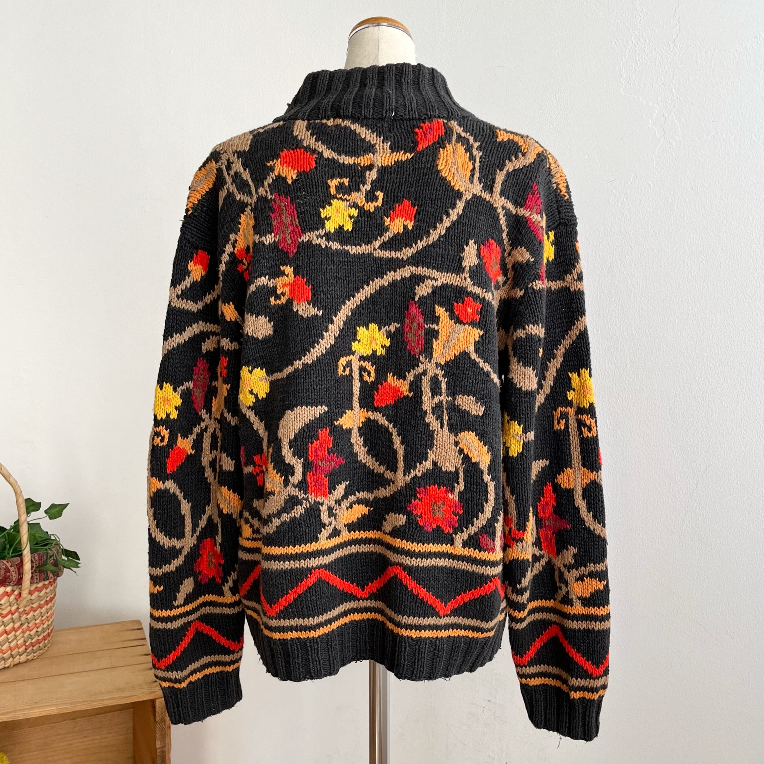 落ち葉の様な模様がキュートで、ブラックボディなので大人っぽく着られる一着。