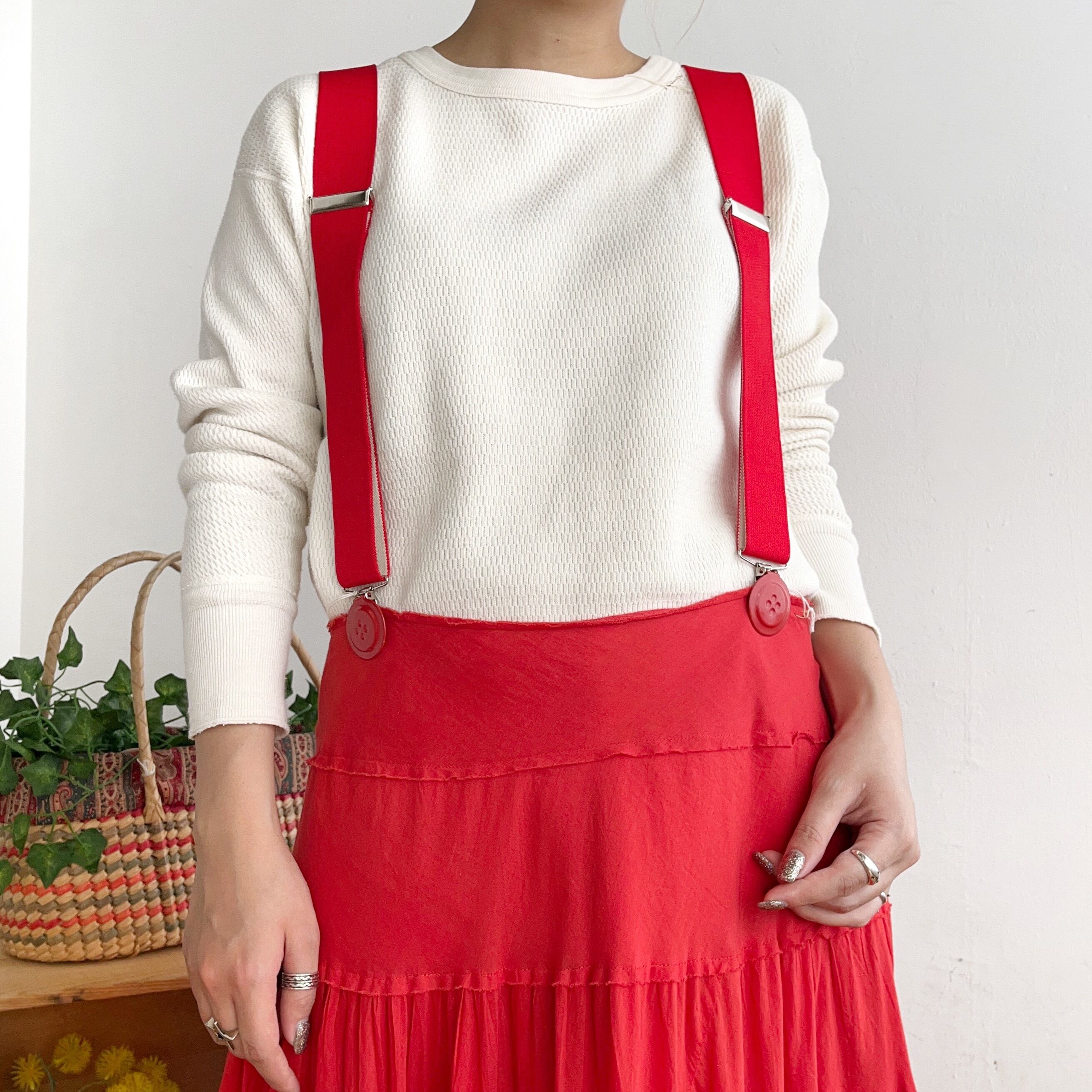 ボタンの留め具が可愛い赤色のサスペンダーです。