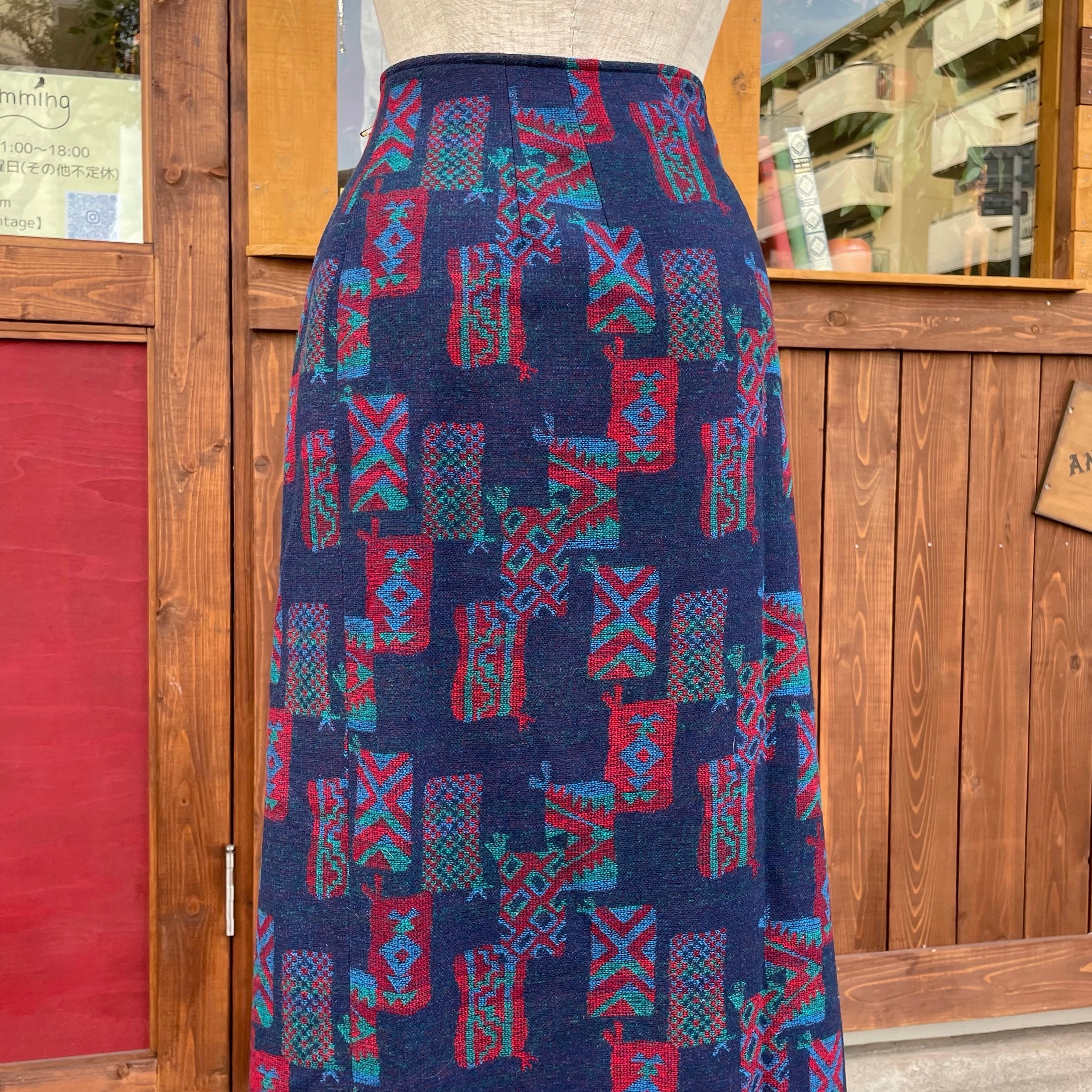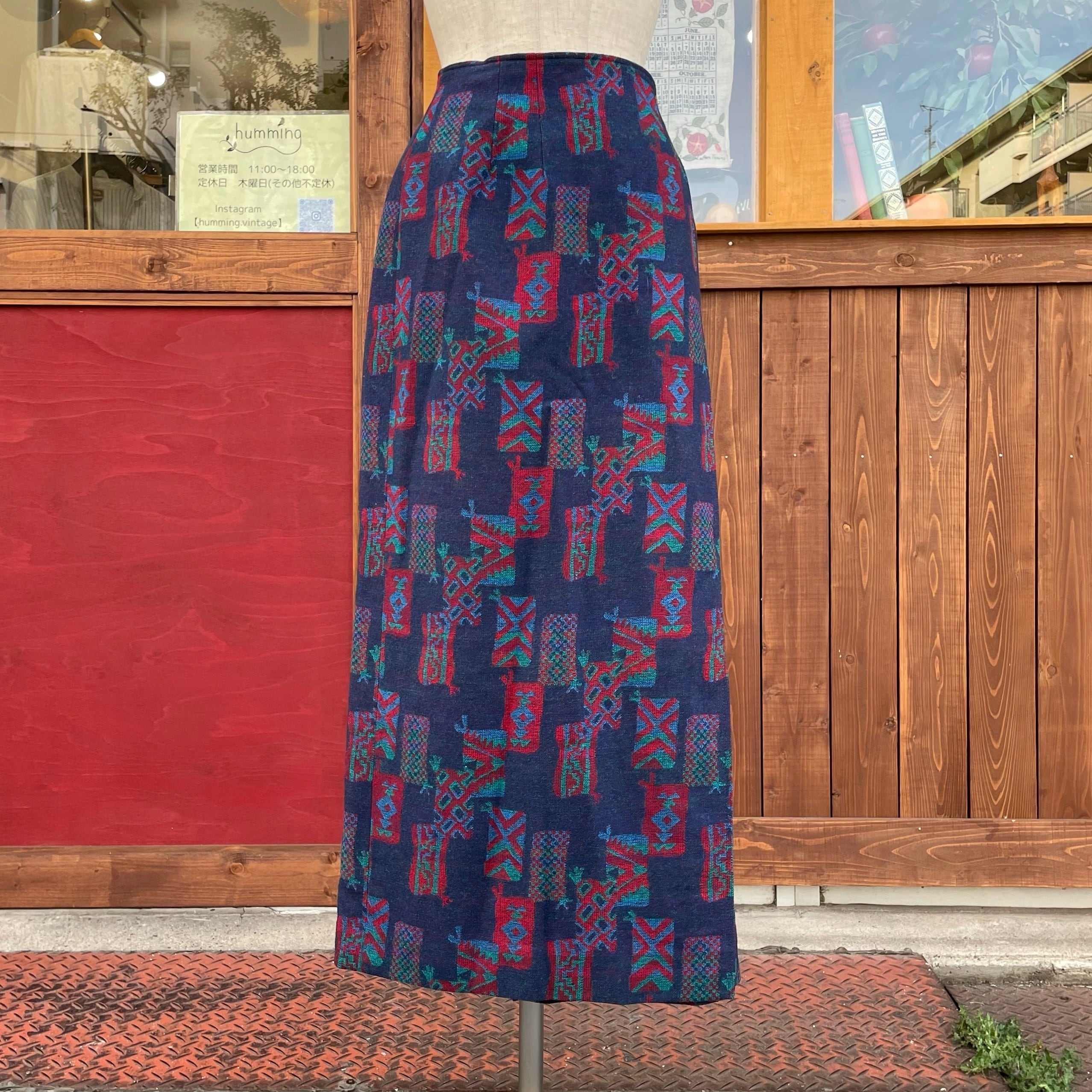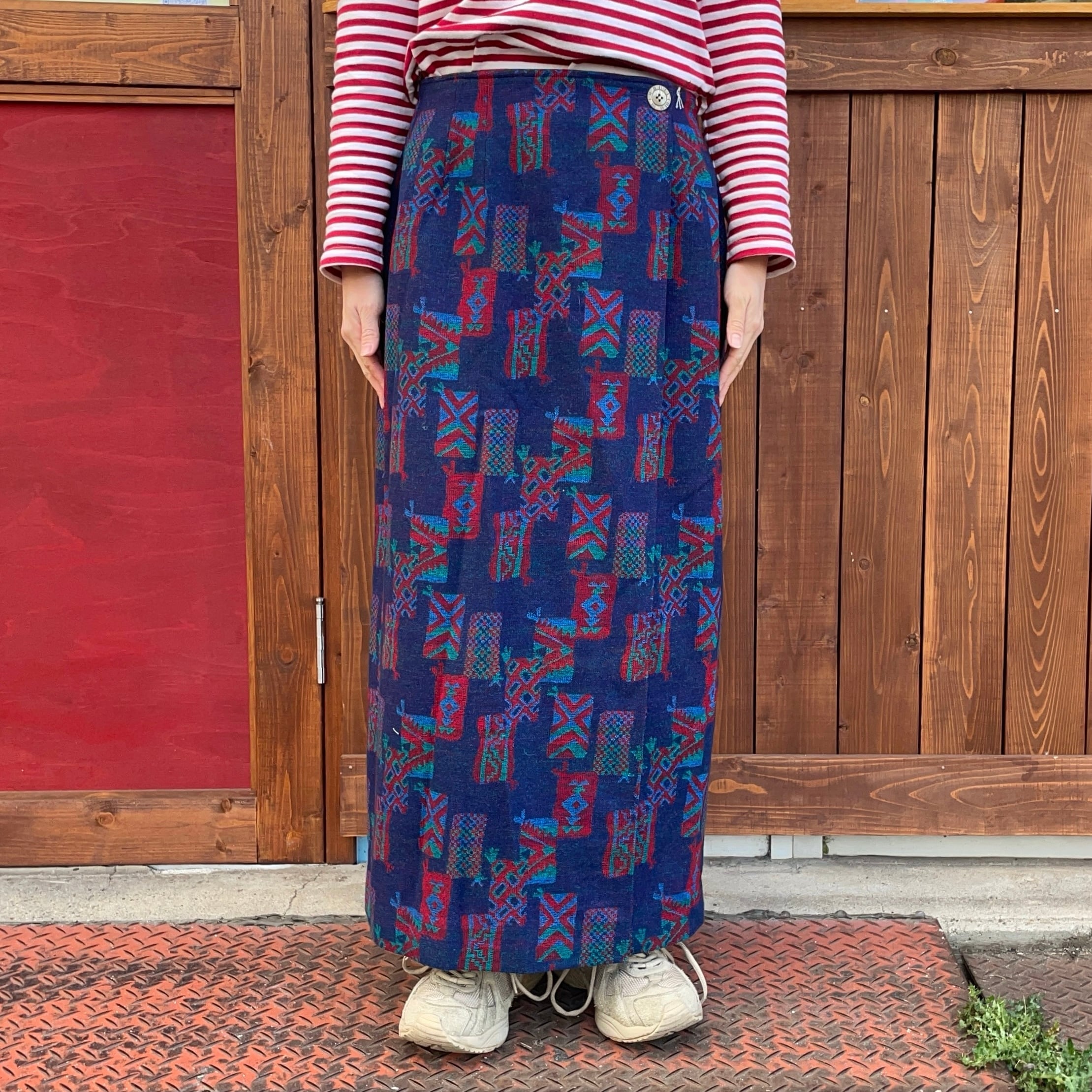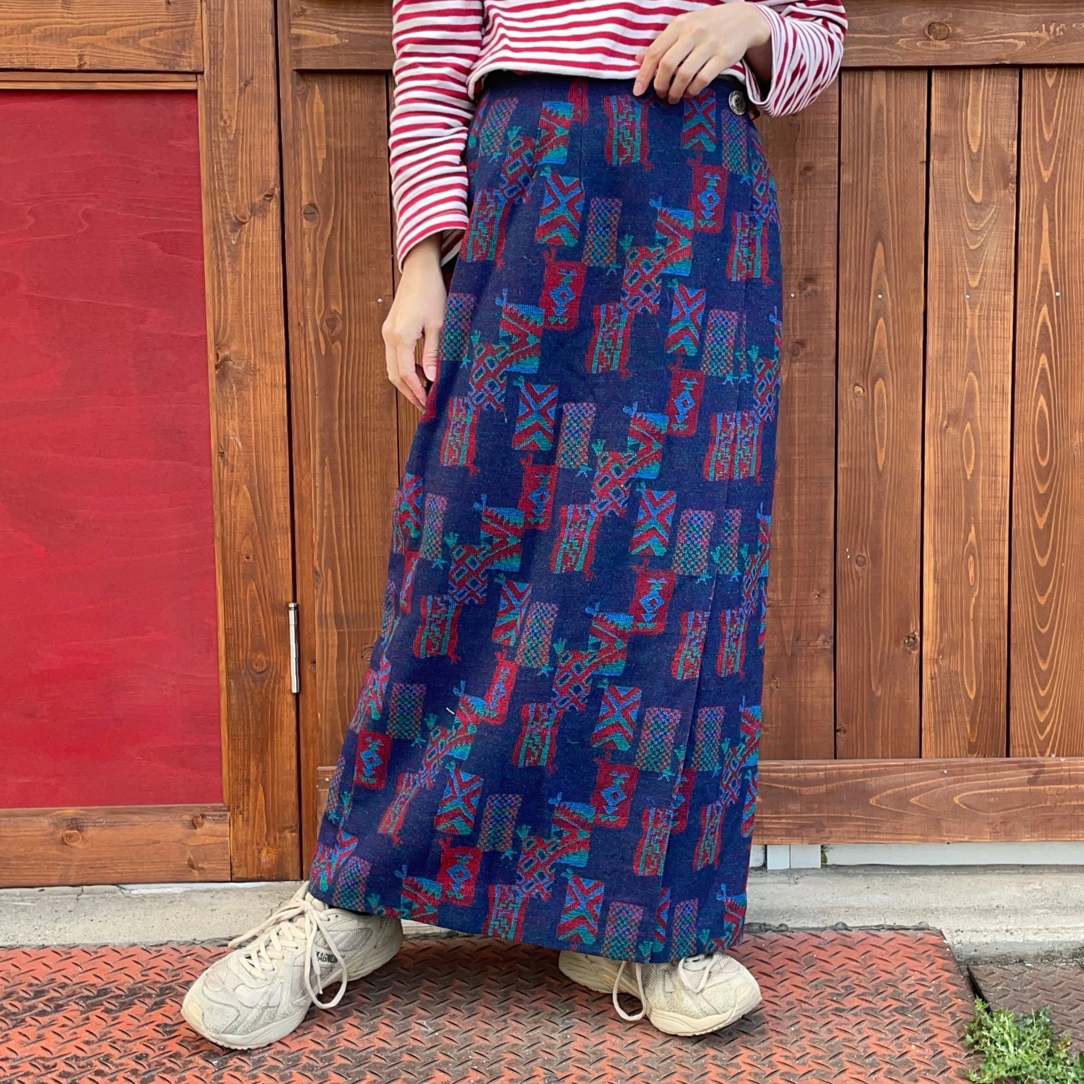 ネイティブなデザインの巻きスカートですが、ストンとしたストレートなシルエットにロング丈なので大人っぽく履いて頂ける一着かと。