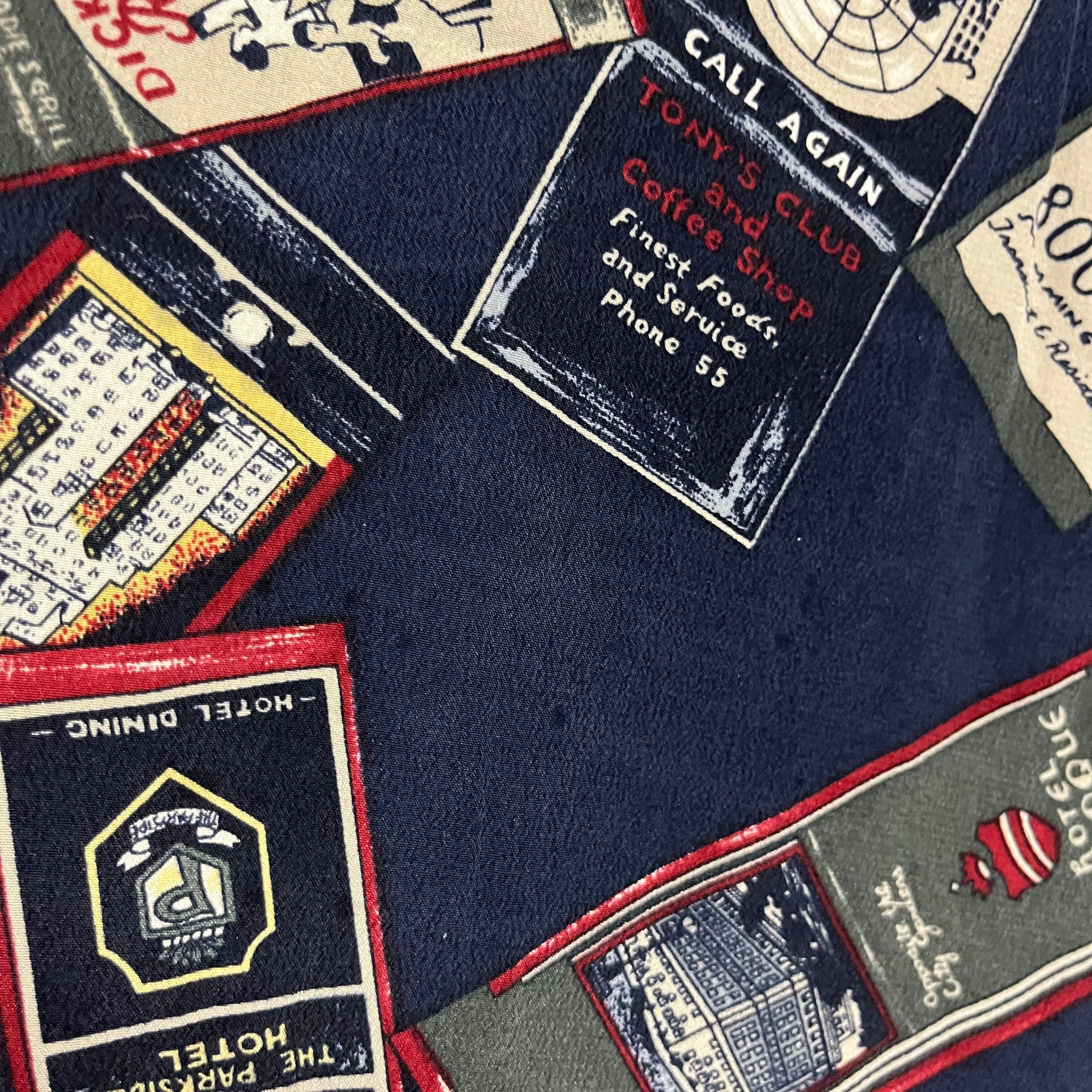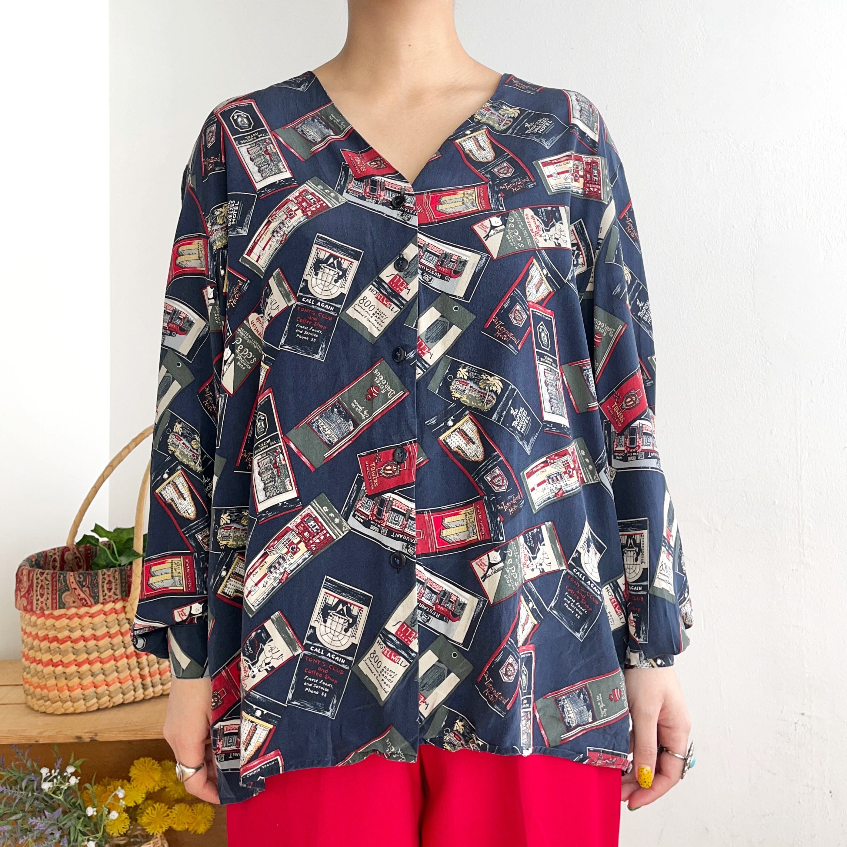 ノーカラーで総柄のシルクシャツです。