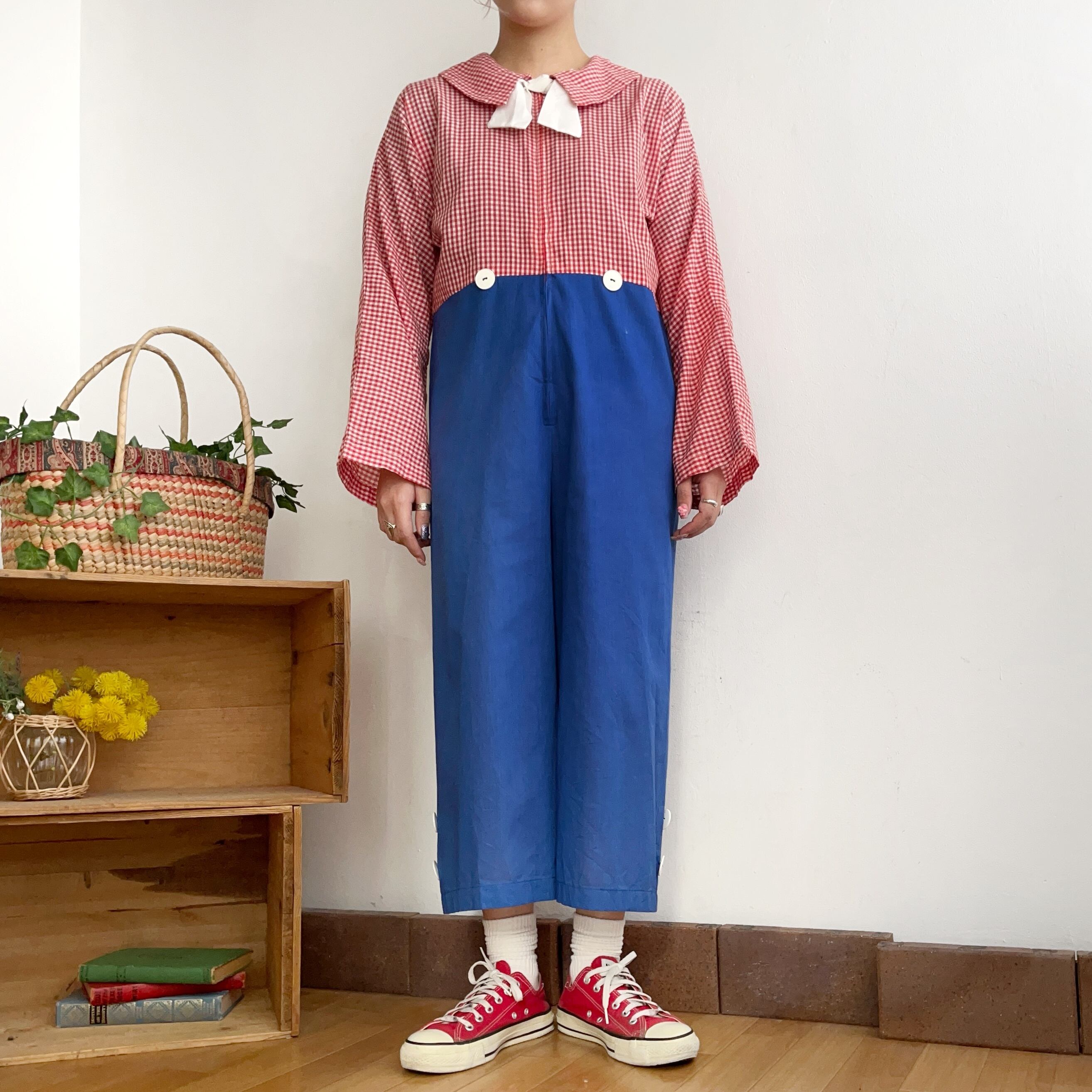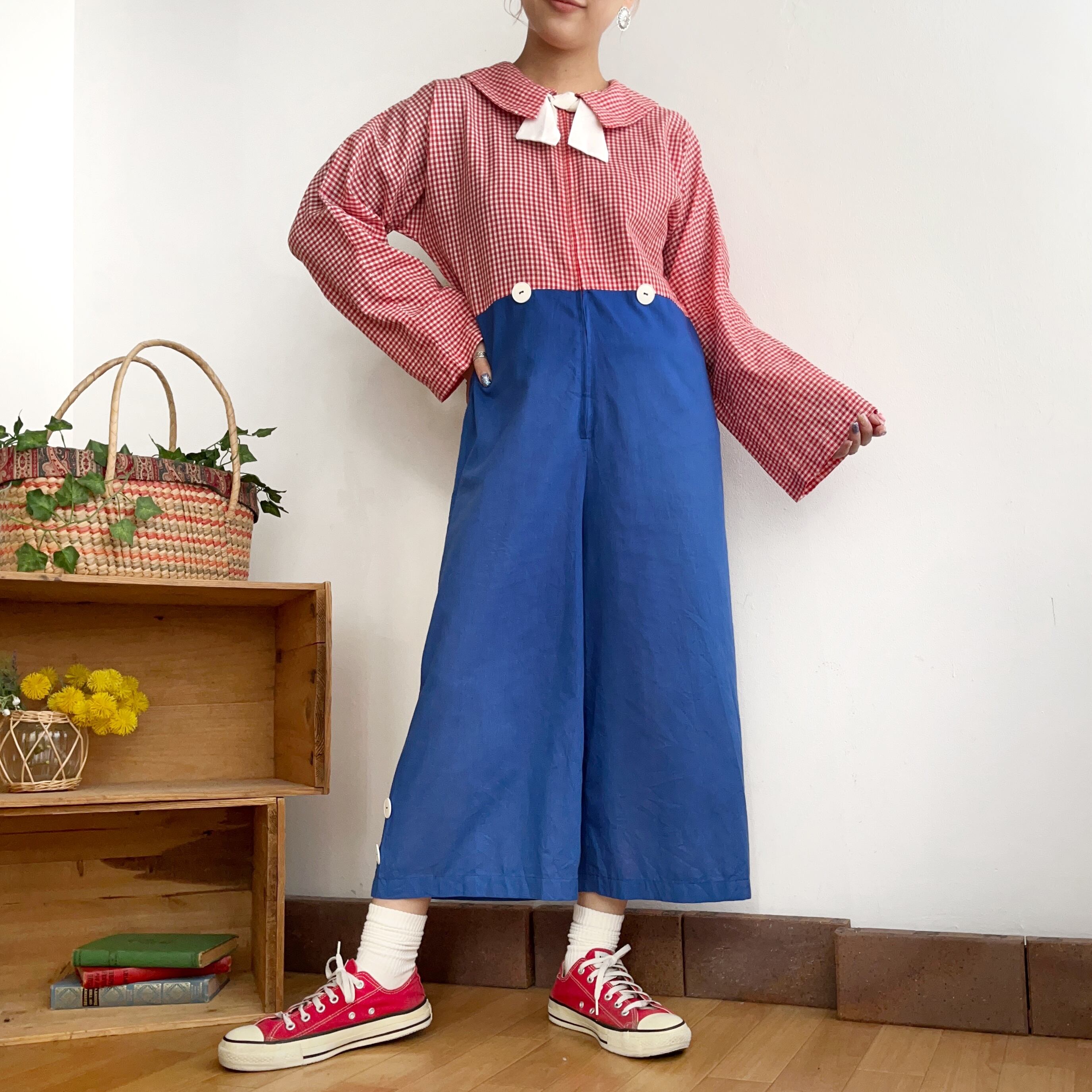 チェック柄に鮮やかなブルーのパンツが可愛いピエロオールインワンです。