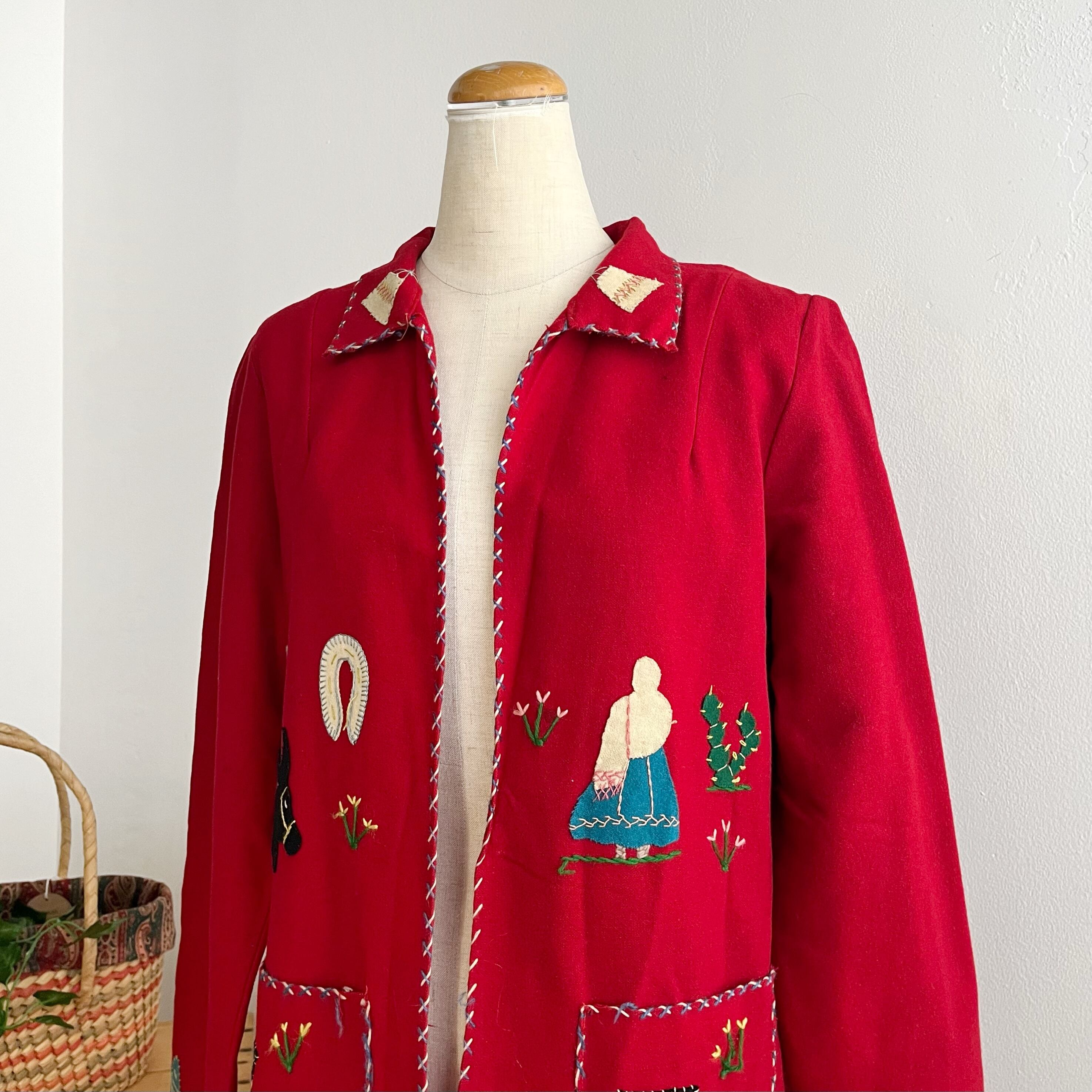 落ち着いた色味の赤いボディににカラフルな刺繍が目を惹く一着で、背後までデザインたっぷりなのが可愛いですよね。