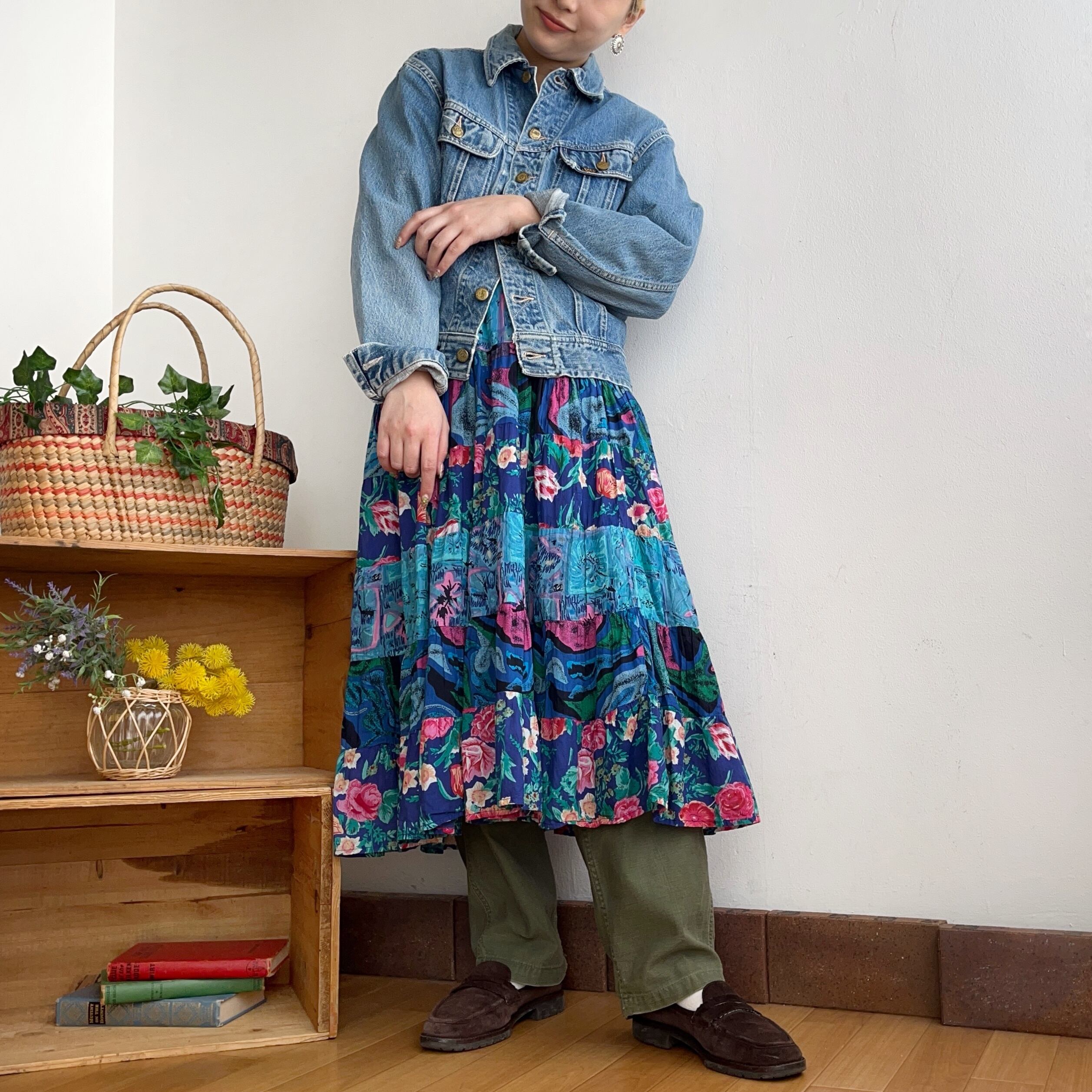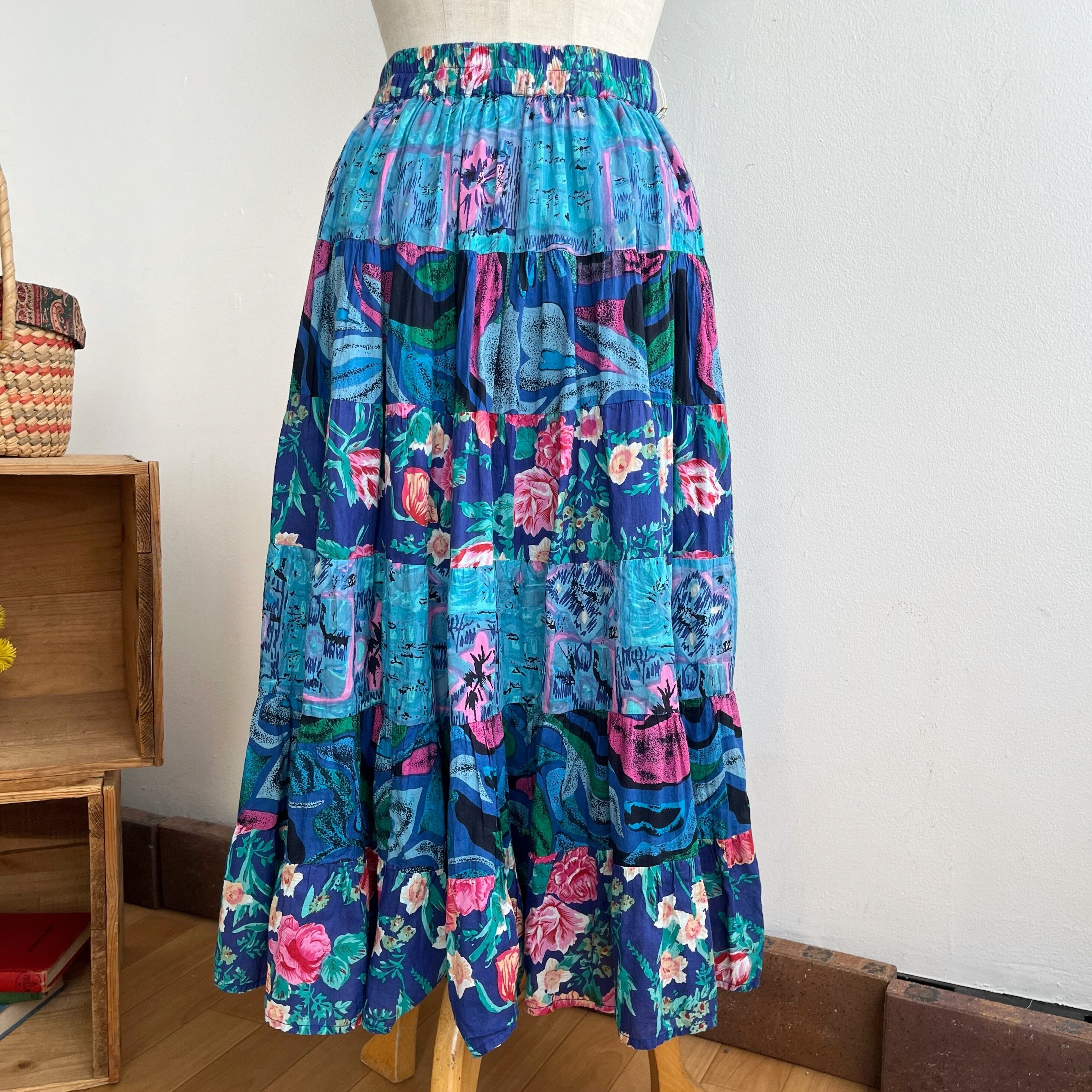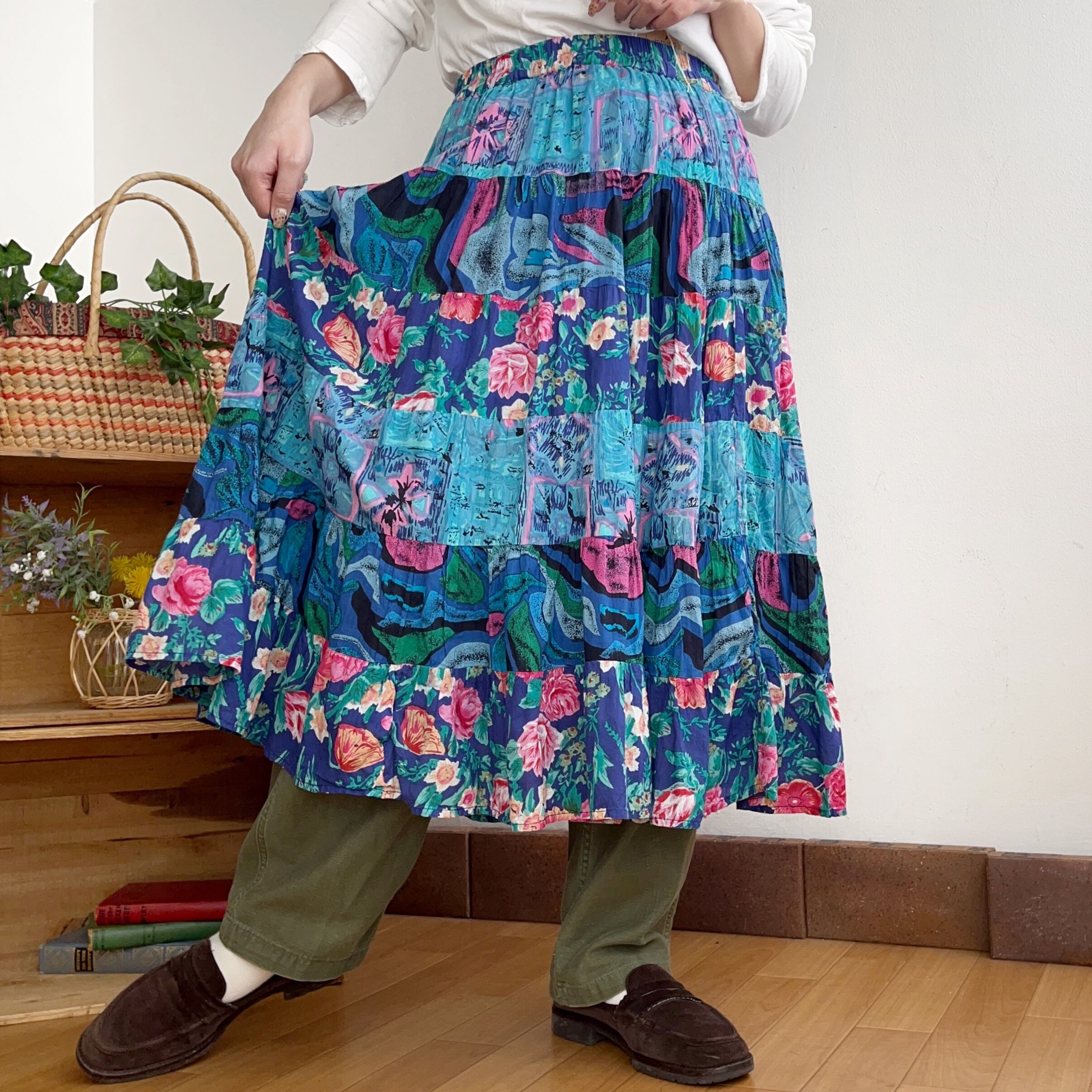 ブルーベースのテキスタイルが可愛いインドコットンのティアードスカートです。