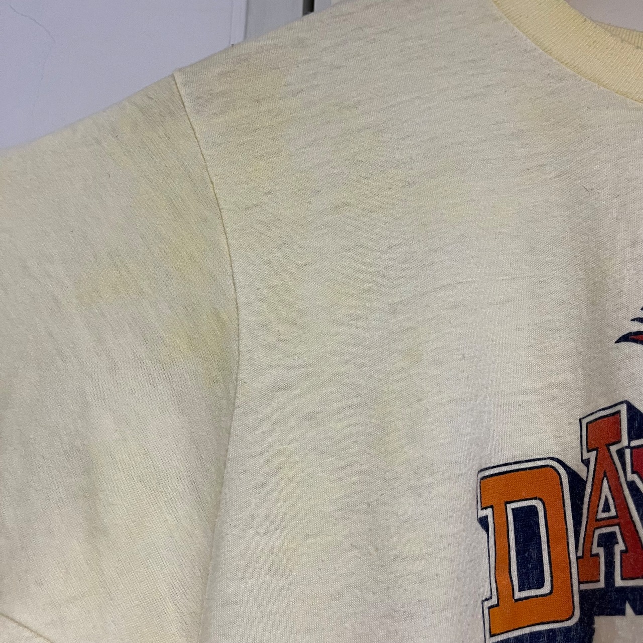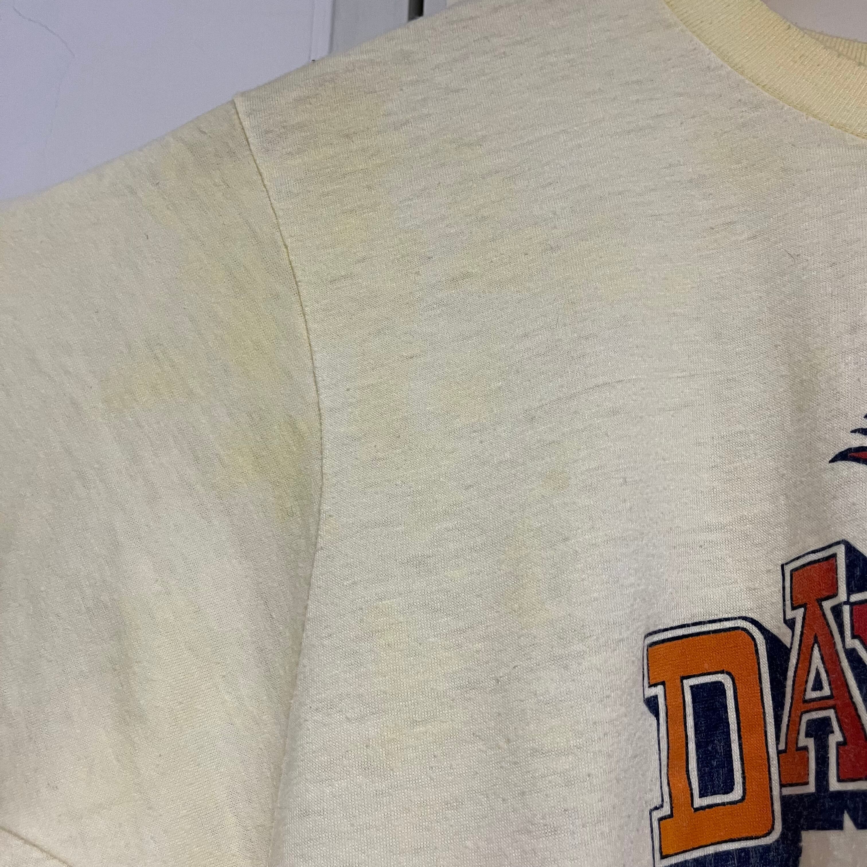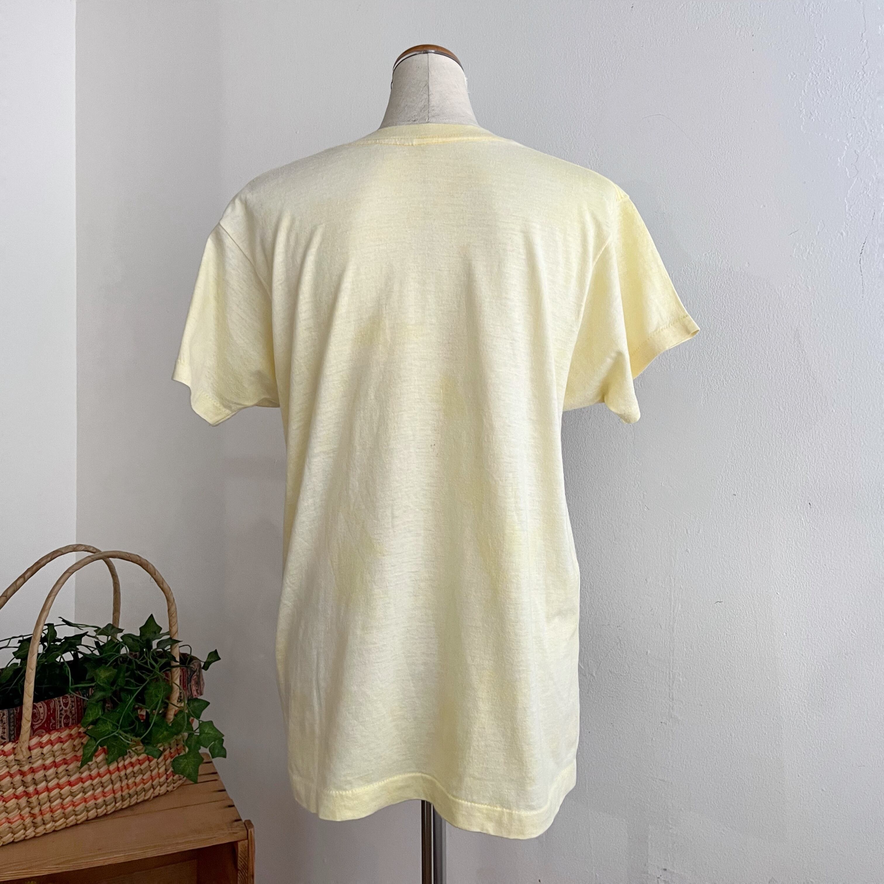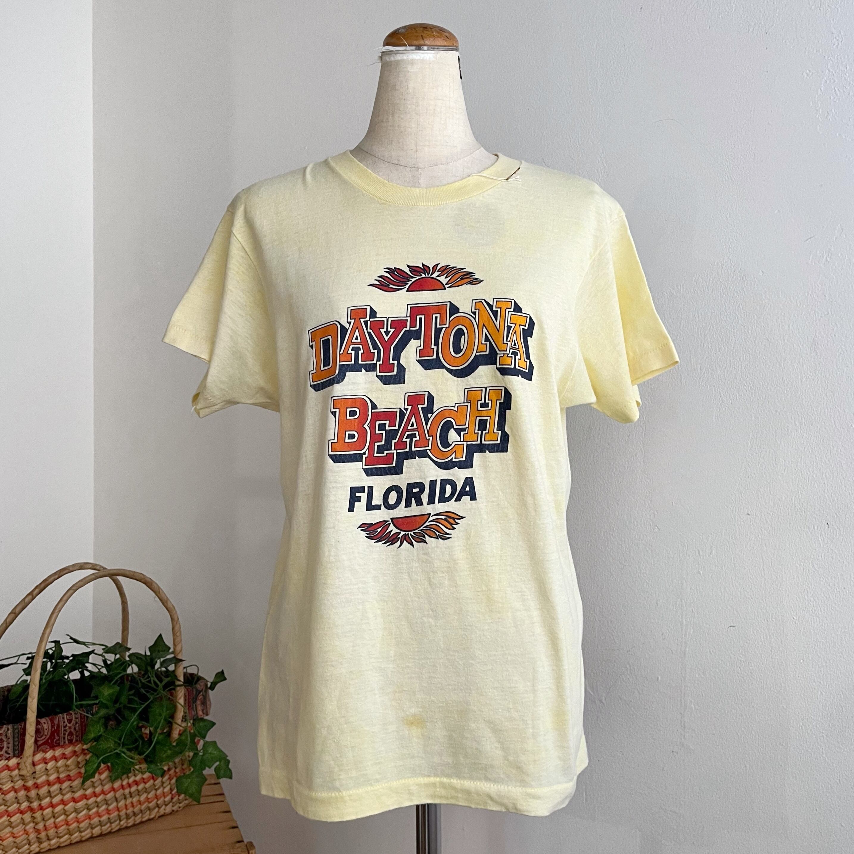 クリームイエローのボディに、オレンジ色のロゴプリントが可愛いTシャツです。