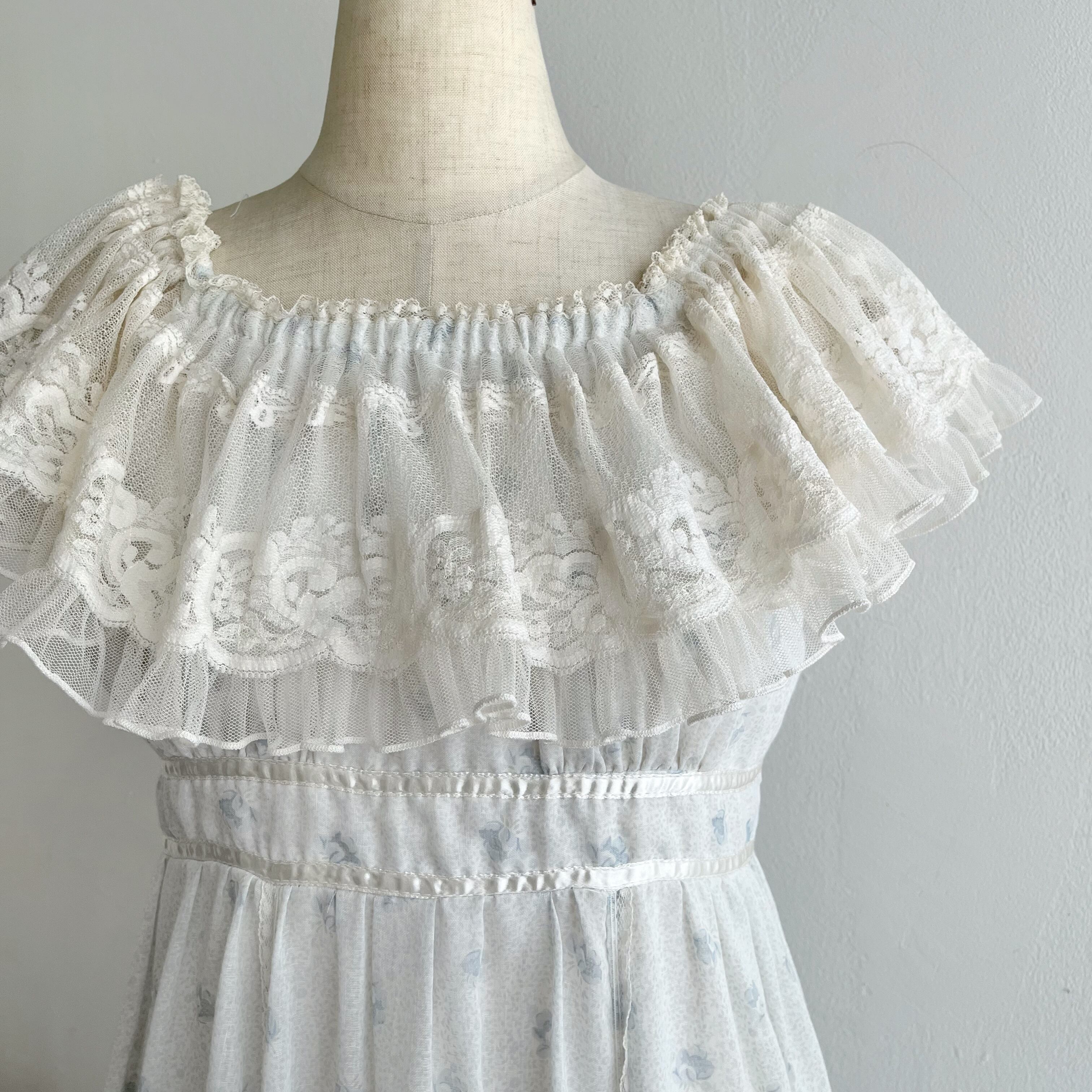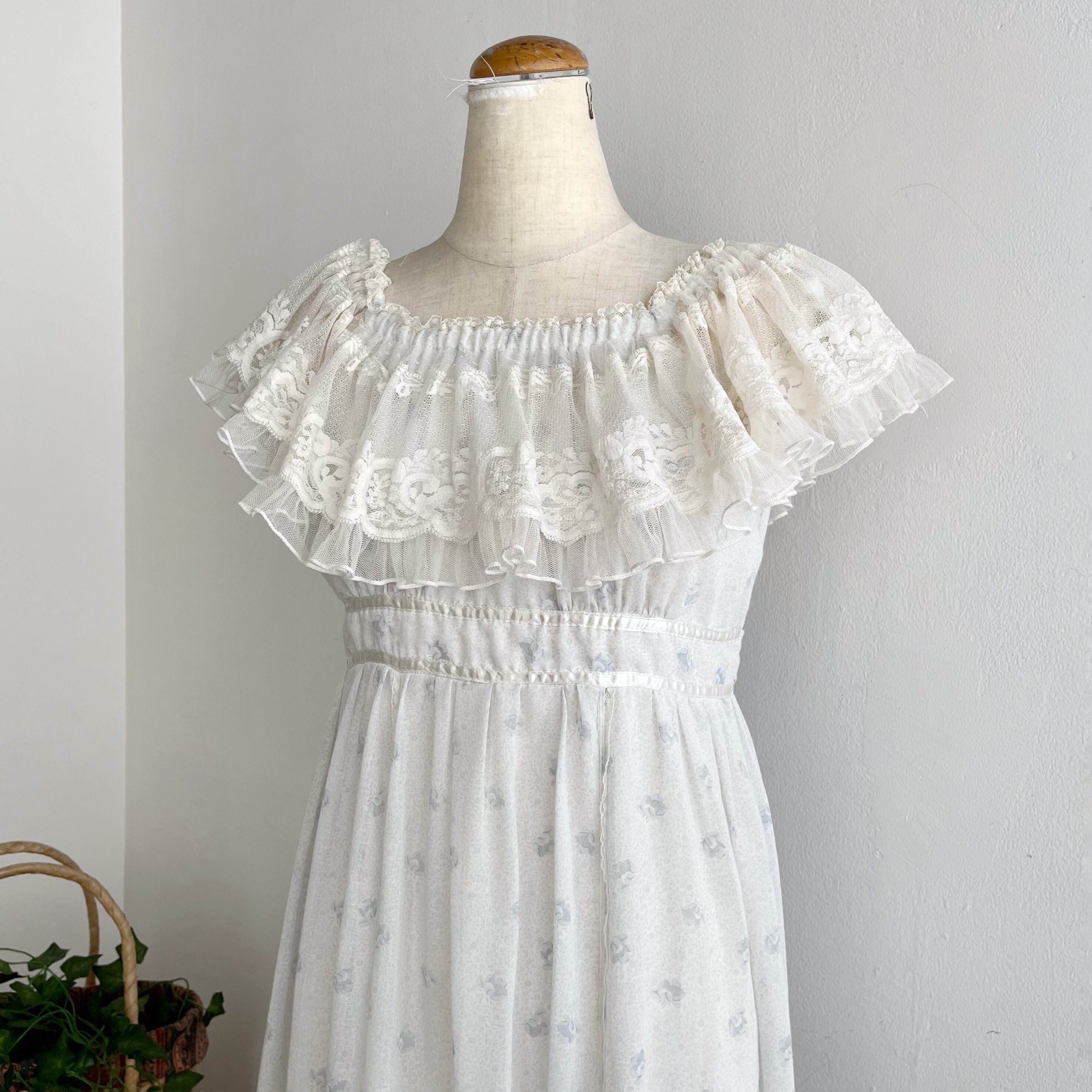 ふんわりとボリューミーなコットンガーゼ素材と肩から胸元にかけて掛かるレースの繊細さにうっとりする一着。