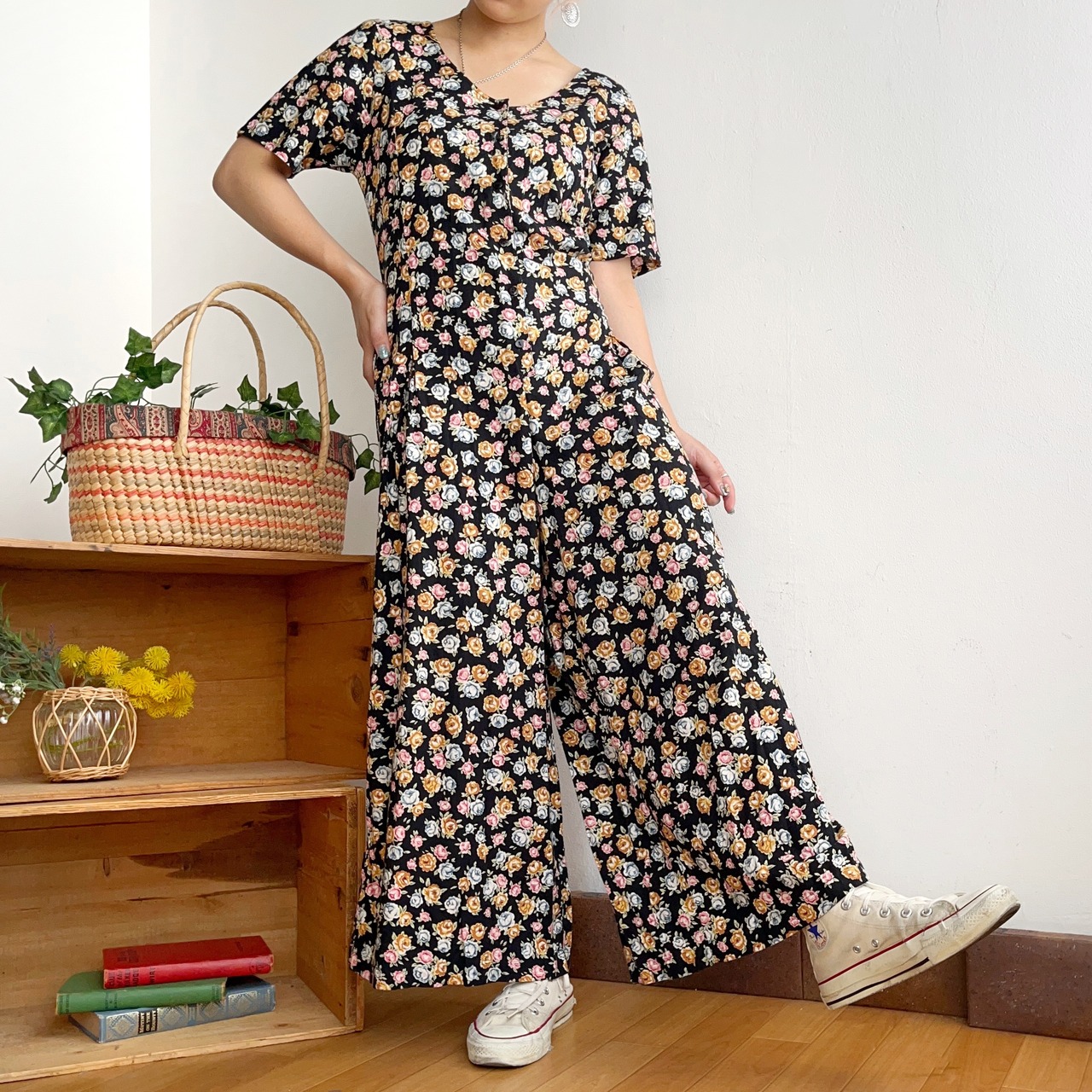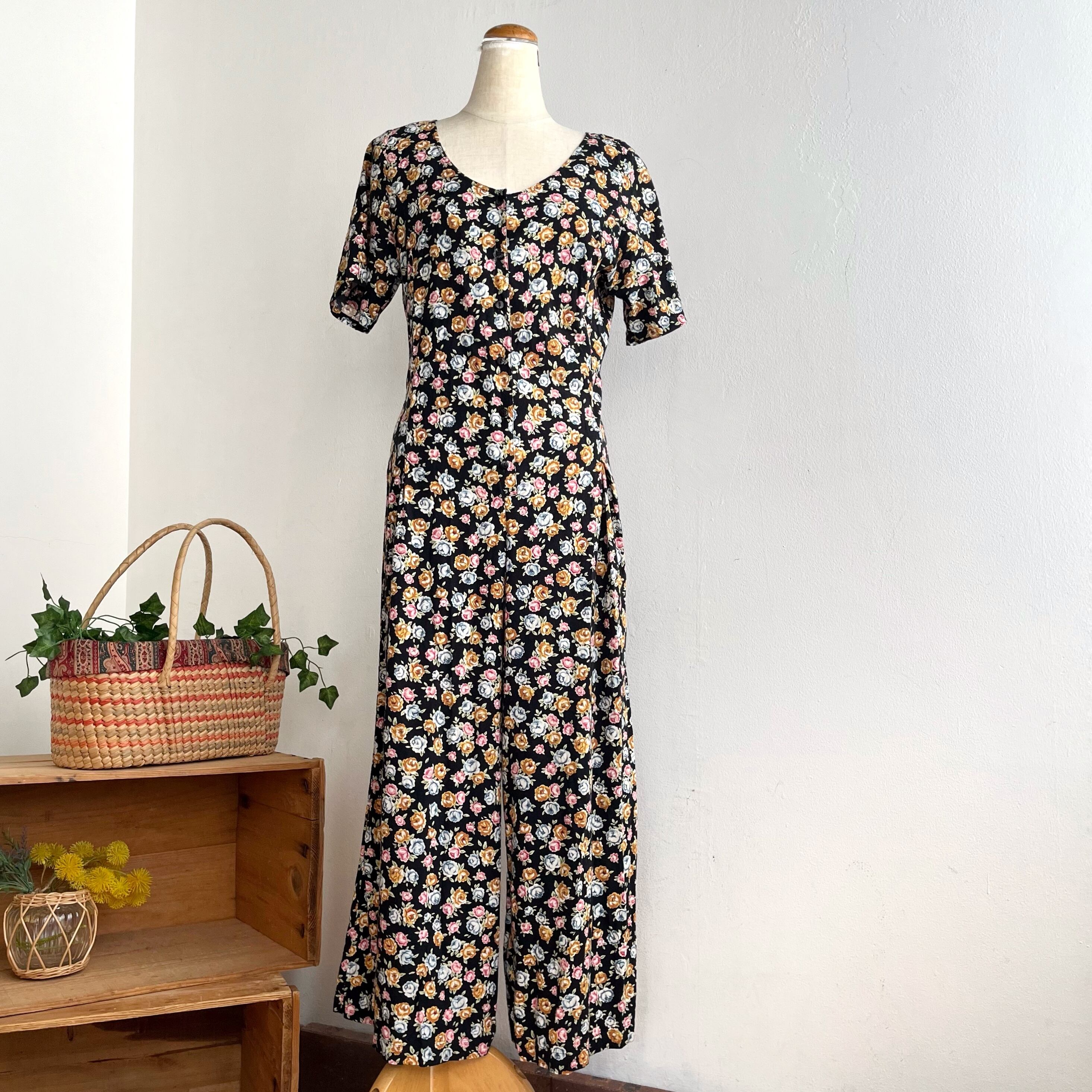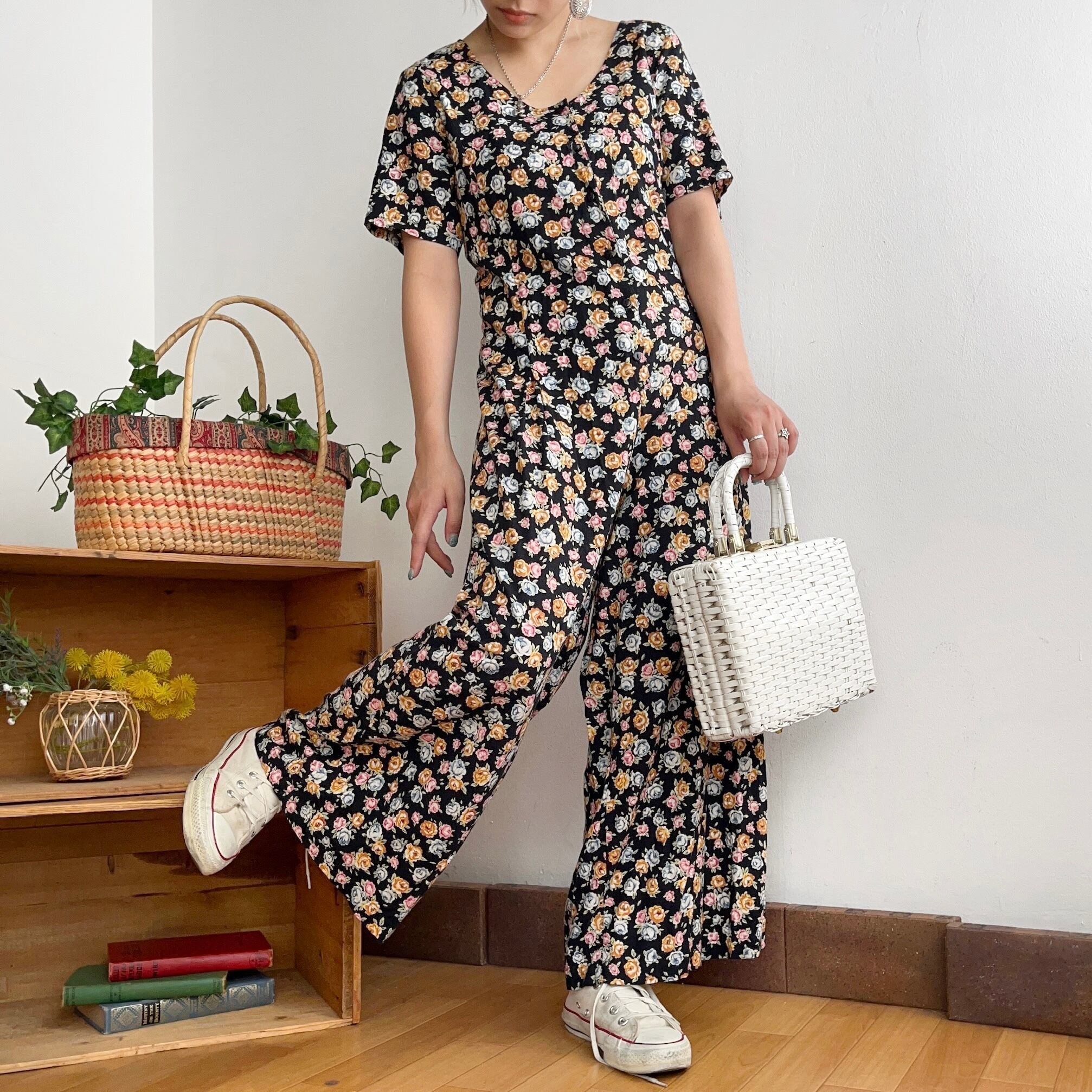 カラフルなお花柄がキュートなレーヨンオールインワンです。