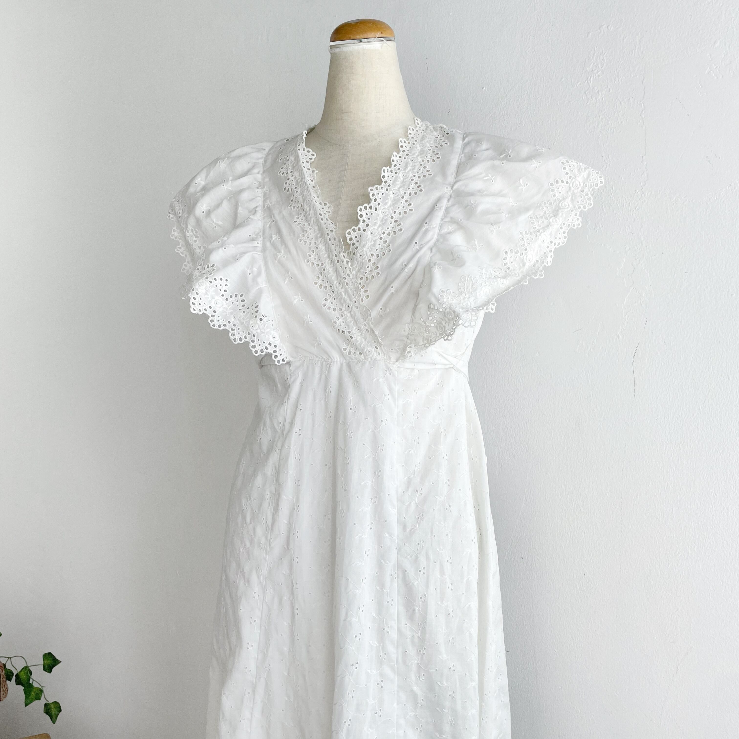 真っ白でシンプルなワンピースですがレース使いや胸元のボリューム等細部にこだわりの見える1着です。