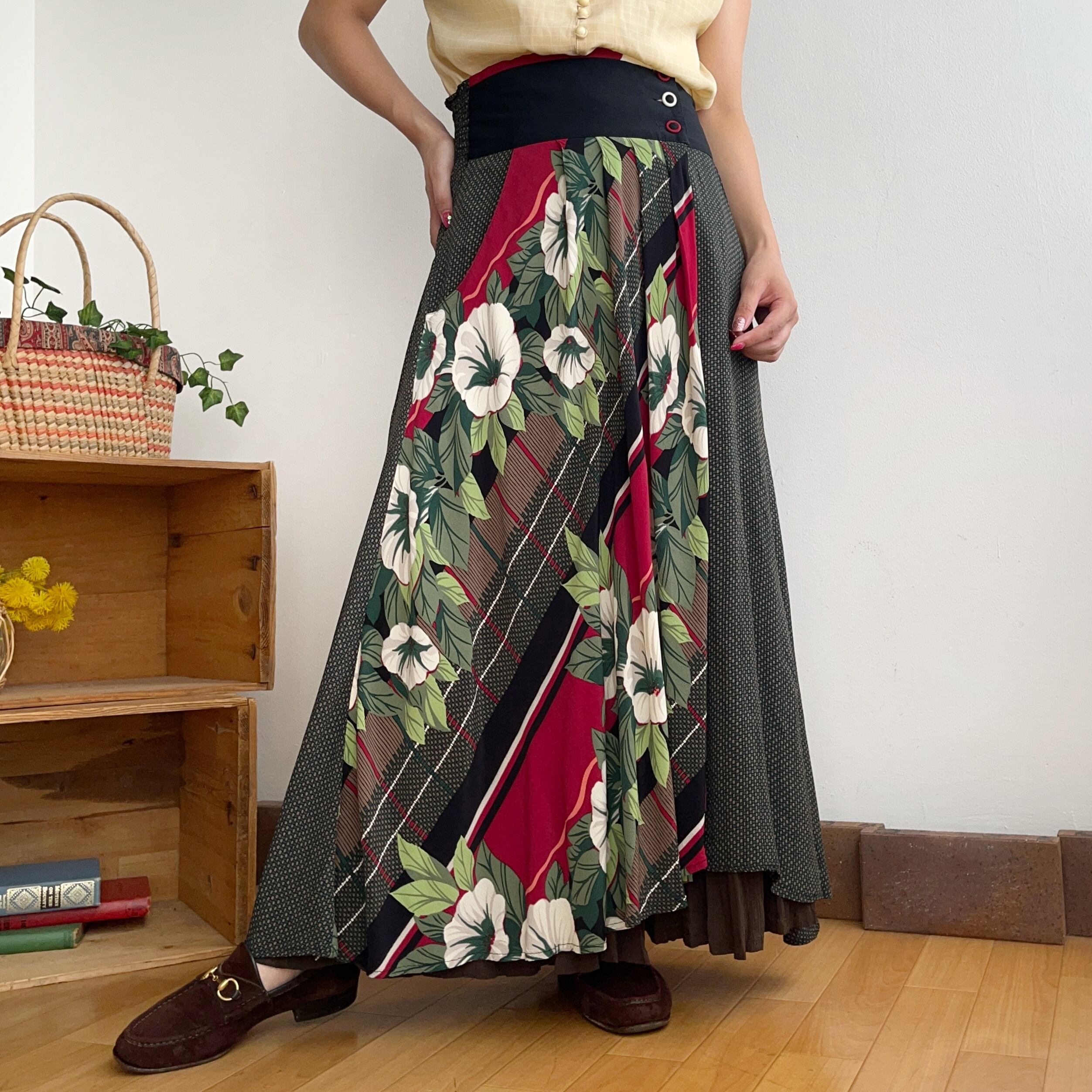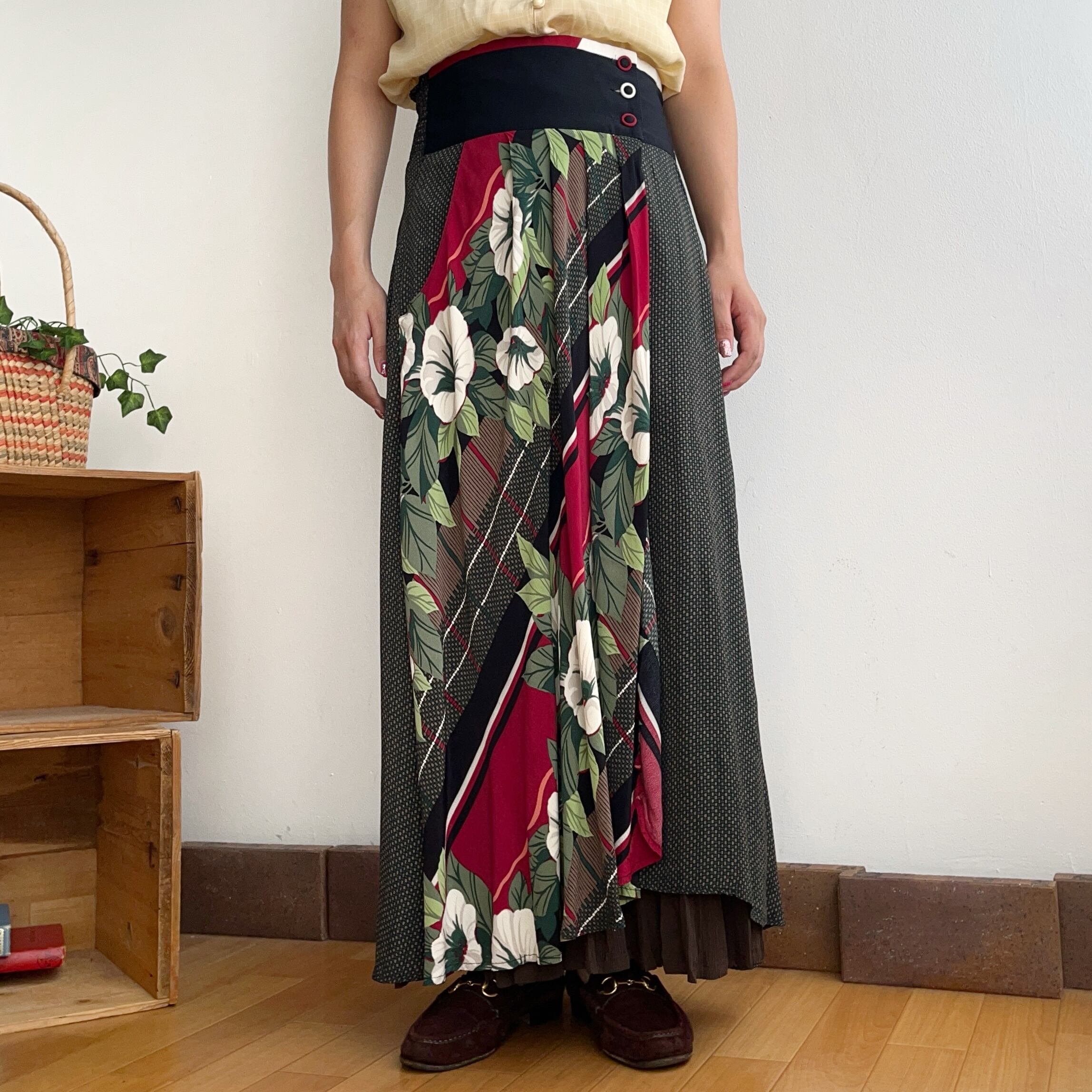 花柄と格子柄の切り替えが可愛いく、ウエストゴムのイージータイプなのでどんなボトムスとも合わせやすく着やすい一着。