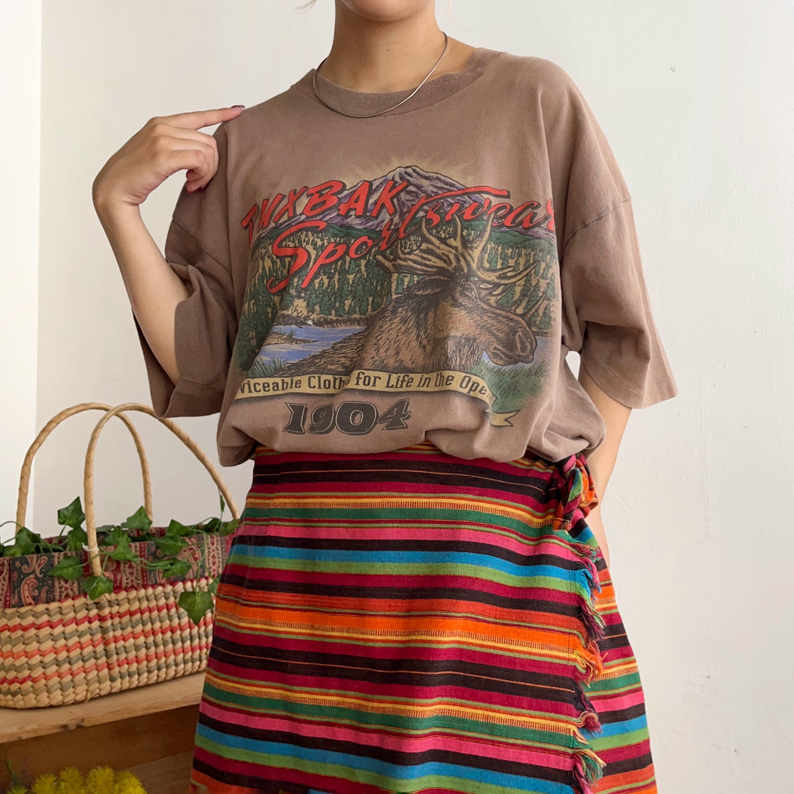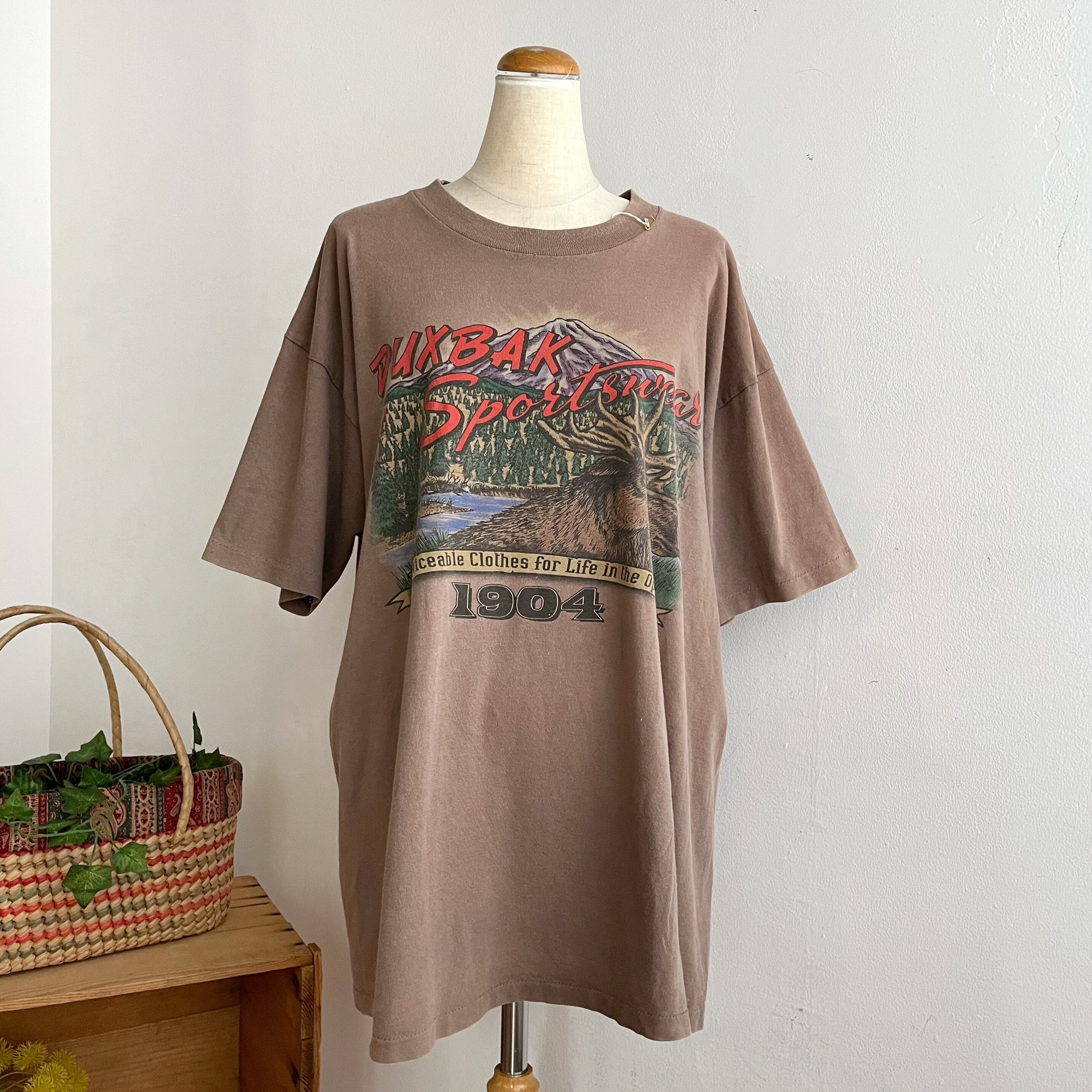 リアルタッチなヘラジカのプリントに、ボディはフェードしたブラウンカラーが古着らしさ満載です。ペンキ汚れなどもあり雰囲気たっぷりな一着。
