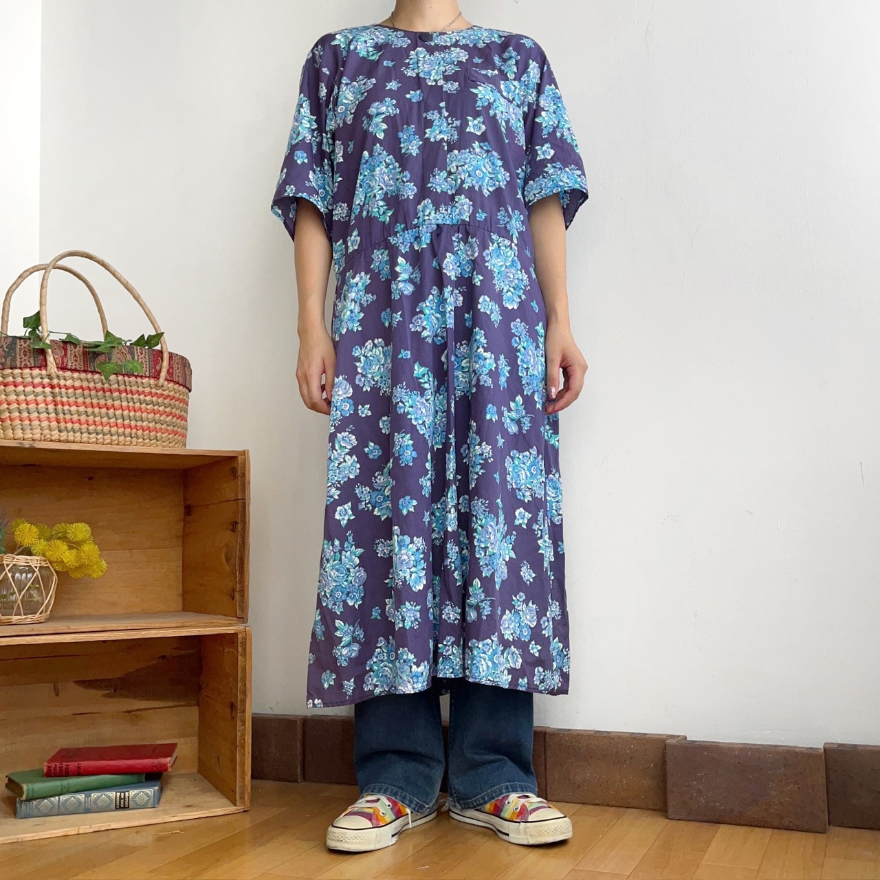 レトロなお花柄が可愛いノーカラーワンピースです。