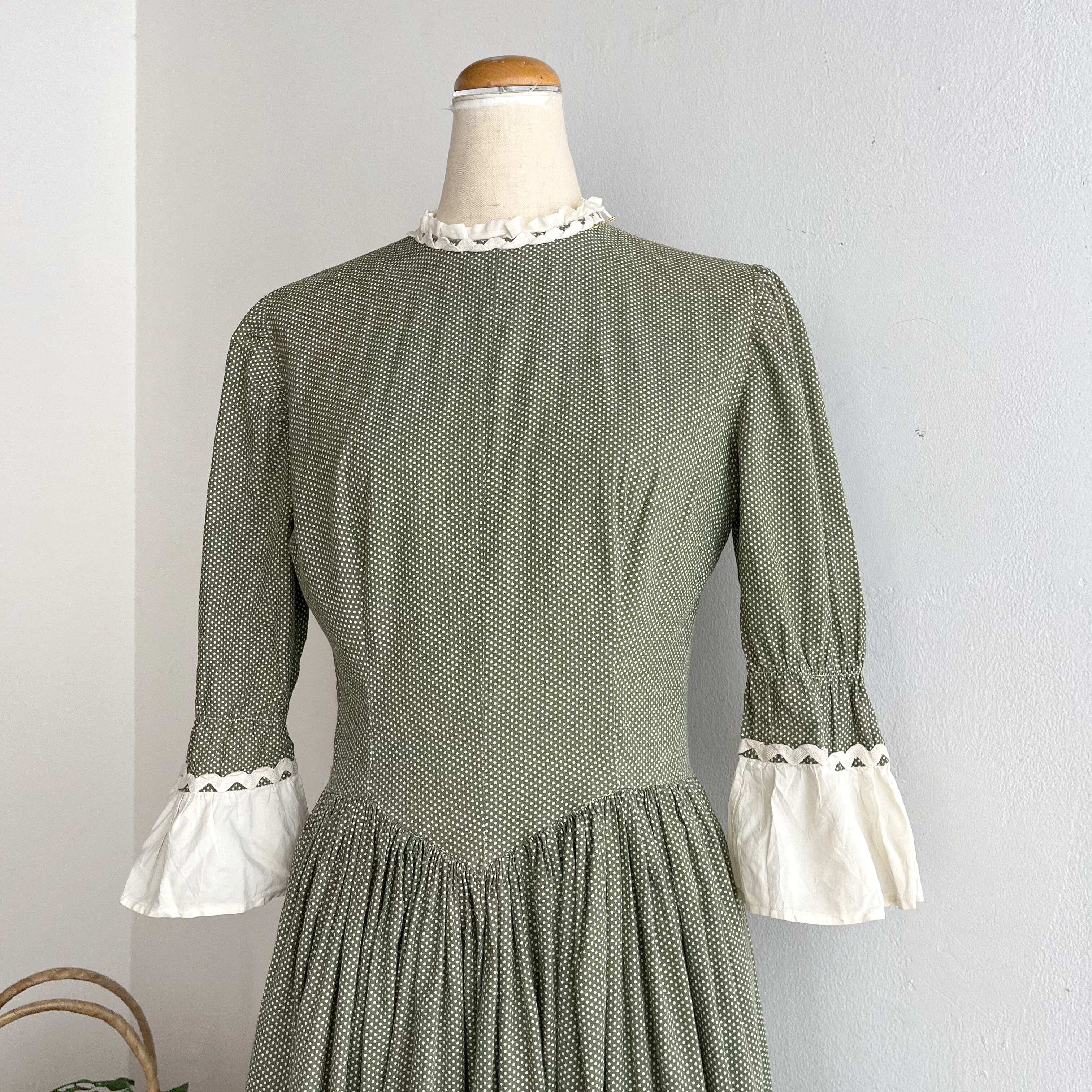淡いカーキのボディにピンドット柄がキュートなワンピースです。