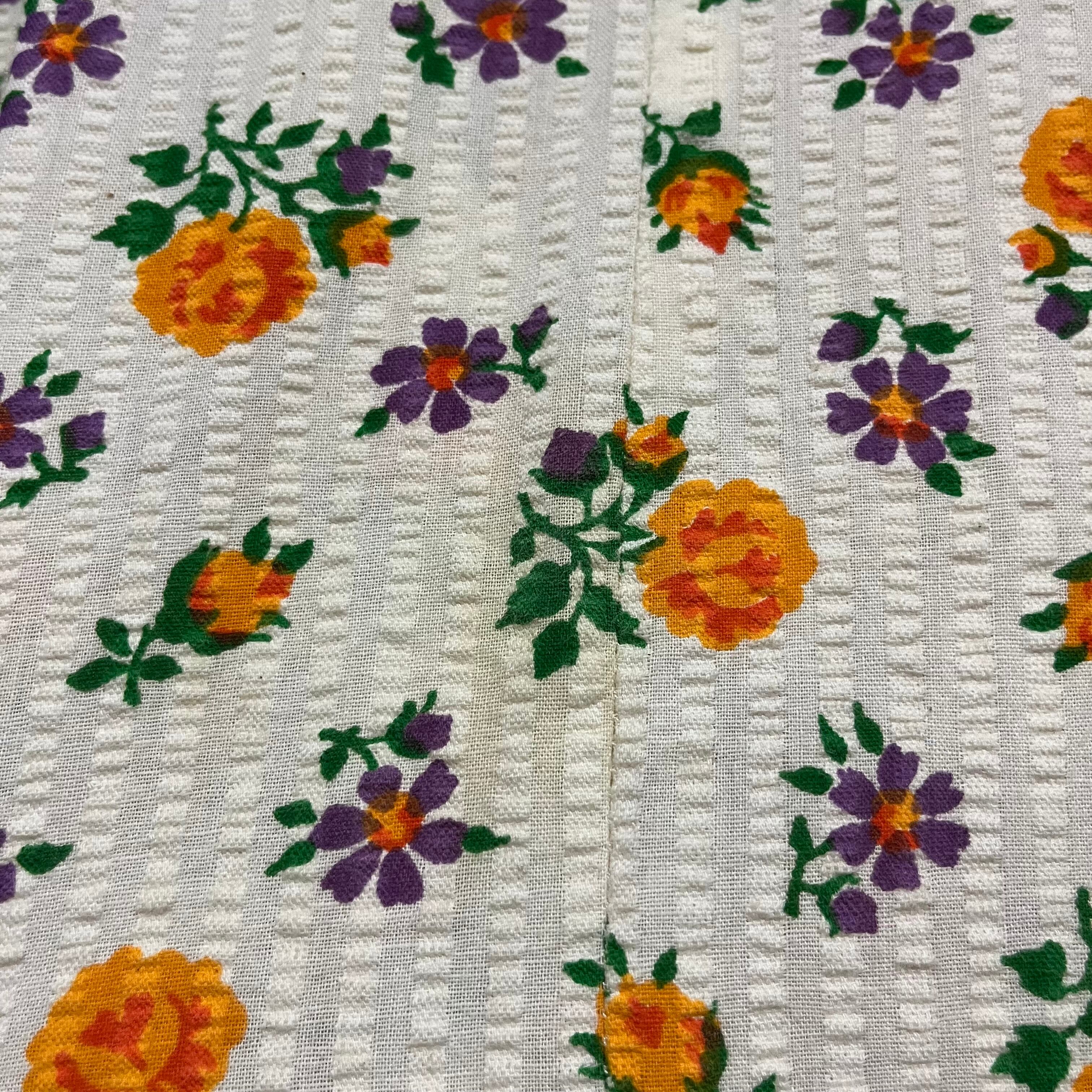 シアサッカーの様なポコポコとした質感の生地に、パープルとオレンジのお花が可愛い一着。