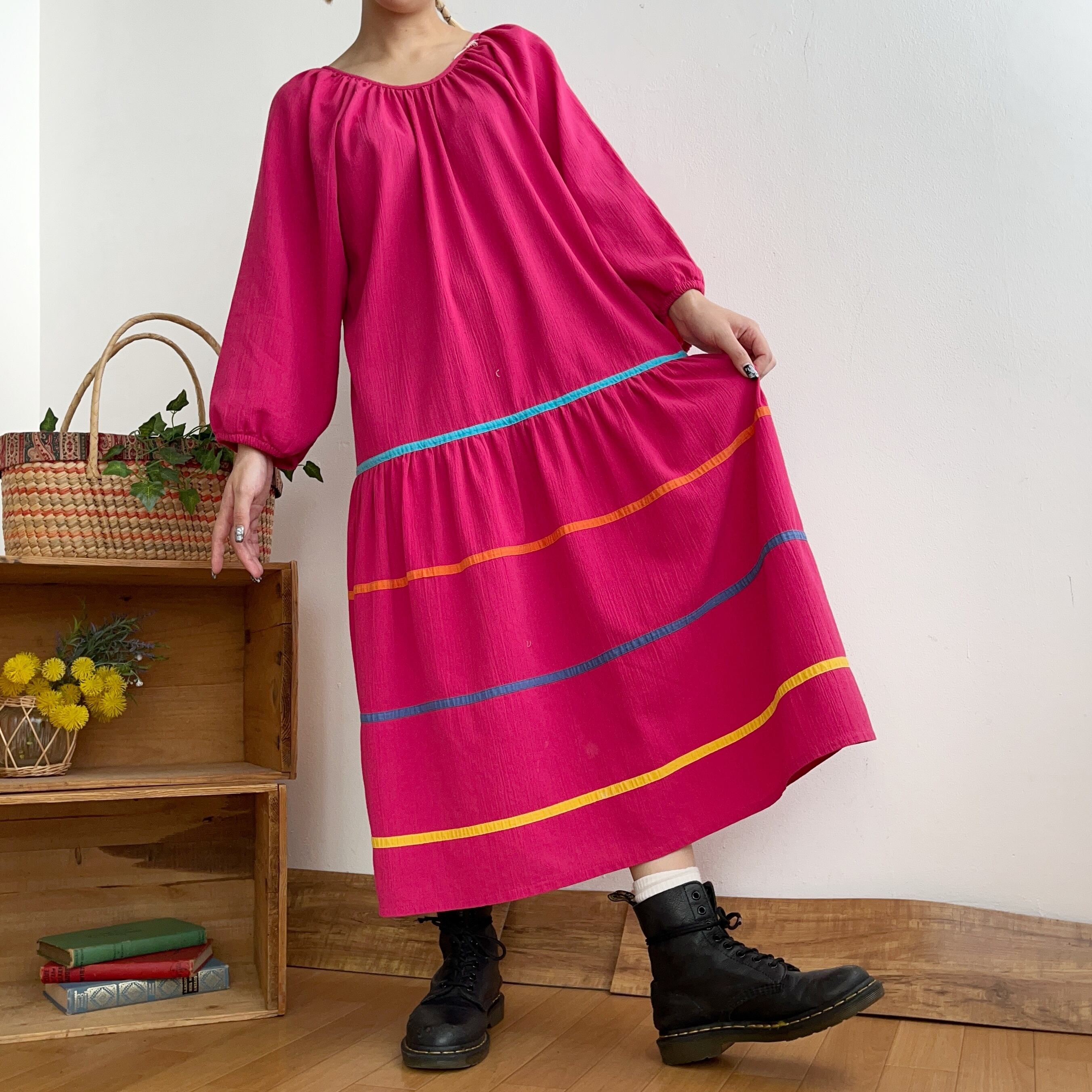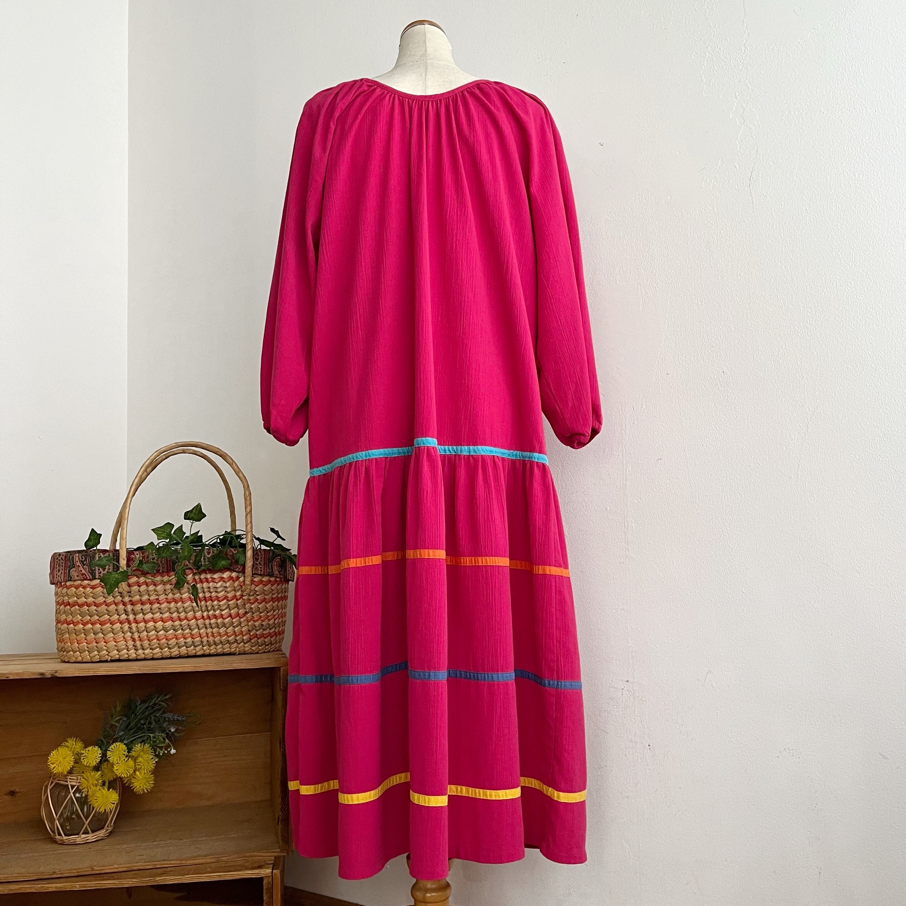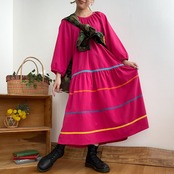 ビビットピンクのボディにカラフルなラインが可愛いコットンワンピースです。