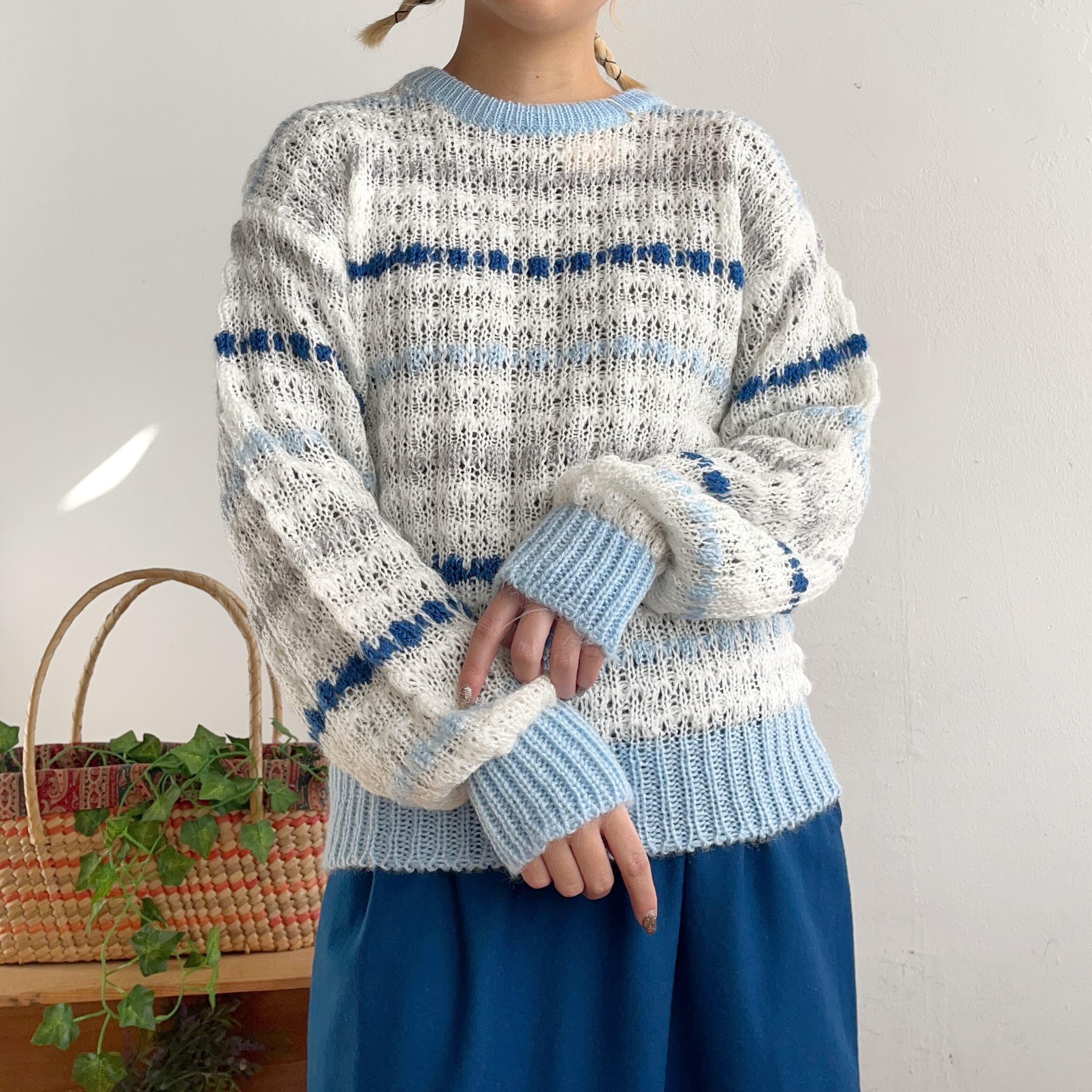 ブルー系のボーダー柄が可愛いアクリルニットセーターです。