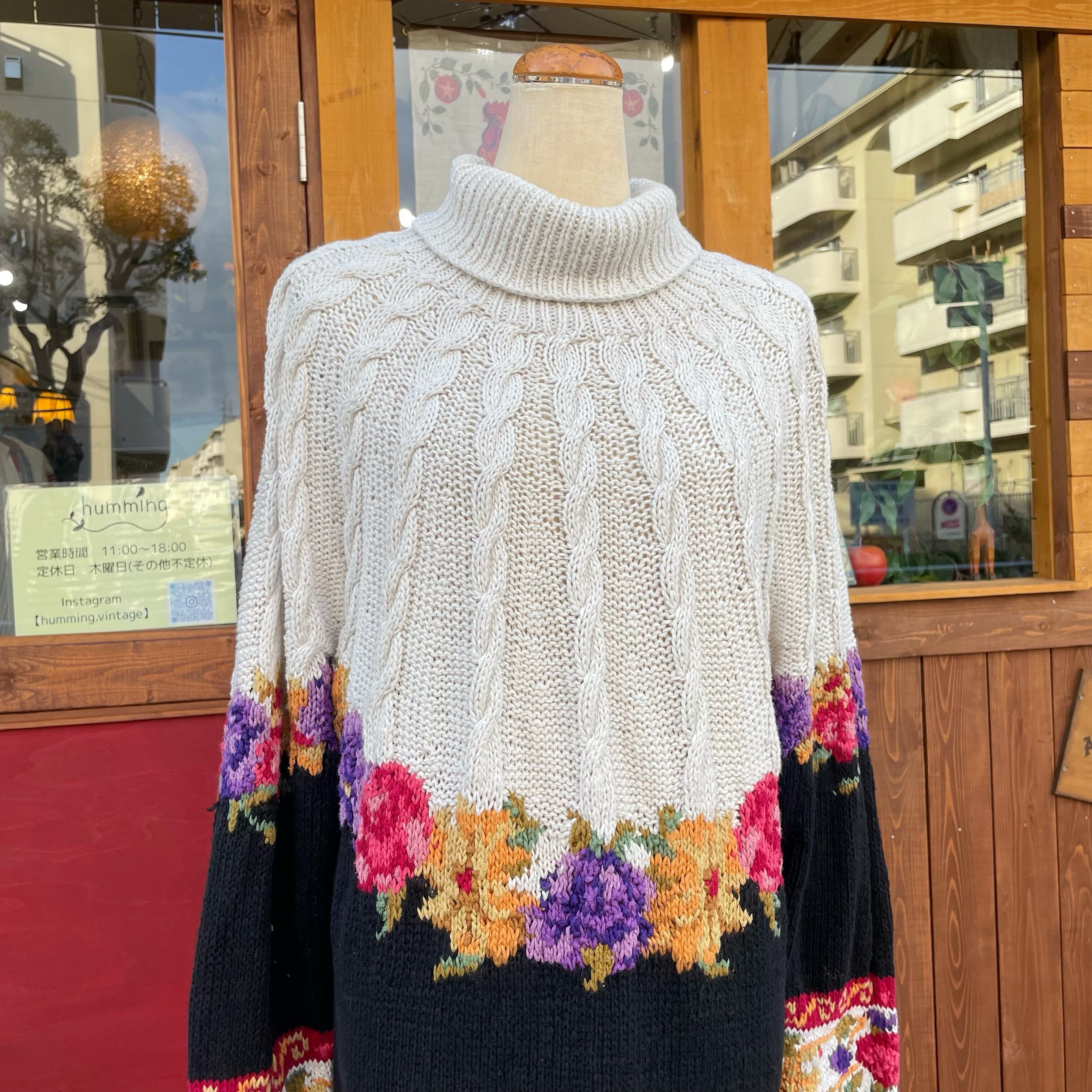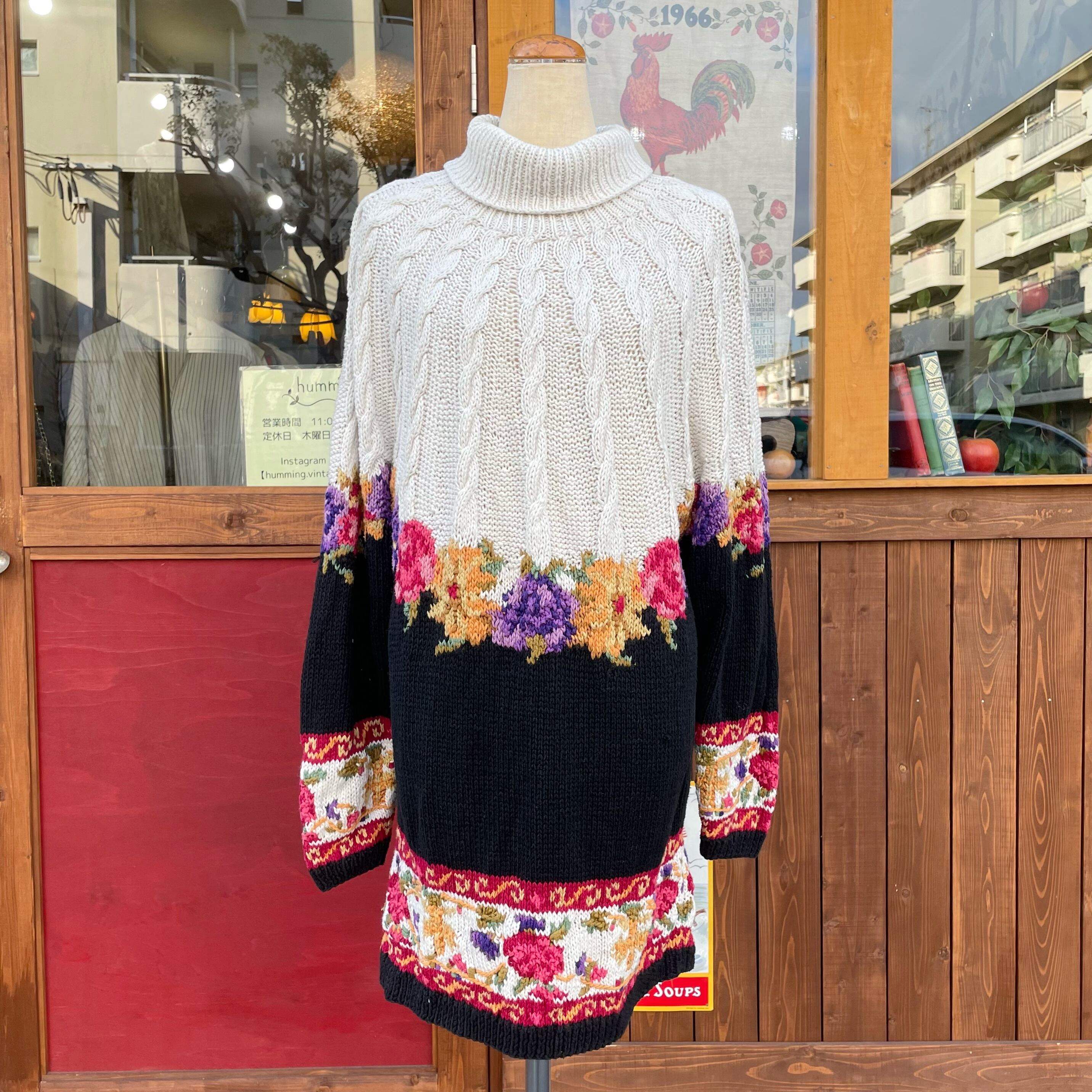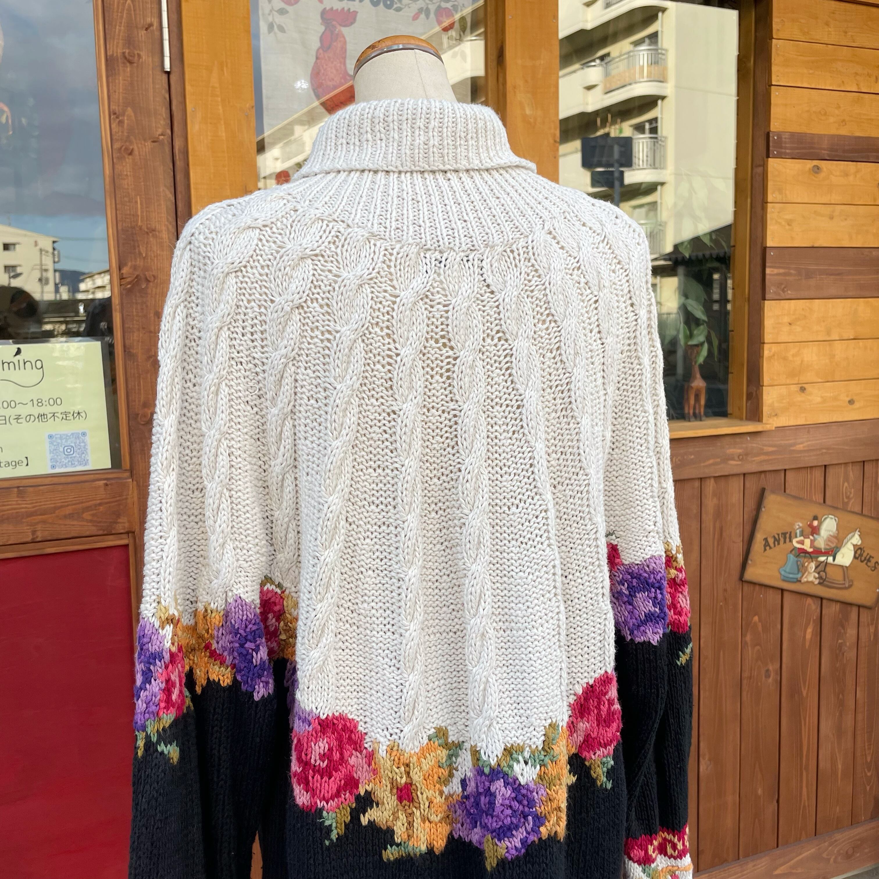 お花柄とケーブル編みが可愛いコットンニットセーターです。