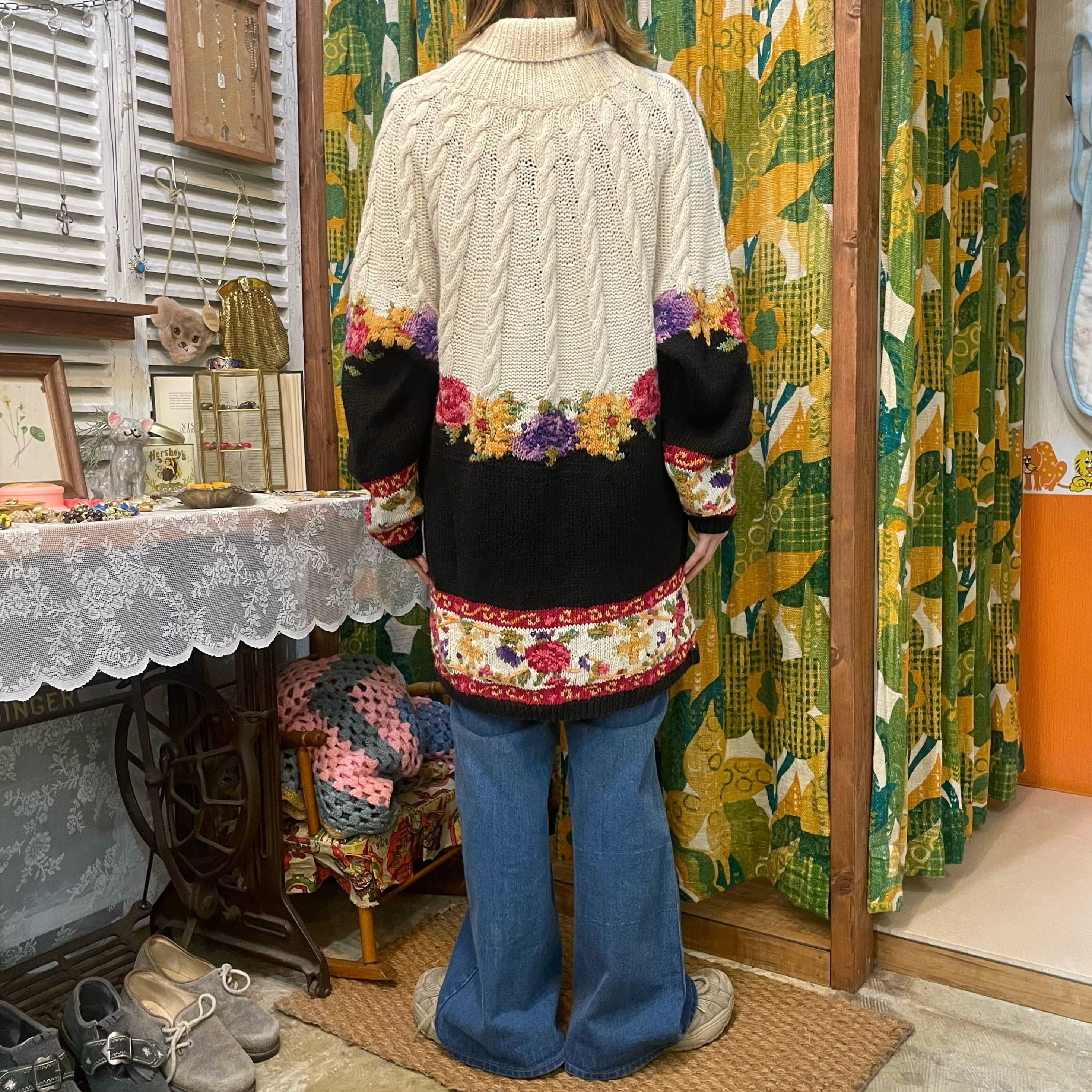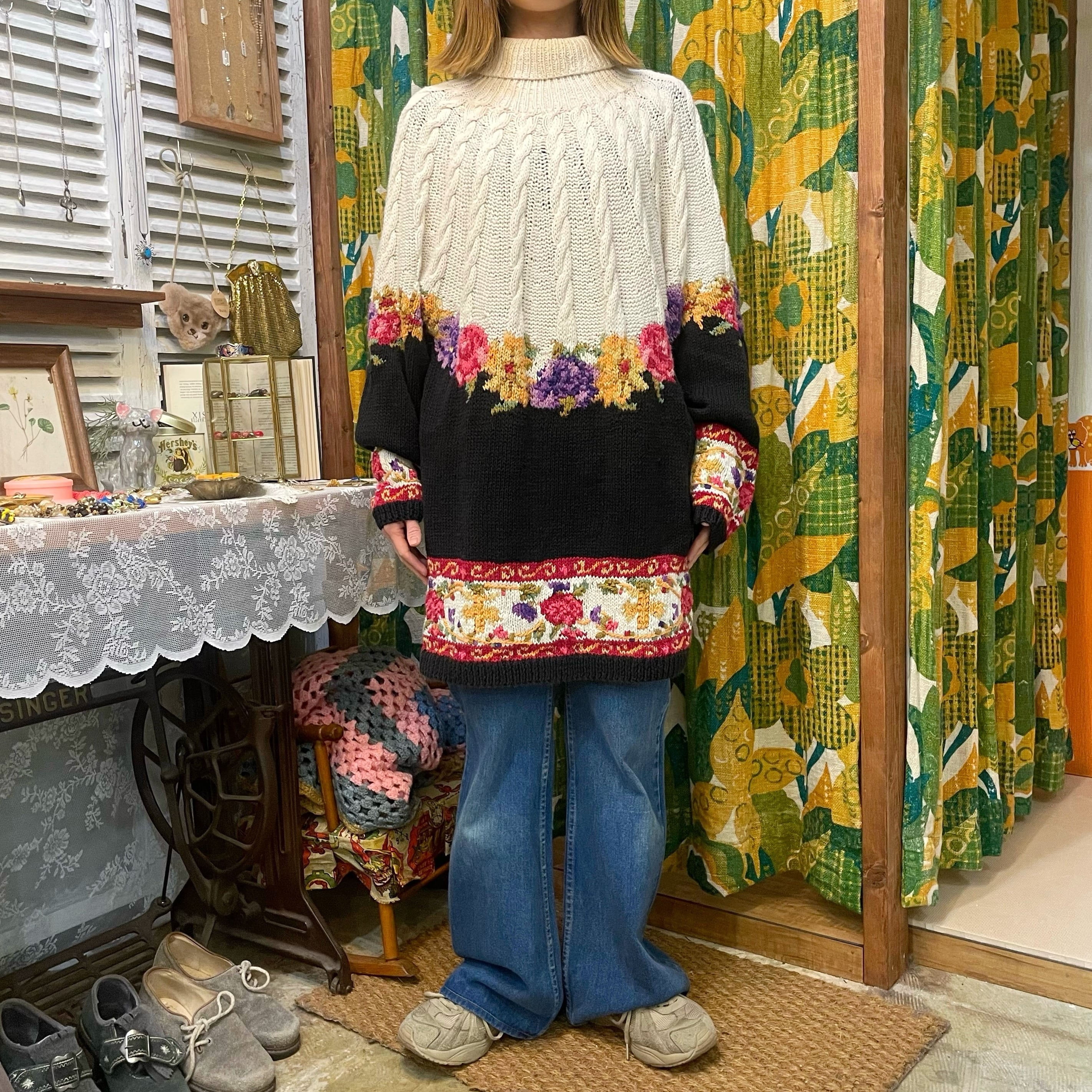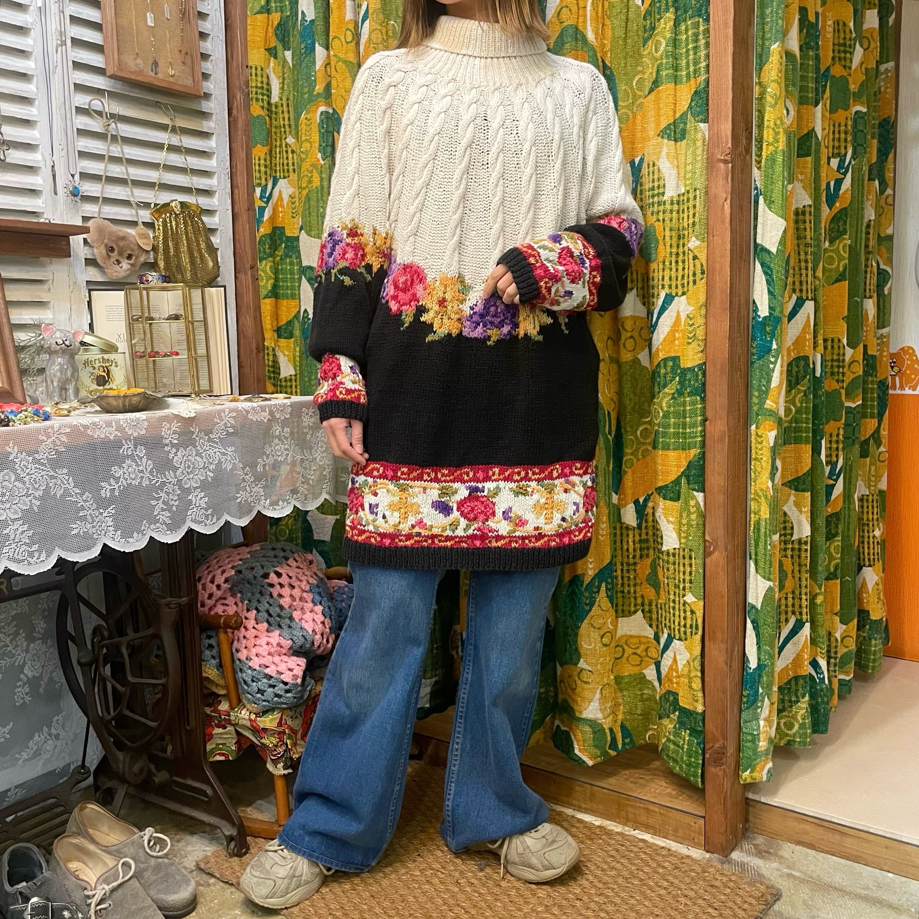 お花柄とケーブル編みが可愛いコットンニットセーターです。