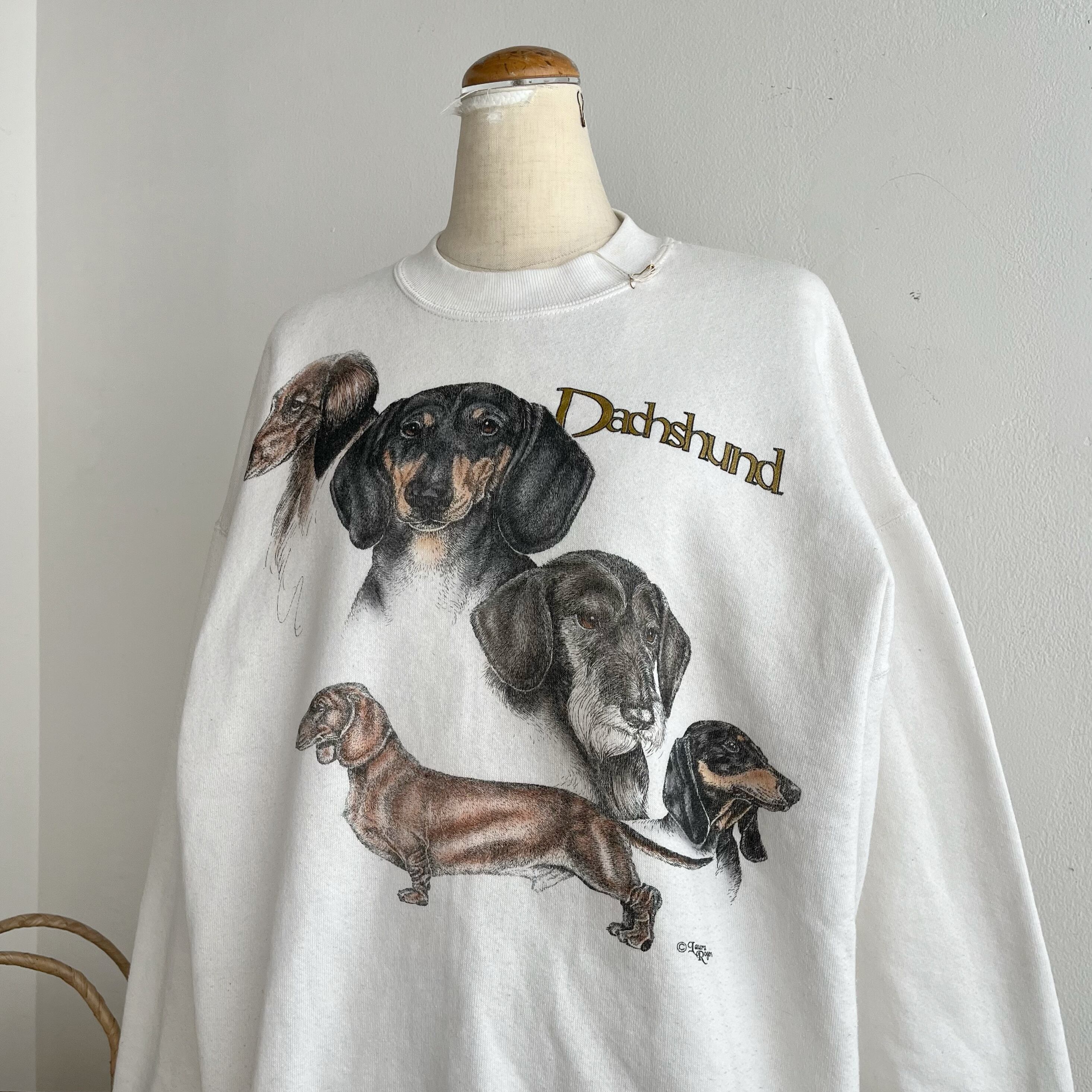 近年人気が上昇している、動物スウェットのダックスフンドモチーフのプリントスウェットです。