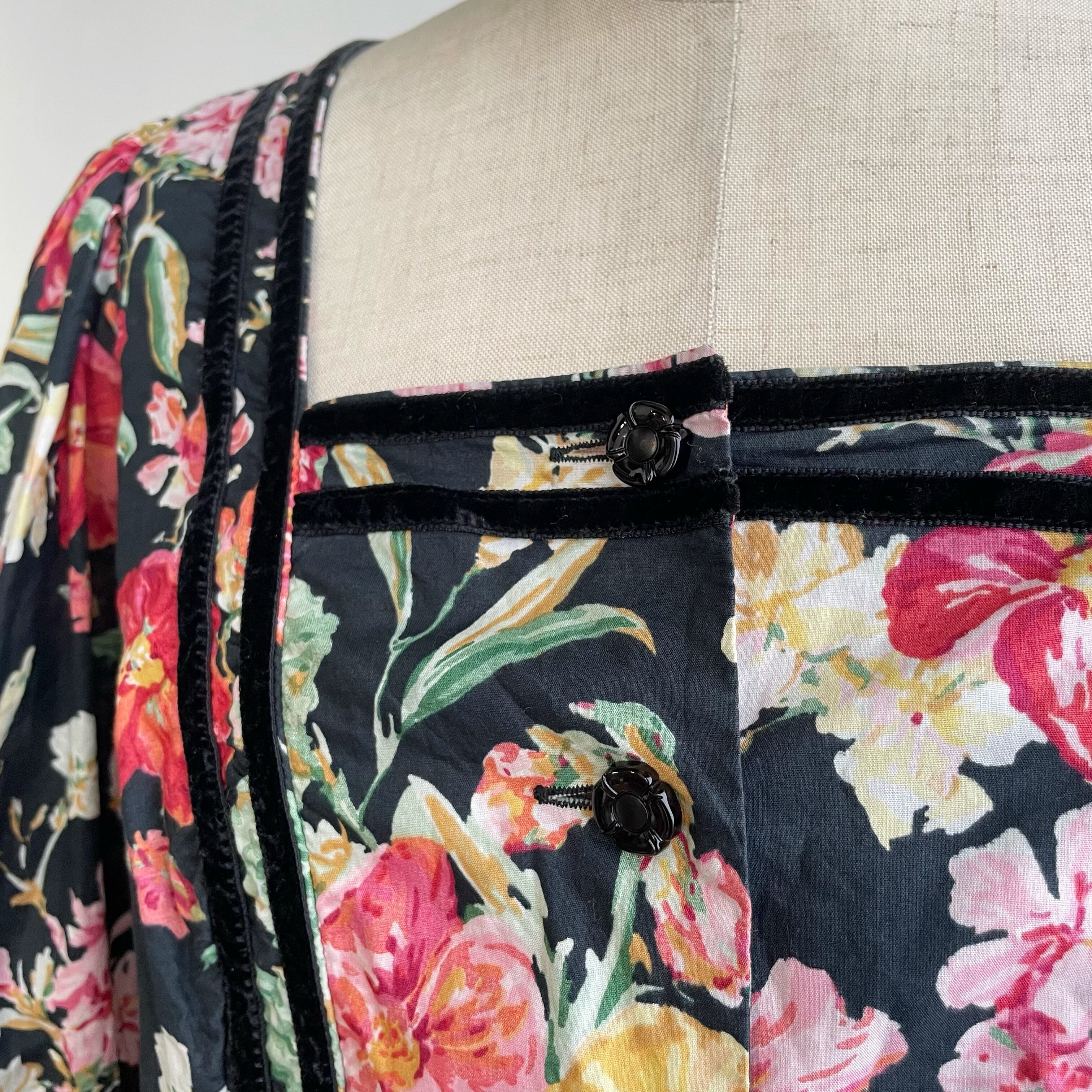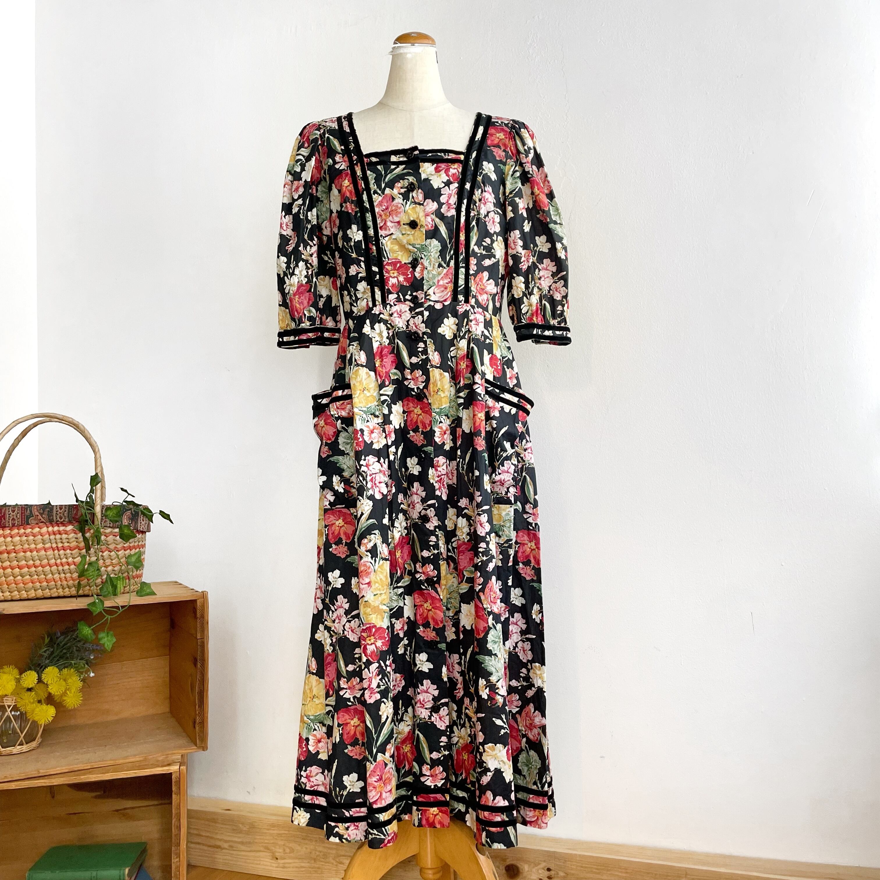 カラフルなお花柄に黒のベロアラインが入ったクラシカルなデザインのチロルワンピースです。