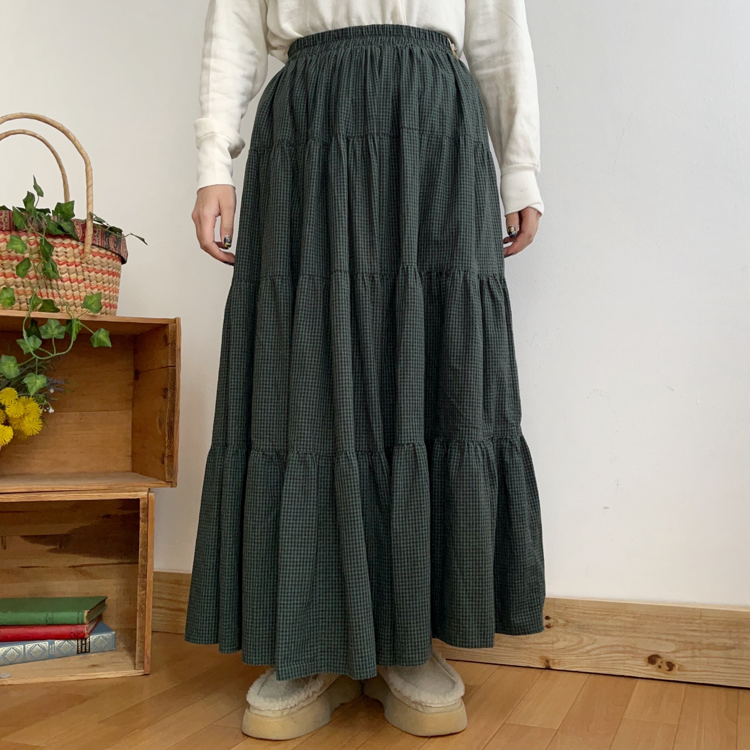 深みのあるグリーンのチェック柄ティアードスカートです。