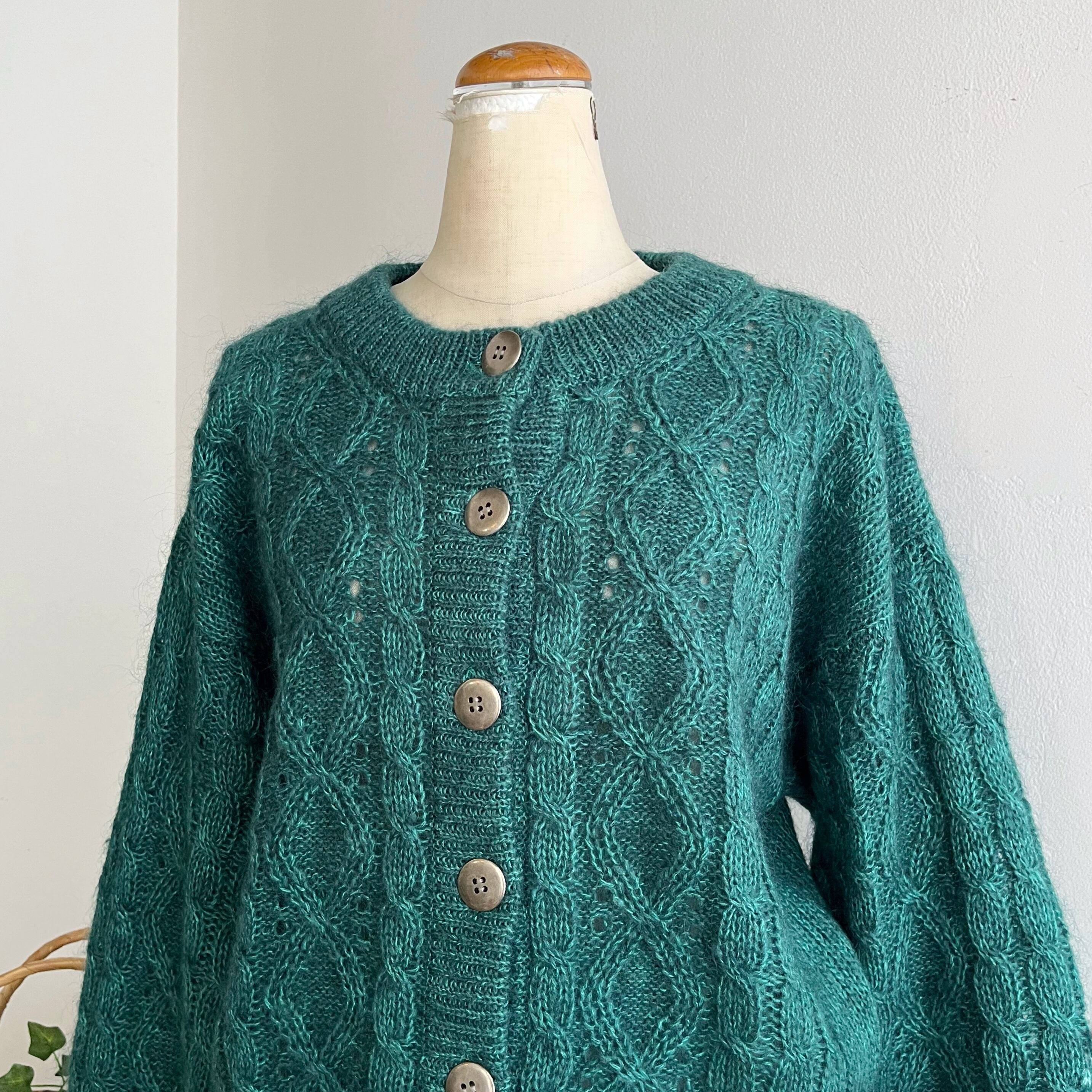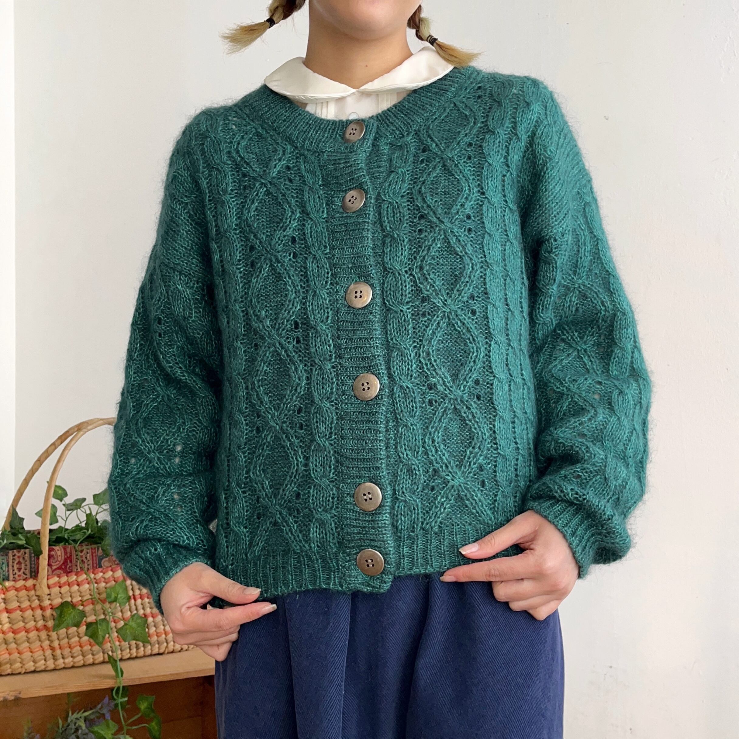濃いめのグリーンカラーに毛足長めのモヘアが可愛い一着。