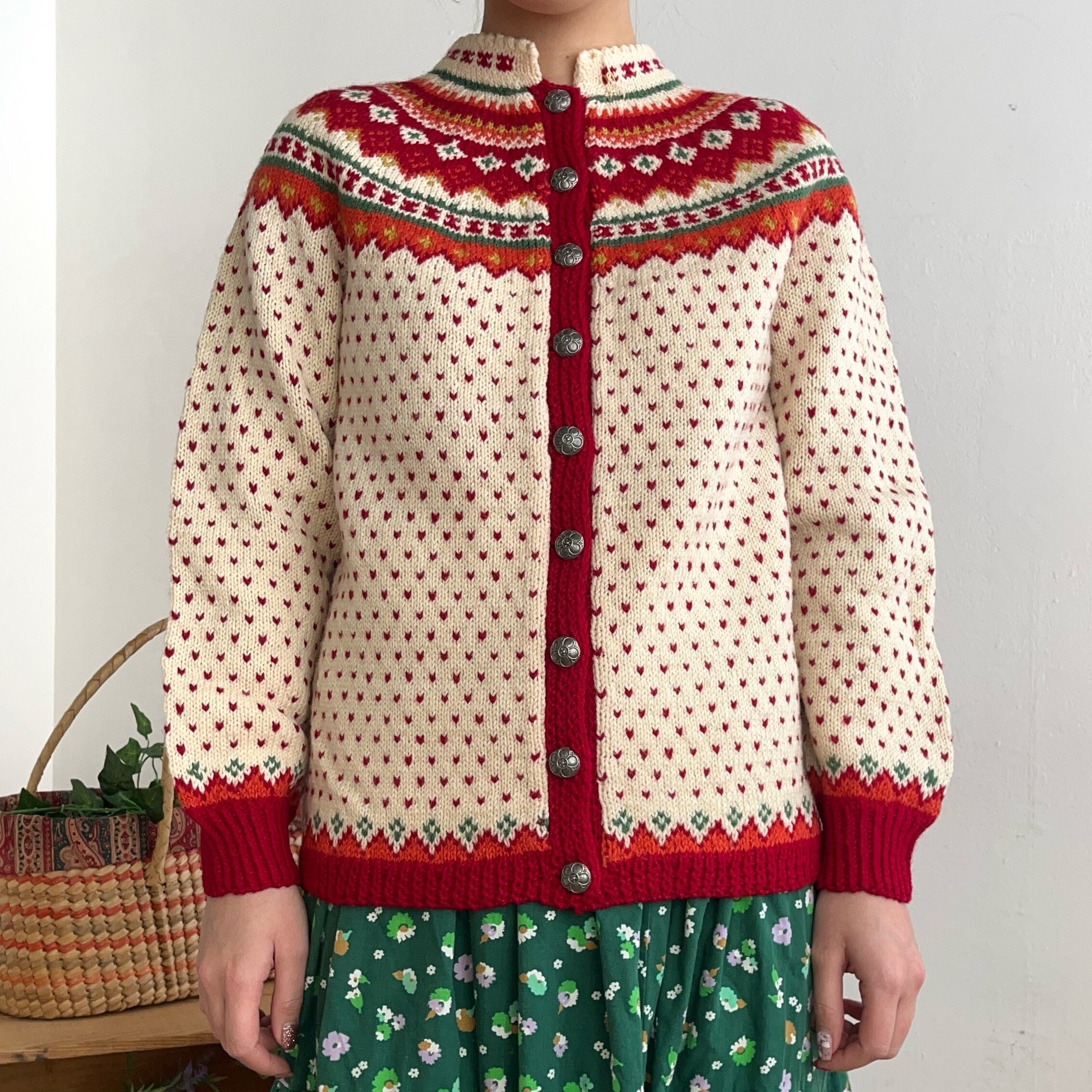 カラフルなデザインが可愛いヴィンテージのノルディックニットカーディガンです。